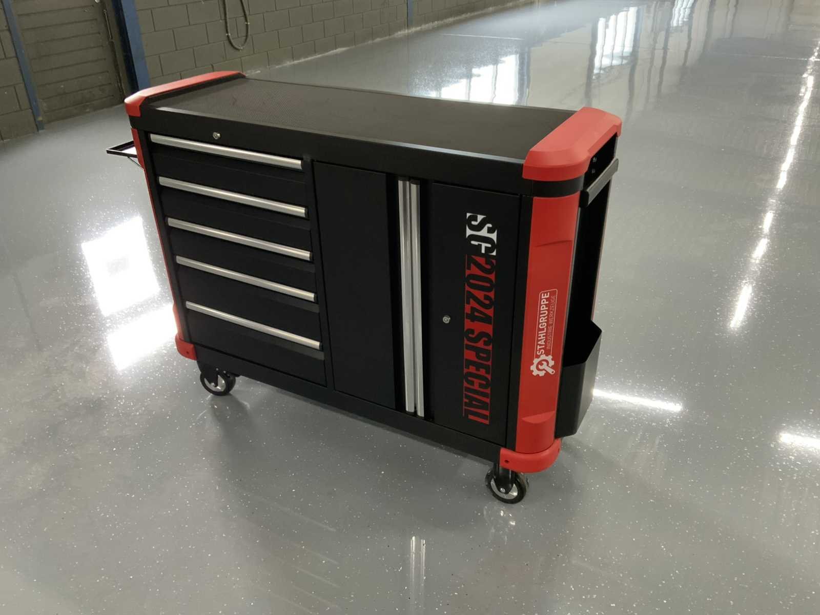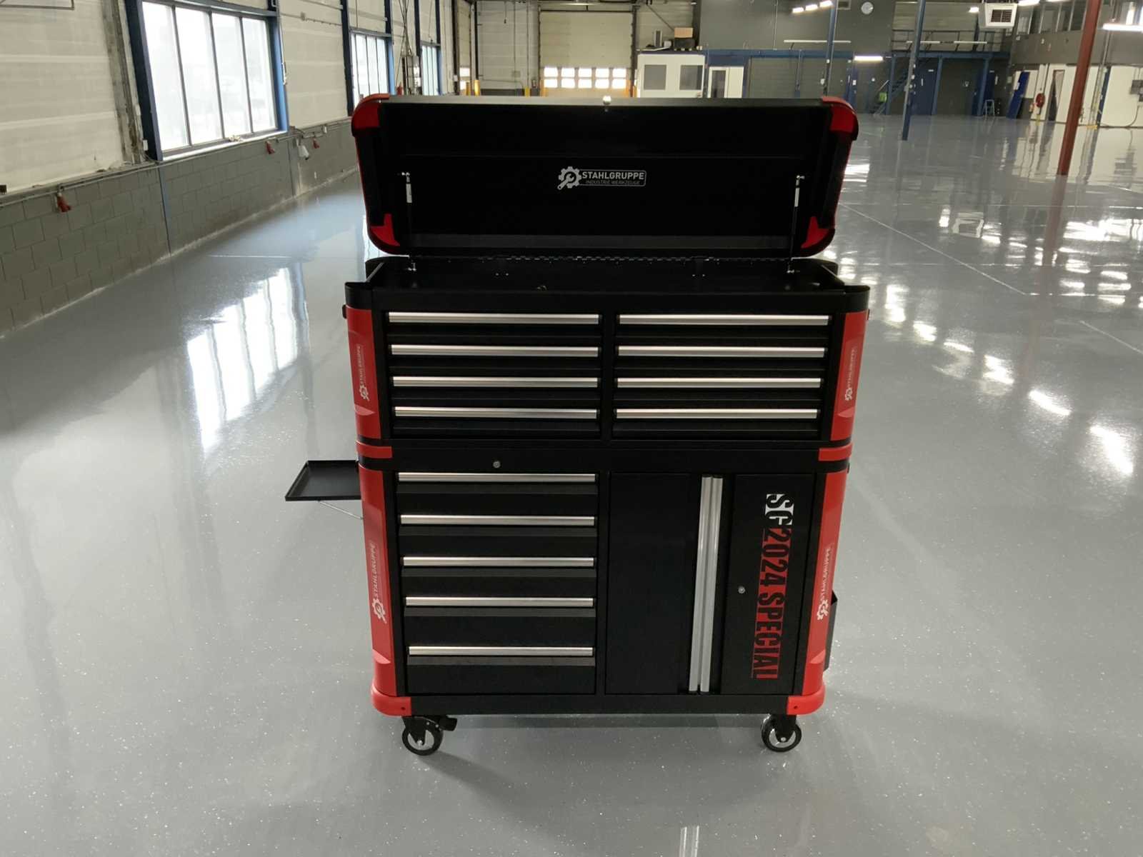 13 Laden, 9 gevuld, 327 pcs gereedschap. Kar met afneembare topbox Top box met 8 laden en boven klep Kar met 5 laden en kast met dubbele openslaande deuren Hoeken schuin afgewerkt met bumpers Stevig kunststof handvaten 2 zwenkwielen waarvan 2 geremd Hoge kwaliteit cilinder sloten Mat zwart afgewerkt met rode accenten Nee Merk: Stahlgruppe Type: XL PRO Deluxe Bouwjaar: 2025 Aantal laden: 13 Met inhoud: true