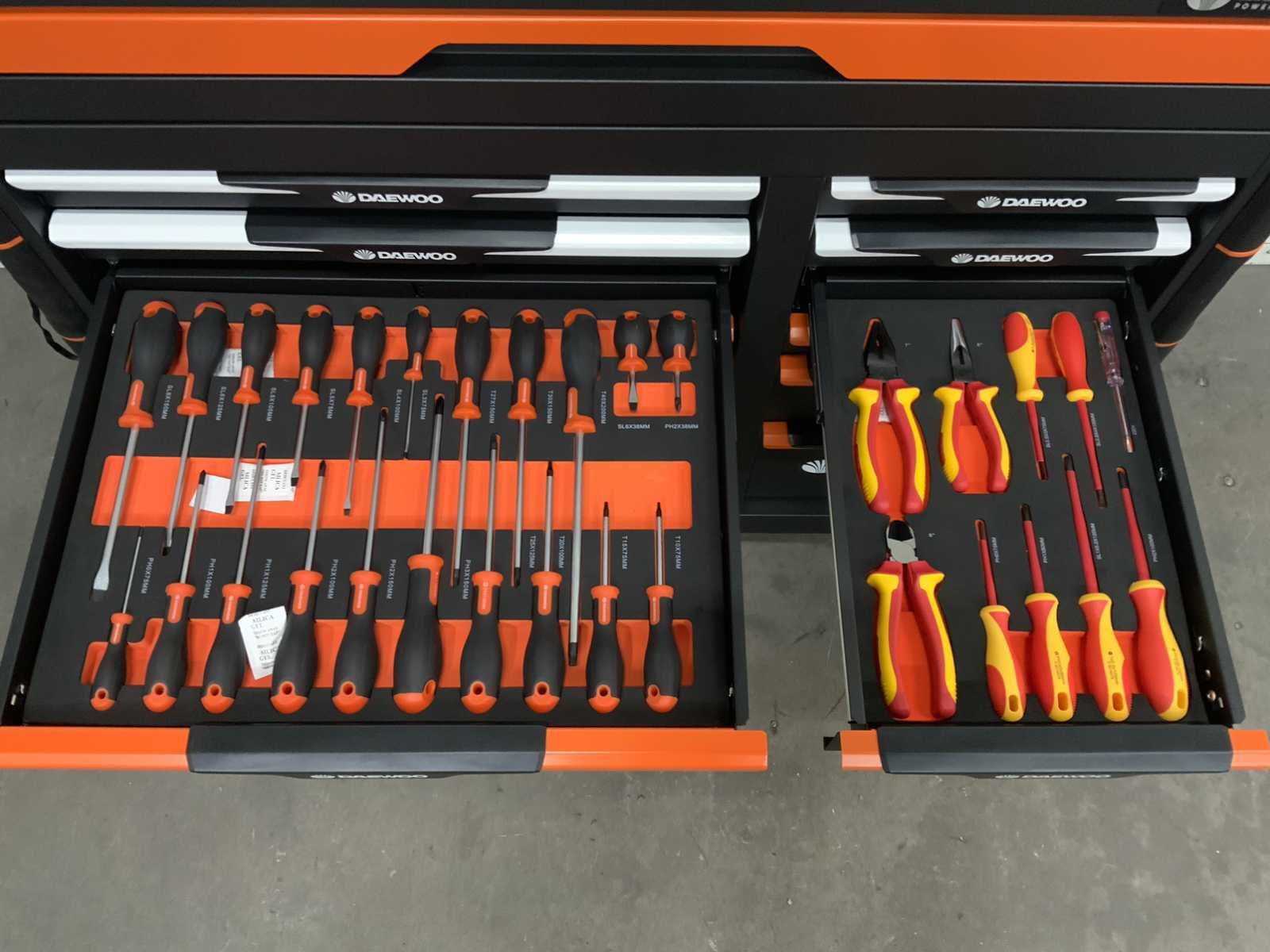 13 laden waarvan 11 gevuld, 267 pcs. Inclusief: set 4 in 1 accugereedschap: schroef-boormachine, haakse slijper met inlay 4 slijpschijven, slag moer machine, moerklopper, set boortjes, accu lader. Ongebruikt. Nee Merk: Daewoo Type: DAMWS267 + 4 in 1 set Bouwjaar: 2025 Aantal laden: 13 Met inhoud: true Totale afmeting L: 1060mm Totale afmeting Breedte: 570mm Totale afmeting Hoogte: 1100mm