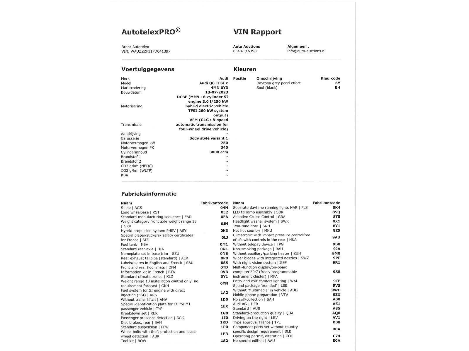 Franse kenteken papieren. Indien gewenst kunnen wij het gehele import proces voor u verzorgen, RDW invoer, BPM taxatie, Douane afwikkeling, stalling etc. Voor deze auto zijn de totale invoerkosten inclusief de BPM €1.195.- Dus voor €1.195.- boven op uw aankoopprijs verzorgen wij het NL kenteken voor u. (This option is only for Dutch buyers) Voor vragen kunt u mailen naar info@auto-auctions.nl No Kenteken: Franse Kenteken Papieren Merk: Audi Model: Q8 Type: 55 TFSI e Quattro S-Line Afgelezen kilometerstand: 111091km Cilinderinhoud: 2967cc Vermogen (kW): 280kW Brandstof: Hybride Benzine Chassisnummer: WAUZZZF11PD041397 Datum eerste toelating: 29-07-2023 Vermogen (pk): 380hp Aandrijving: Vierwielaandrijving Aantal zitplaatsen: 5 Kleur: Daytona Grey Pearl Effect Transmissie: Automaat Aantal deuren: 5 Aantal sleutels: 2 Velgmaat: 20 Aantal cilinders: 6 Carrosserie: SUV Nationaliteit documenten: Franse Kenteken Papieren Onderhoudshistorie: Digitaal volledig aanwezig Start en rijdt: Ja oplaadkabel : Aanwezig Luchtvering: true Vierwielaandrijving 4x4: true