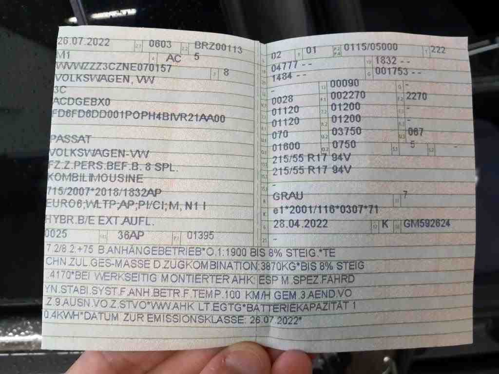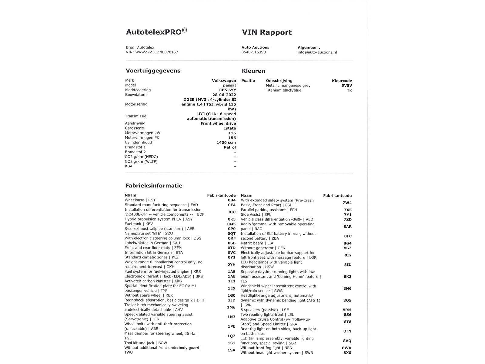 Duitse kenteken papieren. Indien gewenst kunnen wij het gehele import proces voor u verzorgen, RDW invoer, BPM taxatie, Douane afwikkeling, stalling etc. Voor deze auto zijn de totale invoerkosten inclusief de BPM €1.195.- Dus voor €1.195.- boven op uw aankoopprijs verzorgen wij het NL kenteken voor u. (This option is only for Dutch buyers) Voor vragen kunt u mailen naar info@auto-auctions.nl No Kenteken: Duitse kenteken papieren Merk: Volkswagen Model: Passat Type: Variant GTE 1.4 TSI PHEV Afgelezen kilometerstand: 153134km Cilinderinhoud: 1395cc Vermogen (kW): 160kW Brandstof: Hybride Benzine Chassisnummer: WVWZZZ3CZNE070157 Datum eerste toelating: 26-7-2022 Vermogen (pk): 218hp Aantal zitplaatsen: 5 Kleur: Manganese Gray Metallic Transmissie: Automaat Aantal deuren: 5 Aantal sleutels: 2 Velgmaat: 17 Aantal cilinders: 4 Carrosserie: Stationwagen Nationaliteit documenten: Duitse kenteken papieren Onderhoudshistorie: Digitaal volledig aanwezig Start en rijdt: Ja oplaadkabel : Aanwezig