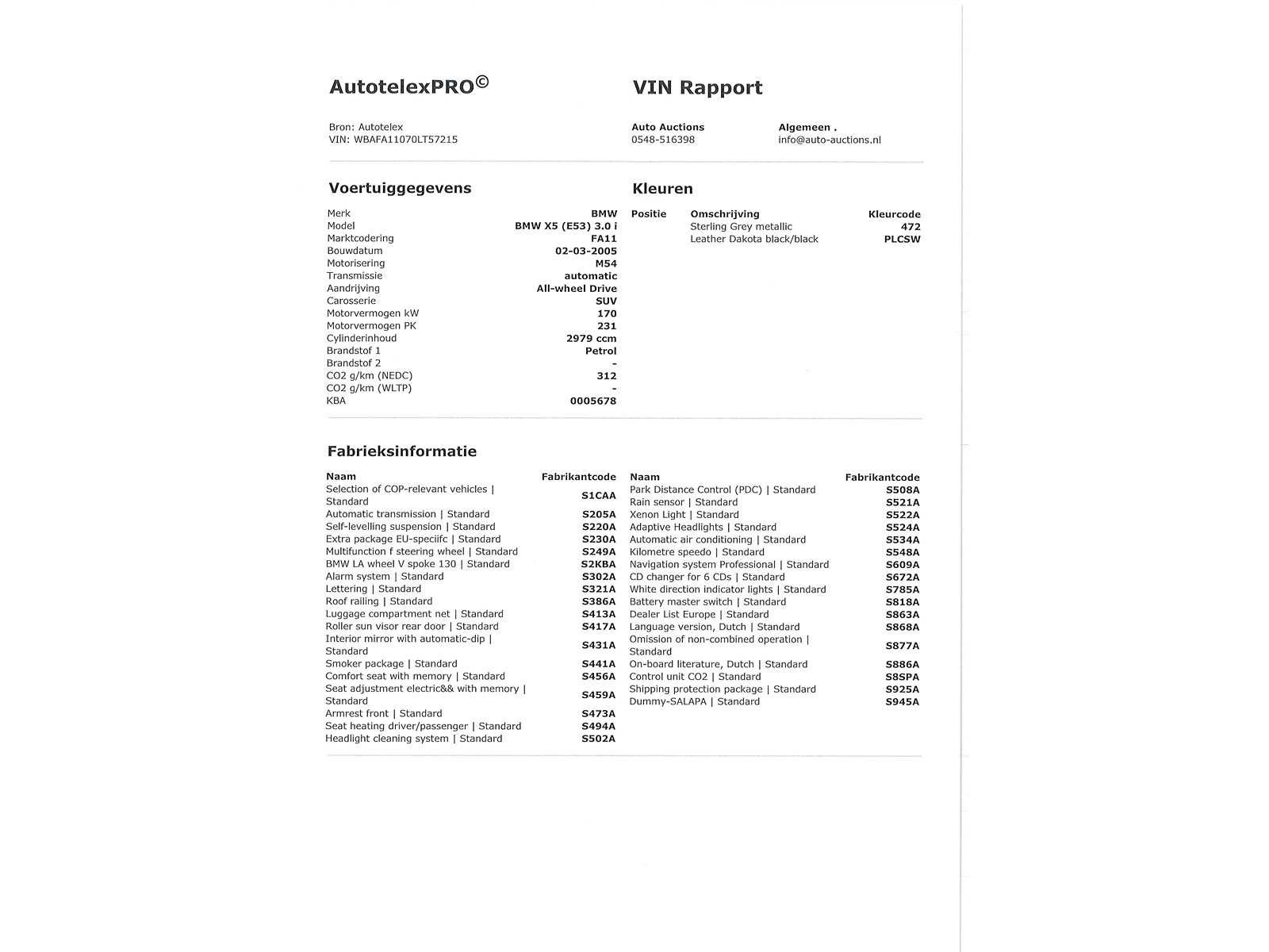 Voor vragen kunt u mailen naar info@auto-auctions.nl No Kenteken: 27-RJ-DB Merk: BMW Model: X5 Type: 3.0i Afgelezen kilometerstand: 452724km Cilinderinhoud: 2979cc Vermogen (kW): 170kW Brandstof: LPG Chassisnummer: WBAFA11070LT57215 NAP status: Logisch Datum eerste toelating: 2005-04-14 Datum eerste toelating (NL): 2005-04-14 APK vervaldatum: 2026-05-05 Vermogen (pk): 227hp Aantal zitplaatsen: 5 Kleur: grijs Transmissie: Automaat Gasinstallatie: true Emissieklasse: 3 Aantal deuren: 4 Aantal sleutels: 2 Ledig gewicht: 2077kg Bruto BPM (NL): 20988€ Aantal cilinders: 6 Carrosserie: stationwagen Onderhoudshistorie: Gedeeltelijk Aanwezig Carfax Link: https://was.carfax.eu/v0/api/ccdid/5100016408/svc/201/vinreg/27RJDB/checksum/eyJhbGciOiJIUzI1NiIsInR5cCI6IkpXVCJ9.eyJleHAiOjE3Njc0NTQ4Nzd9.rXp-0qgh4qHRlJs5_wmyO9uyUlypYFGM1adBjsGF2OY Start en rijdt: Ja
