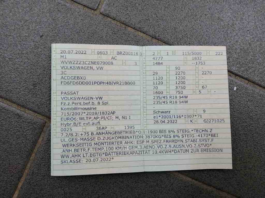 Duitse kenteken papieren. Indien gewenst kunnen wij het gehele import proces voor u verzorgen, RDW invoer, BPM taxatie, Douane afwikkeling, stalling etc. Voor deze auto zijn de totale invoerkosten inclusief de BPM €1.195.- Dus voor €1.195.- boven op uw aankoopprijs verzorgen wij het NL kenteken voor u. (This option is only for Dutch buyers) Voor vragen kunt u mailen naar info@auto-auctions.nl No Kenteken: Duitse kenteken papieren Merk: Volkswagen Model: Passat Type: Variant GTE 1.4 TSI PHEV Afgelezen kilometerstand: 116035km Cilinderinhoud: 1395cc Vermogen (kW): 160kW Brandstof: Hybride Benzine Chassisnummer: WVWZZZ3CZNE079008 Datum eerste toelating: 20-07-2022 Vermogen (pk): 218hp Aantal zitplaatsen: 5 Kleur: Deep Black Pearl Effect Transmissie: Automaat Aantal deuren: 5 Aantal sleutels: 2 Aantal cilinders: 4 Carrosserie: Stationwagen Nationaliteit documenten: Duitse kenteken papieren Onderhoudshistorie: Digitaal volledig aanwezig Start en rijdt: Ja oplaadkabel : Aanwezig