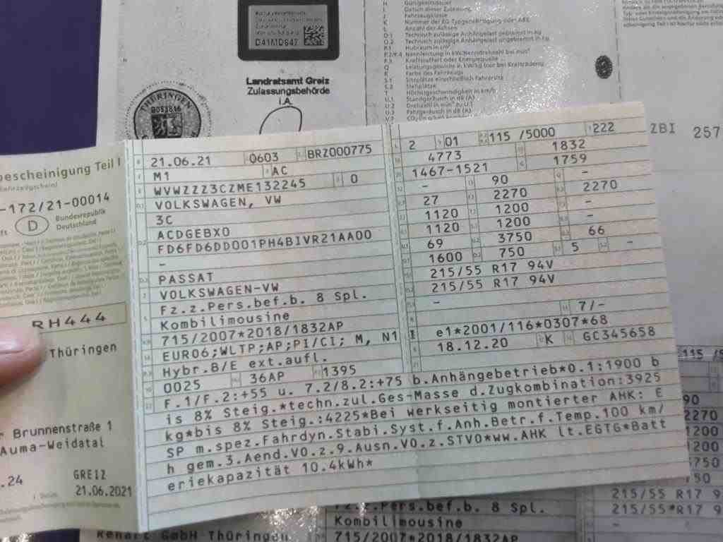 Duitse kenteken papieren. Indien gewenst kunnen wij het gehele import proces voor u verzorgen, RDW invoer, BPM taxatie, Douane afwikkeling, stalling etc. Voor deze auto zijn de totale invoerkosten inclusief de BPM €1.195.- Dus voor €1.195.- boven op uw aankoopprijs verzorgen wij het NL kenteken voor u. (This option is only for Dutch buyers) Voor vragen kunt u mailen naar info@auto-auctions.nl No Kenteken: Duitse kenteken papieren Merk: Volkswagen Model: Passat Type: Variant GTE 1.4 TSI PHEV Afgelezen kilometerstand: 162608km Cilinderinhoud: 1395cc Vermogen (kW): 160kW Brandstof: Hybride Benzine Chassisnummer: WVWZZZ3CZME132245 Datum eerste toelating: 21-06-2021 Vermogen (pk): 218hp Aantal zitplaatsen: 5 Kleur: Urano Grey Transmissie: Automaat Aantal deuren: 5 Aantal sleutels: 2 Aantal cilinders: 4 Carrosserie: Stationwagen Nationaliteit documenten: Duitse kenteken papieren Onderhoudshistorie: Digitaal volledig aanwezig Start en rijdt: Ja oplaadkabel : Aanwezig