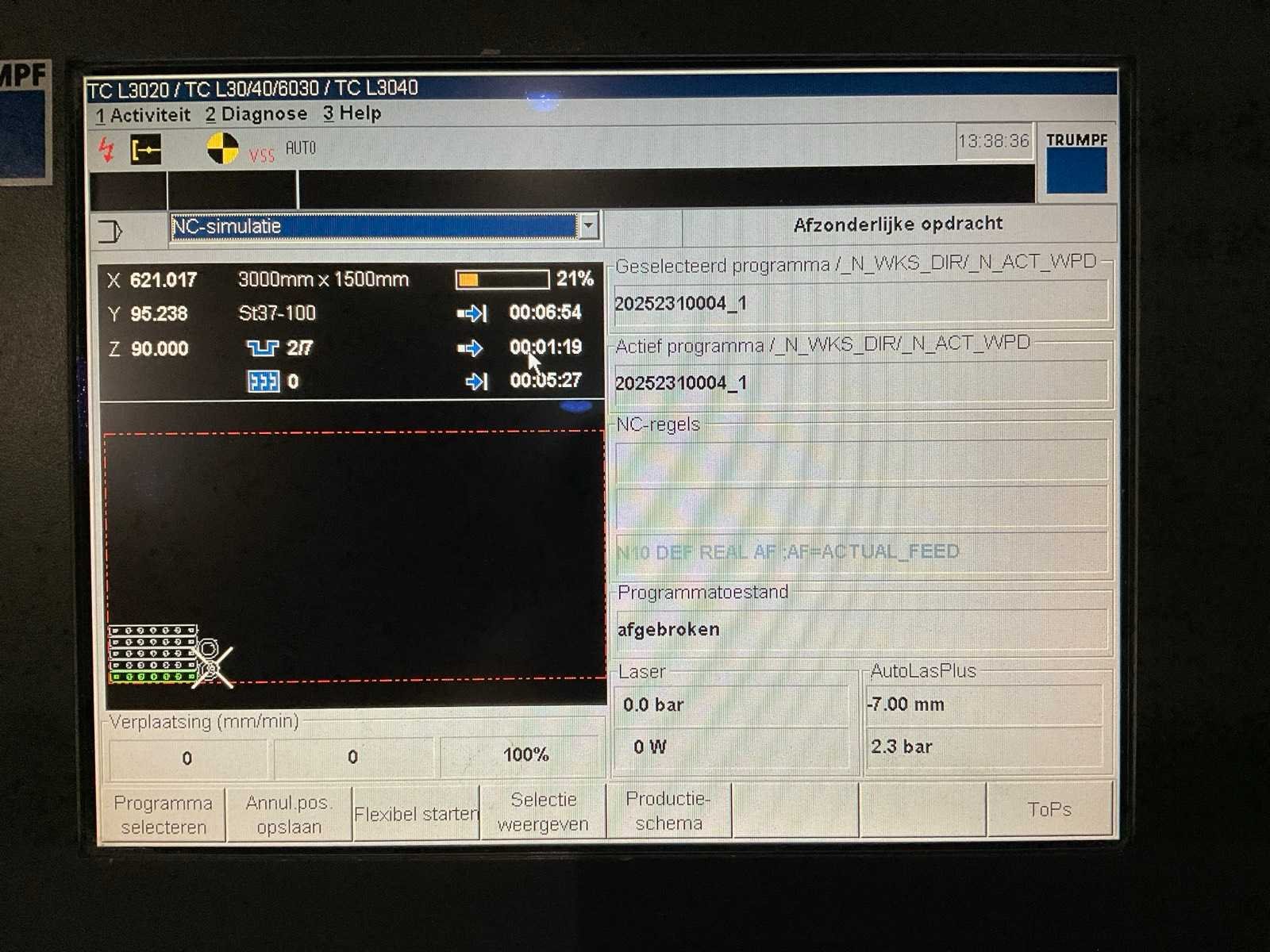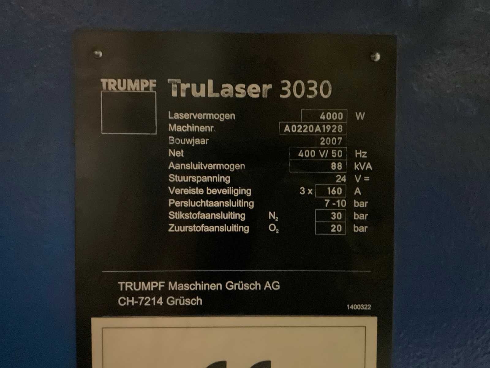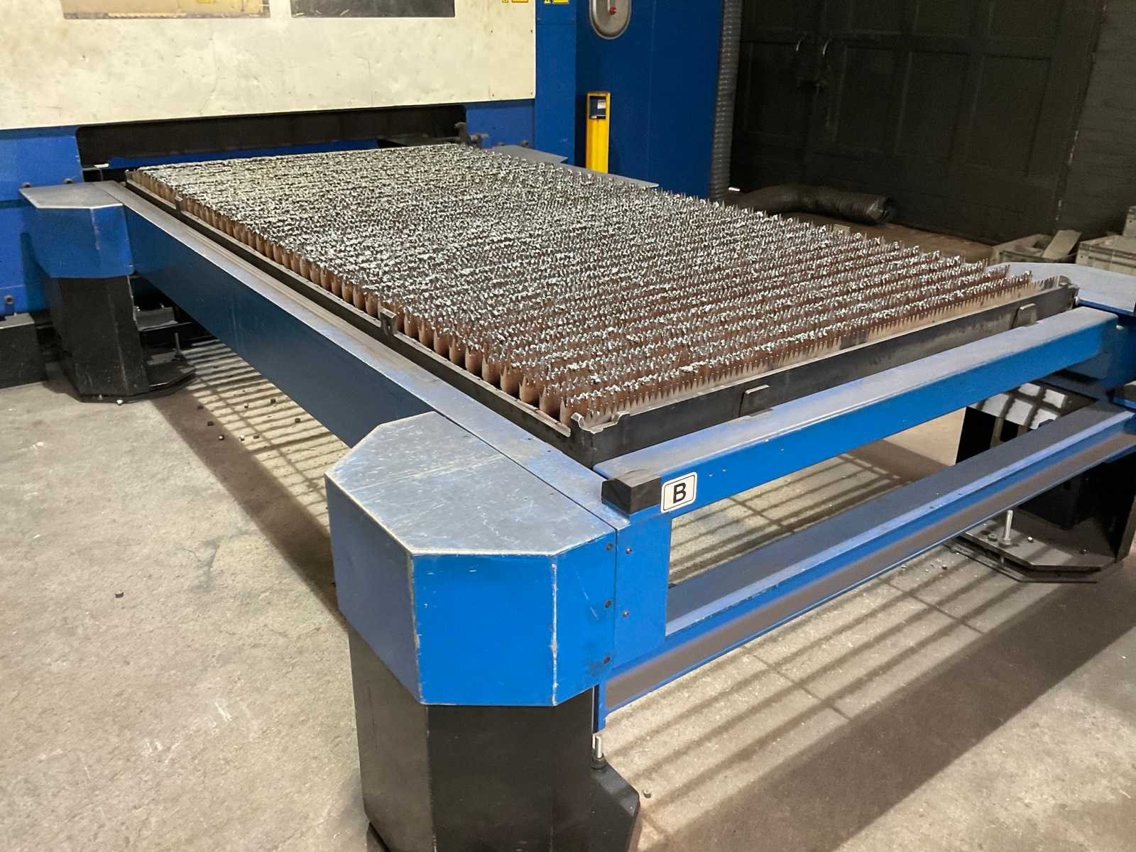 Max gewicht werkstuk: 900kg, voorzien van: Riedel L16/29-TR3.24 koelinstallatie, Trumpf TruFlow 4000 bron, Trumpf MF-L afzuiginstallatie (2000 m/uur), lift in- en uitvoerbed, 2x reservebed, 1x reserve liftbed, diverse reserveonderdelen Nee Merk: Trumpf Type: TruLaser 3030 Bouwjaar: 2007 Serienummer: A0220A1928 Laservermogen: 4kW Werkbereik x: 3000mm Werkbereik y: 1500mm Werkbereik z: 115mm Aansluiting: 400V