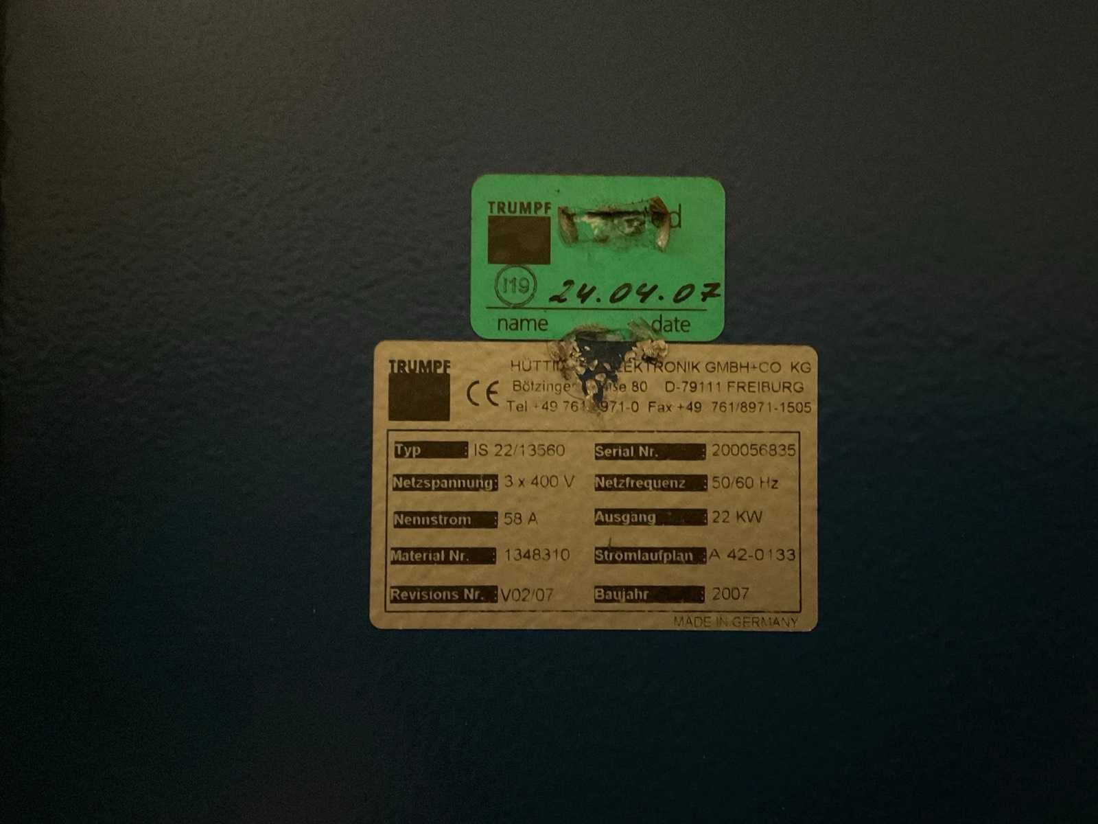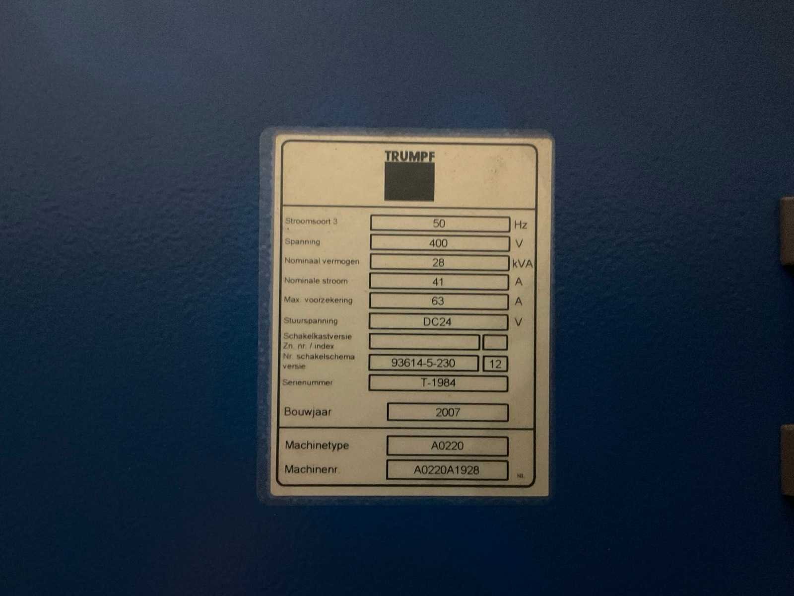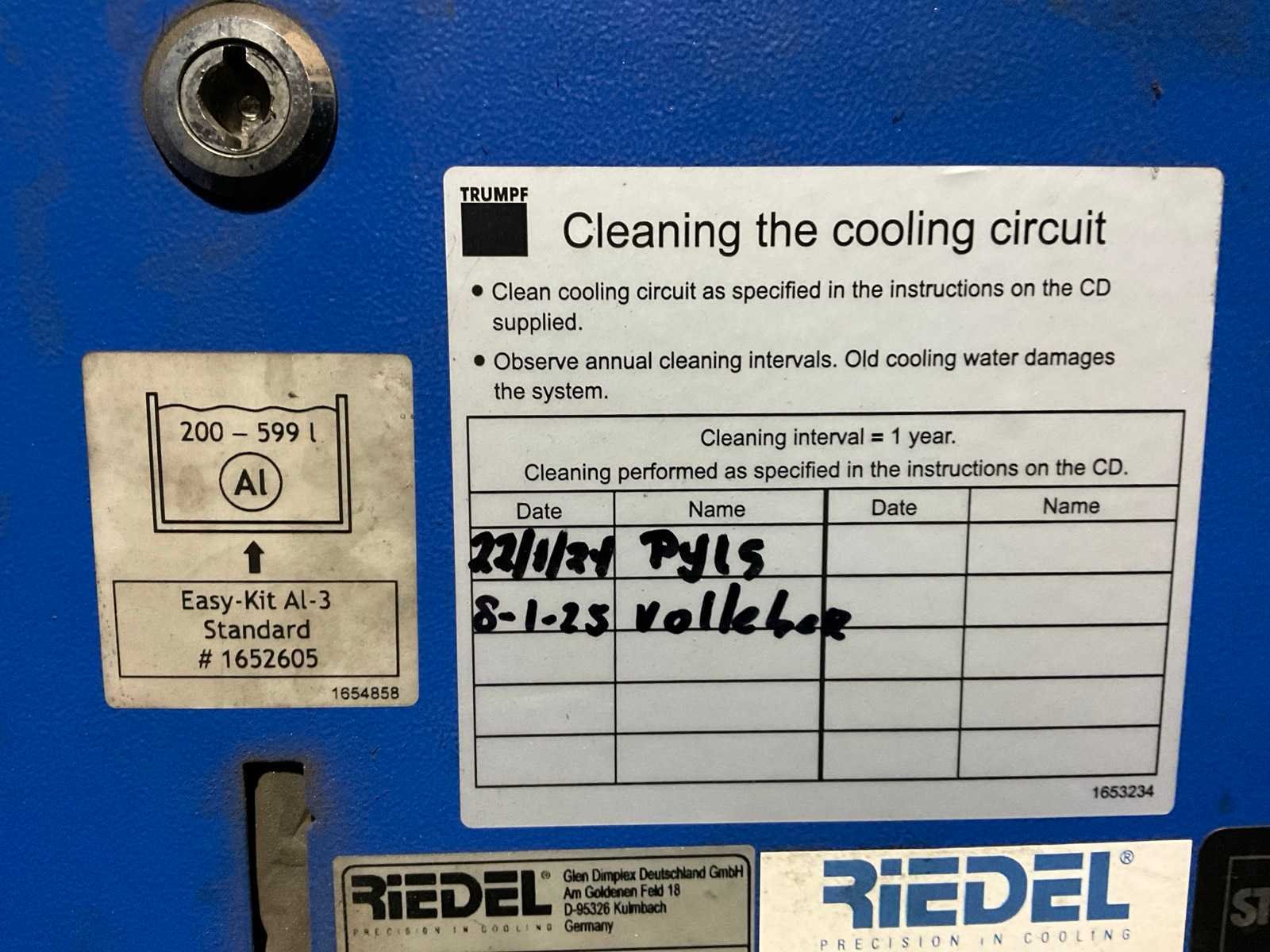 Max gewicht werkstuk: 900kg, voorzien van: Riedel L16/29-TR3.24 koelinstallatie, Trumpf TruFlow 4000 bron, Trumpf MF-L afzuiginstallatie (2000 m/uur), lift in- en uitvoerbed, 2x reservebed, 1x reserve liftbed, diverse reserveonderdelen Nee Merk: Trumpf Type: TruLaser 3030 Bouwjaar: 2007 Serienummer: A0220A1928 Laservermogen: 4kW Werkbereik x: 3000mm Werkbereik y: 1500mm Werkbereik z: 115mm Aansluiting: 400V