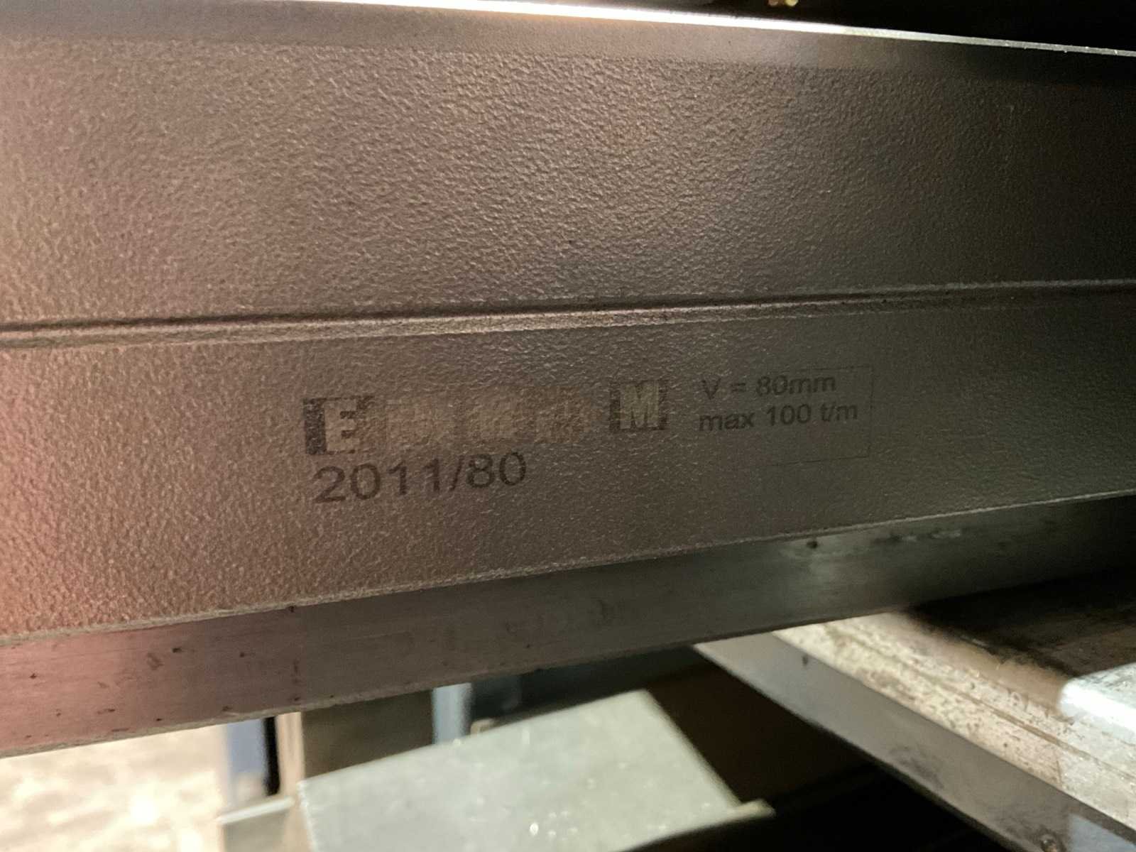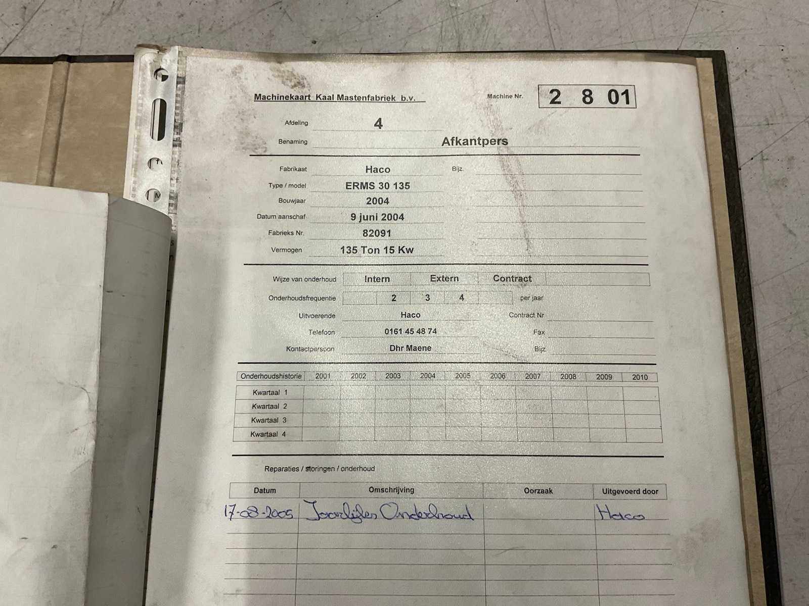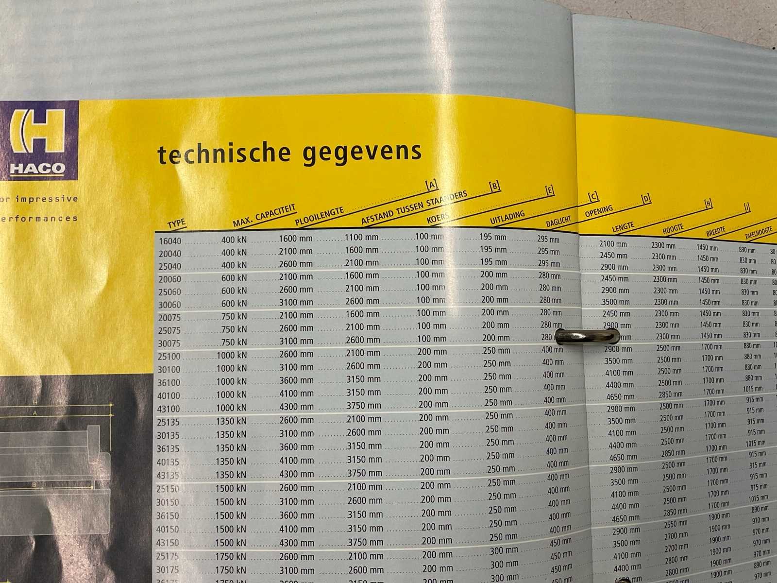 Uitlading: 250mm, valsnelheid: 100 mm/sec, besturingssysteem vervangen in het jaar 2023 (aantoonbaar), voorzien van: pneumatische achteraanslag, Nee Merk: Haco Type: ERMS 30-135 Bouwjaar: 2004 Serienummer: 82091 Capaciteit.: 135t Werklengte: 3100mm Aantal assen: 3 Voetbediening: true Achteraanslag bereik: 750mm CNC-besturing, merk, type: EasyBEND-2D Motorvermogen (kW): 15kW Aansluiting: 400V Machinegewicht: 7800kg Afmeting l: 1600mm Afmeting b: 3500mm Afmeting h: 2480mm