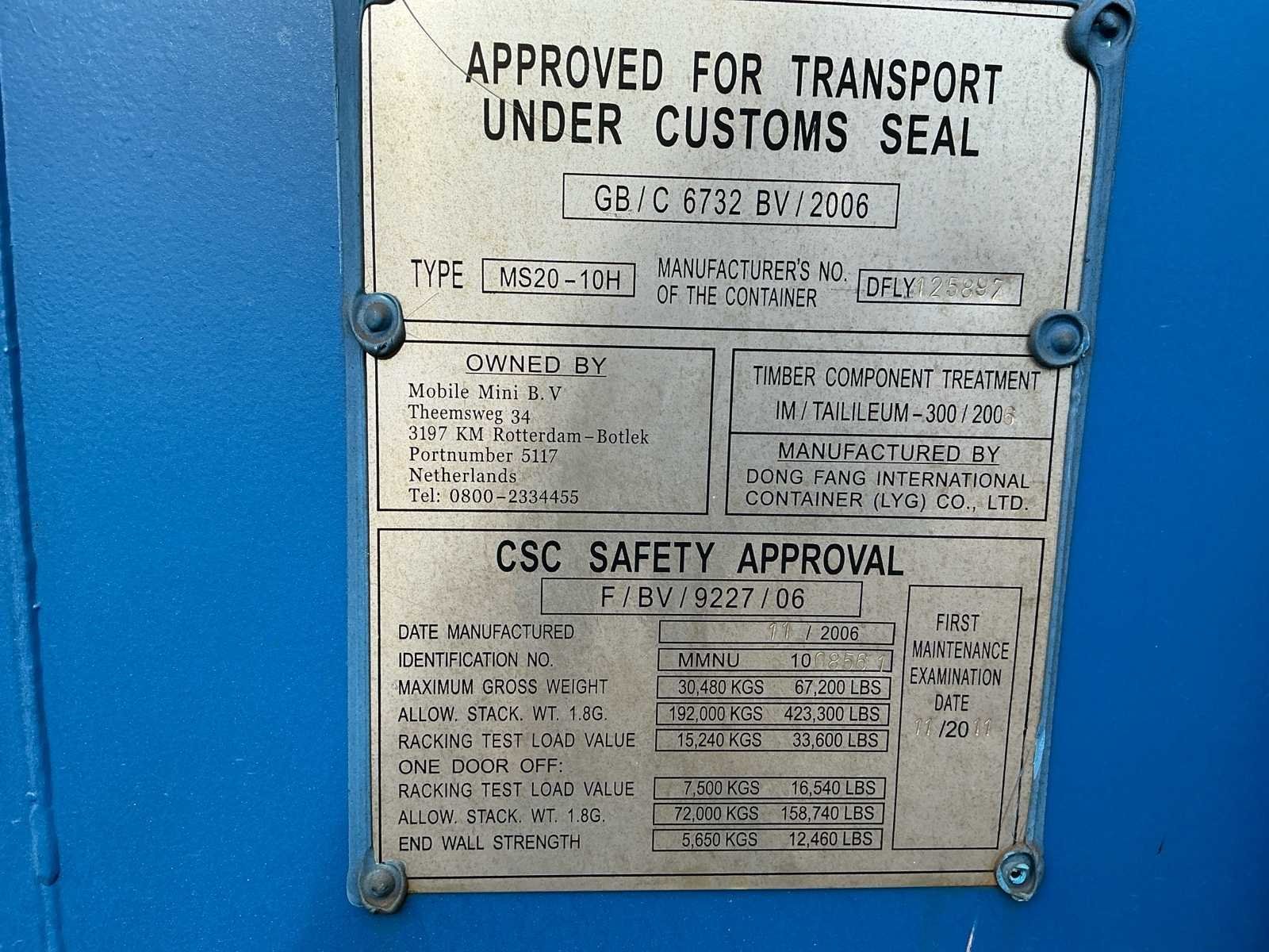 Voorzien van: Volledig ingericht met stellingen met diverse moertjes, boutjes etc. No Type: MS20-10H Bouwjaar: 2011 Serienummer: DFLY125897 Lengte (ft): 20 Eigen gewicht: 2160kg Totale afmeting L: 7130mm Totale afmeting Breedte: 2600mm Totale afmeting Hoogte: 2600mm