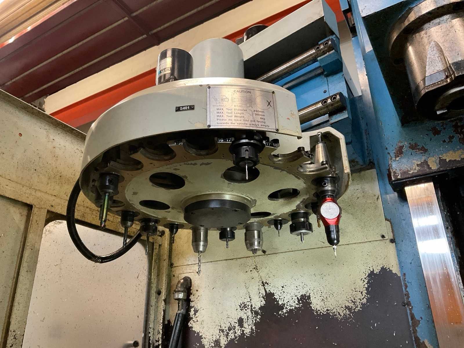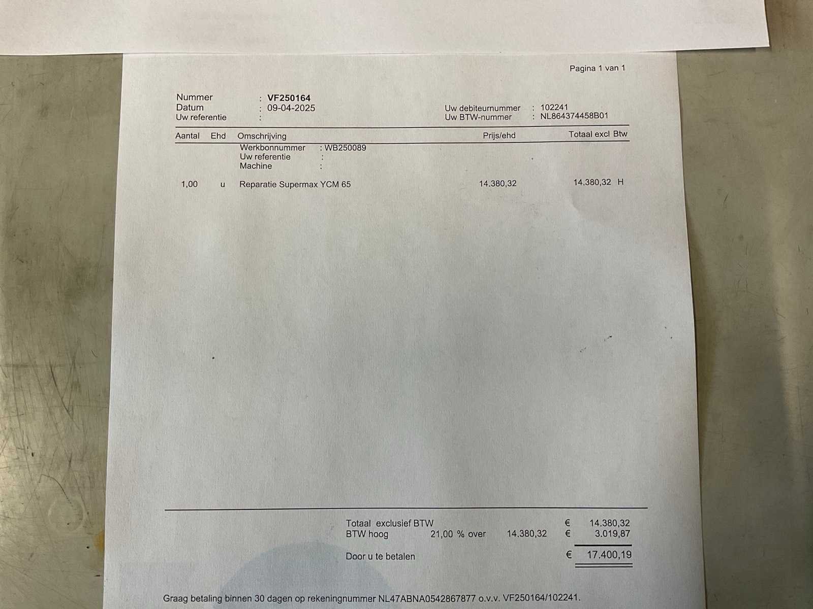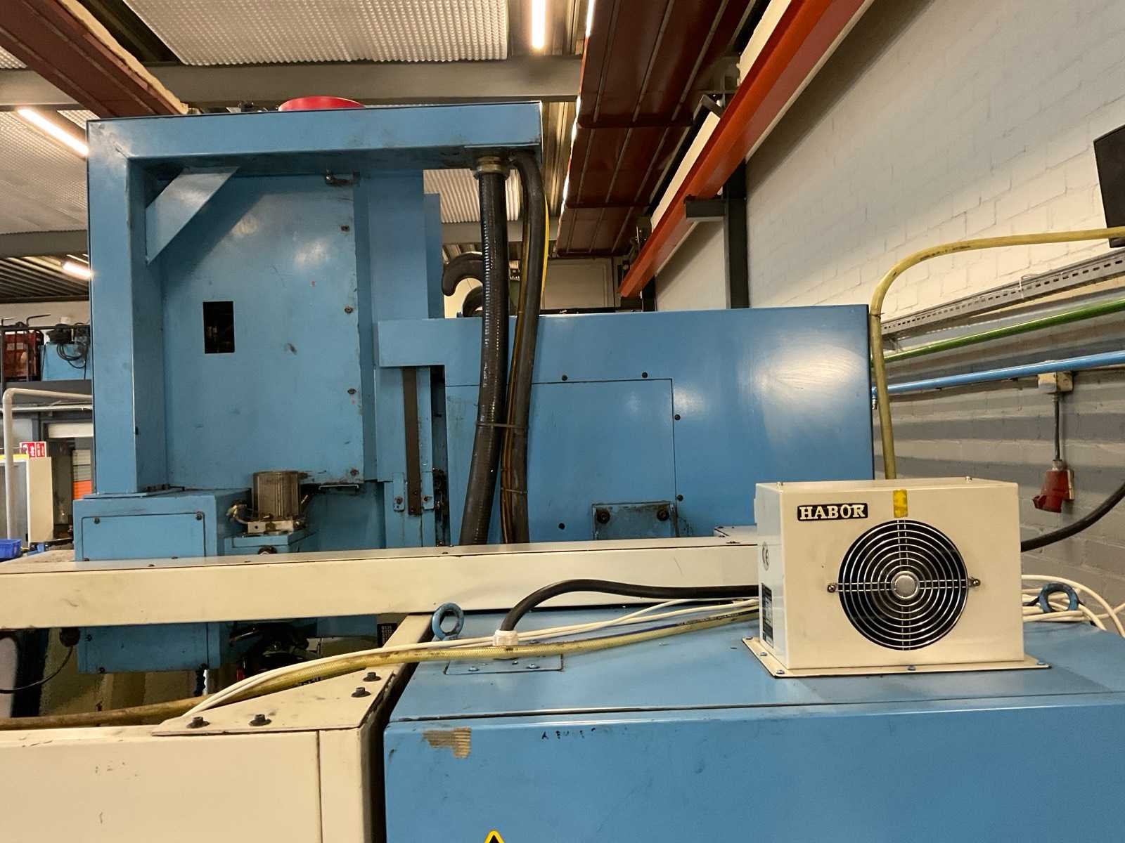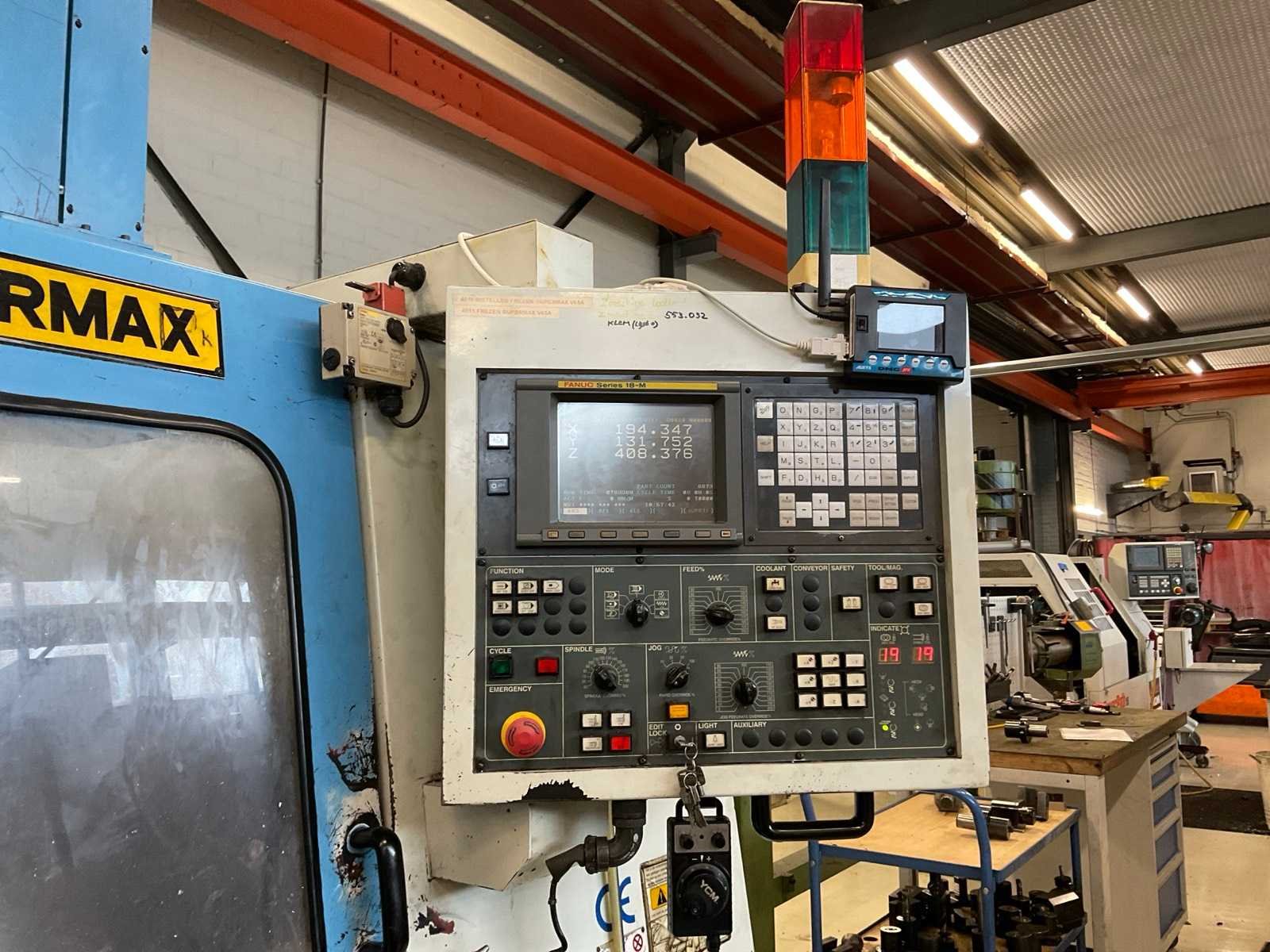 Voorzien van: Fanuc Series 18-M besturingssysteem, Olie koelsysteem, Gereedschapswisselstation (20 plaatsen), spanen lade, recent onderhoud aantoonbaar (april 2025 revisie, kosten: 17.000 euro) Nee Merk: Supermax Type: YCM-V65A Bouwjaar: 1999 Verplaatsing x-as: 650mm Verplaatsing y-as: 410mm Verplaatsing z-as: 615mm Opname: BT40 Snelheid tot n =: 8000rpm T-gleuf opspantafelafmeting L: 840mm T-gleuf opspantafelafmeting B: 420mm Werkstuk gewicht max.: 350kg Koelmiddelpomp: true Motorvermogen (kW): 5.5kW Aansluiting: 400V Machinegewicht: 3870kg Afmeting l: 2770mm Afmeting b: 2110mm Afmeting h: 1930mm Leveringsvoorwaarden: Geen heftruck aanwezig op locatie!