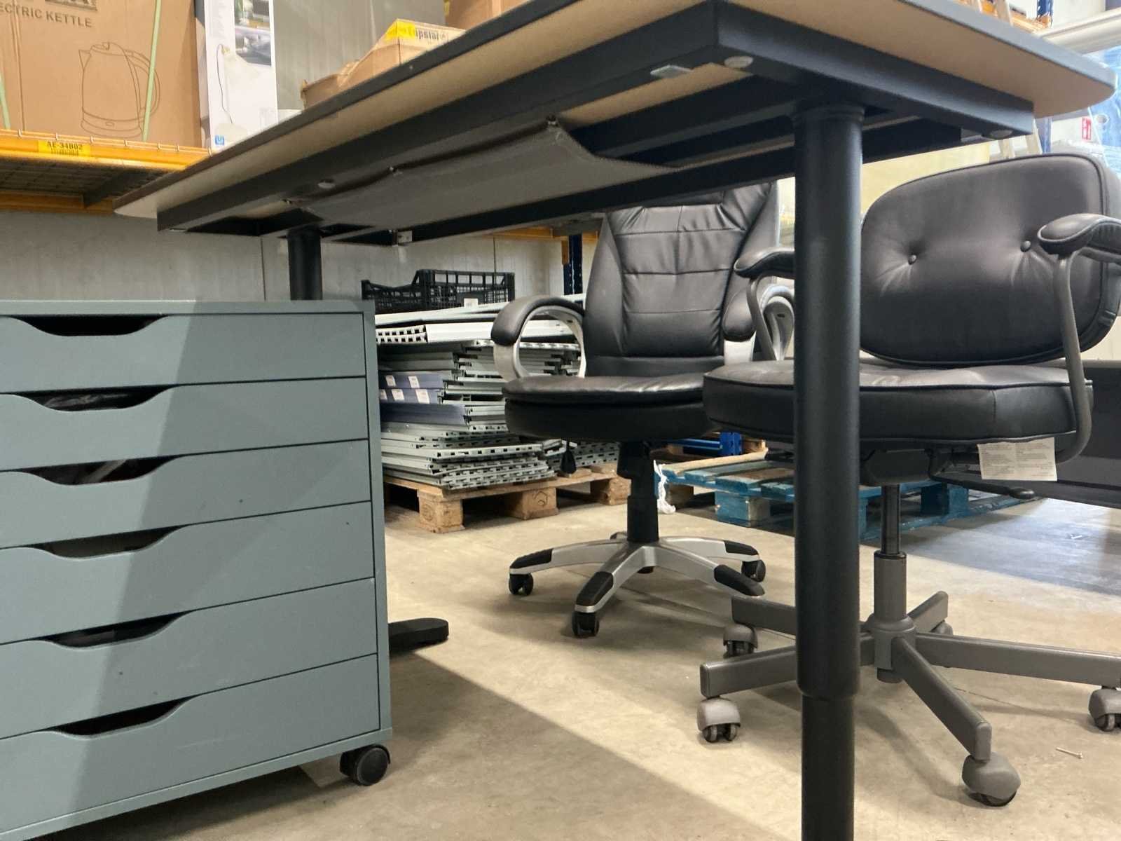Voorzien van: 1, in hoogte verstelbaar bureau (blad 60x140cm) 1,lade kast op zwenkwieltjes (50x67x67) (6 lades), 2, bureaustoelen, Nee
