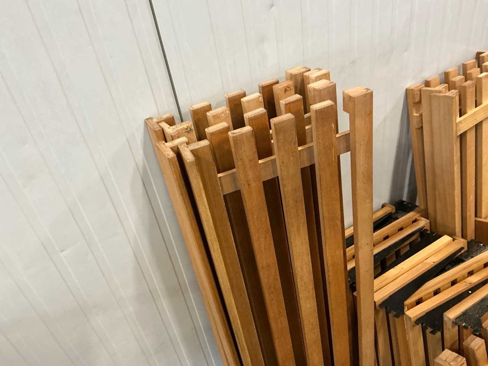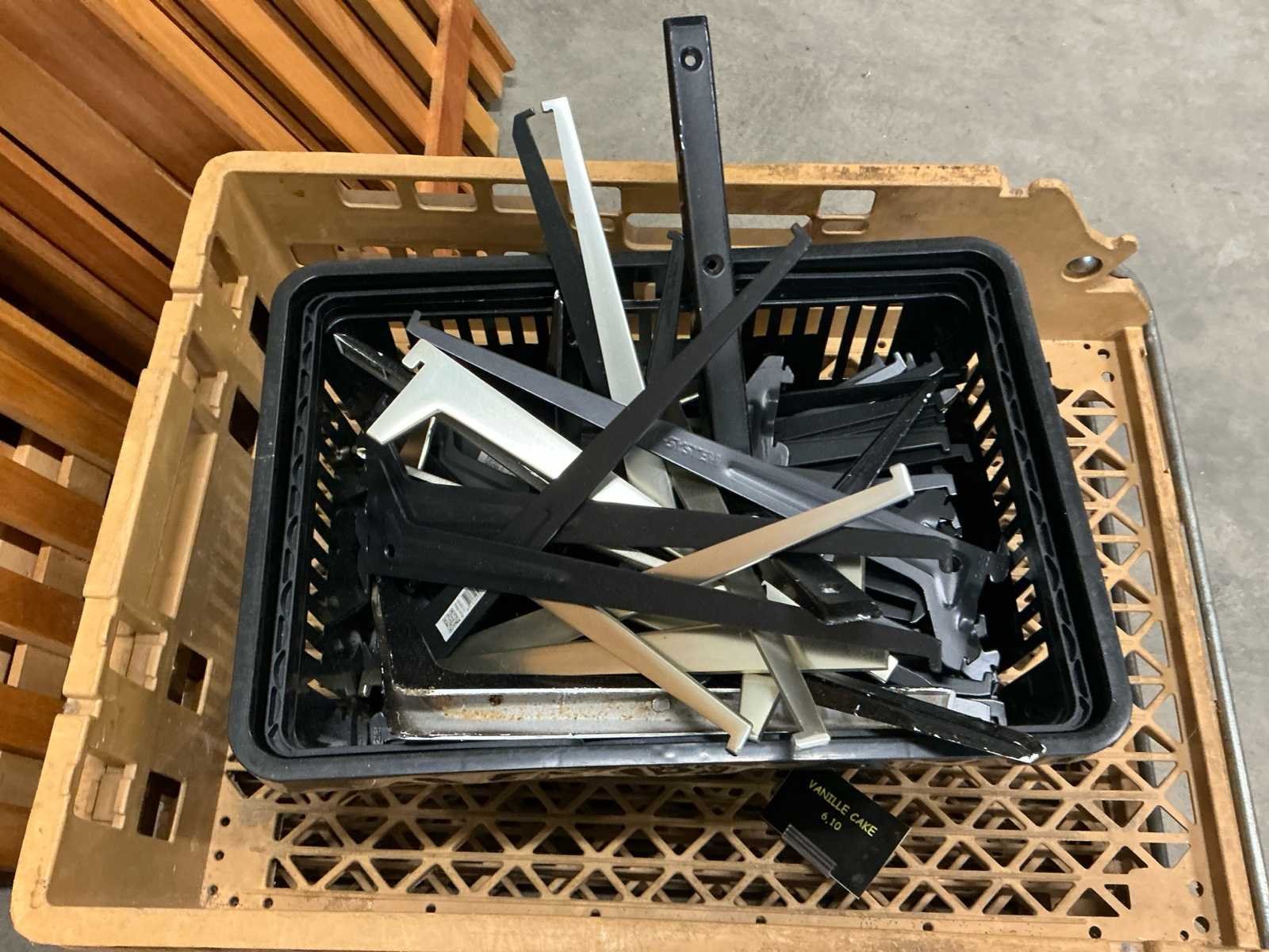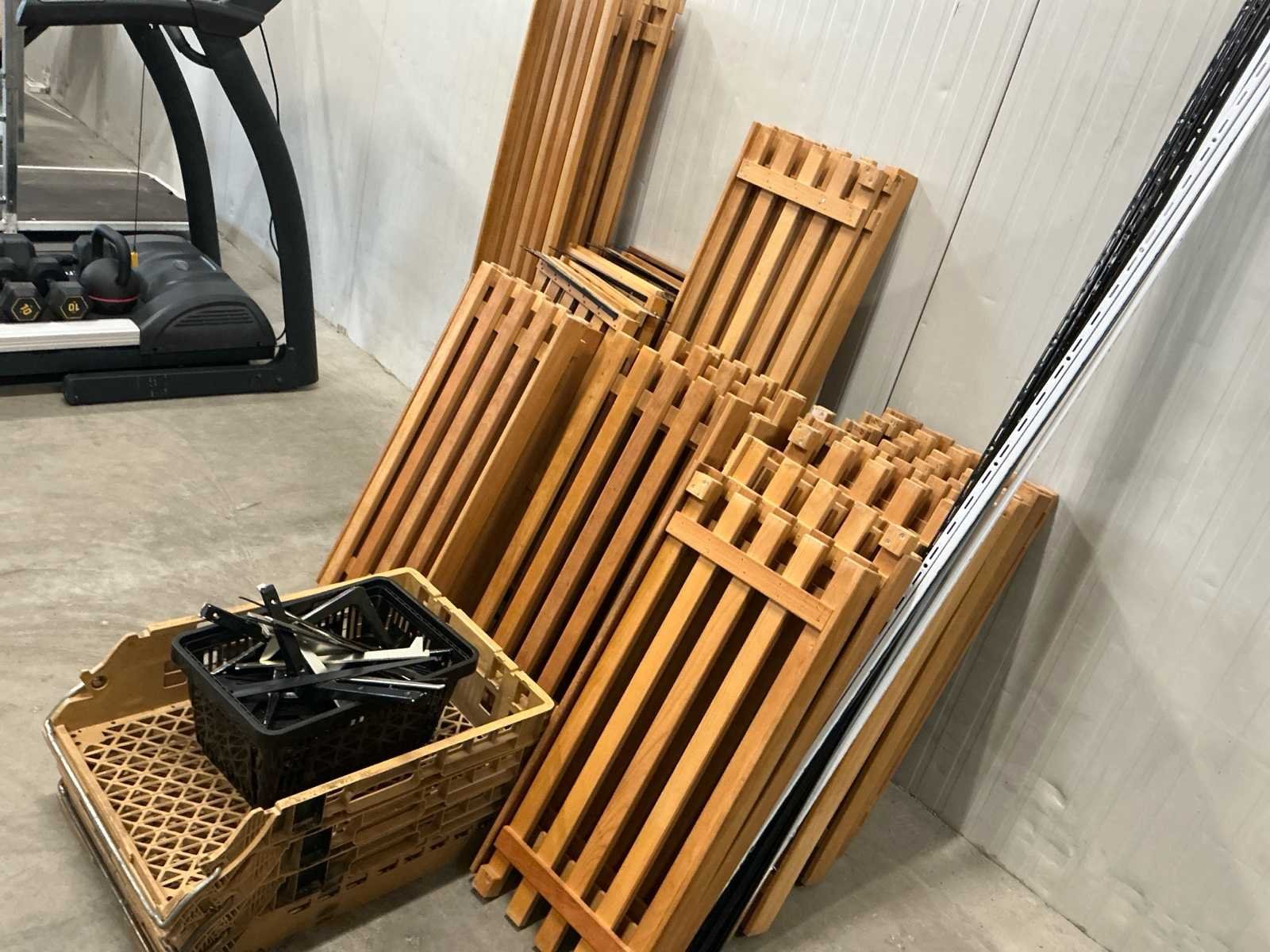 Voorzien van: Kwalitatief houten stellage, 4 planken (150x36cm), 3 planken (136x36cm). 37 planken (90x36cm) 3 bakken, 10 insteek profielen, inclusief stalen transport rek 2 plateaus demonteerbaar. Nee