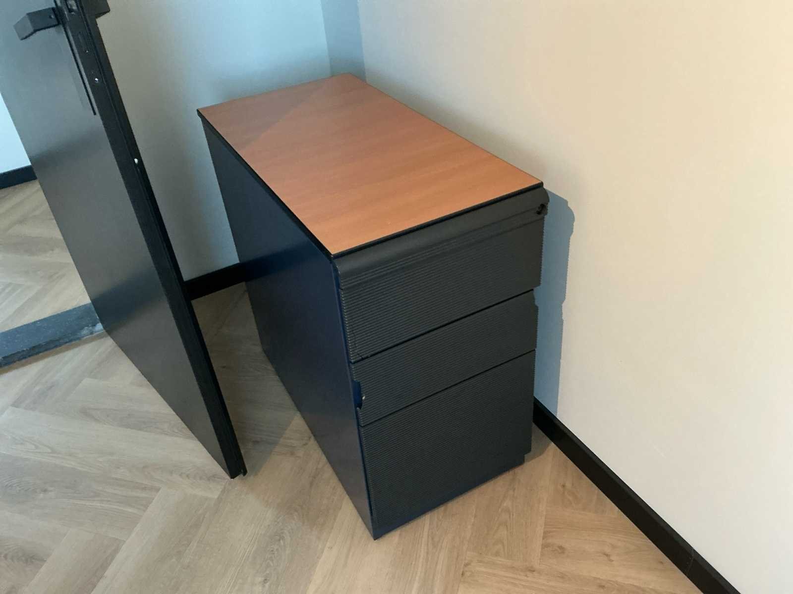 Voorzien van: 2 bureaus in hoogte verstelbaar 1. (160x80) 1, (160x110). 3 kasten, Nee Materiaal: Hout/staal