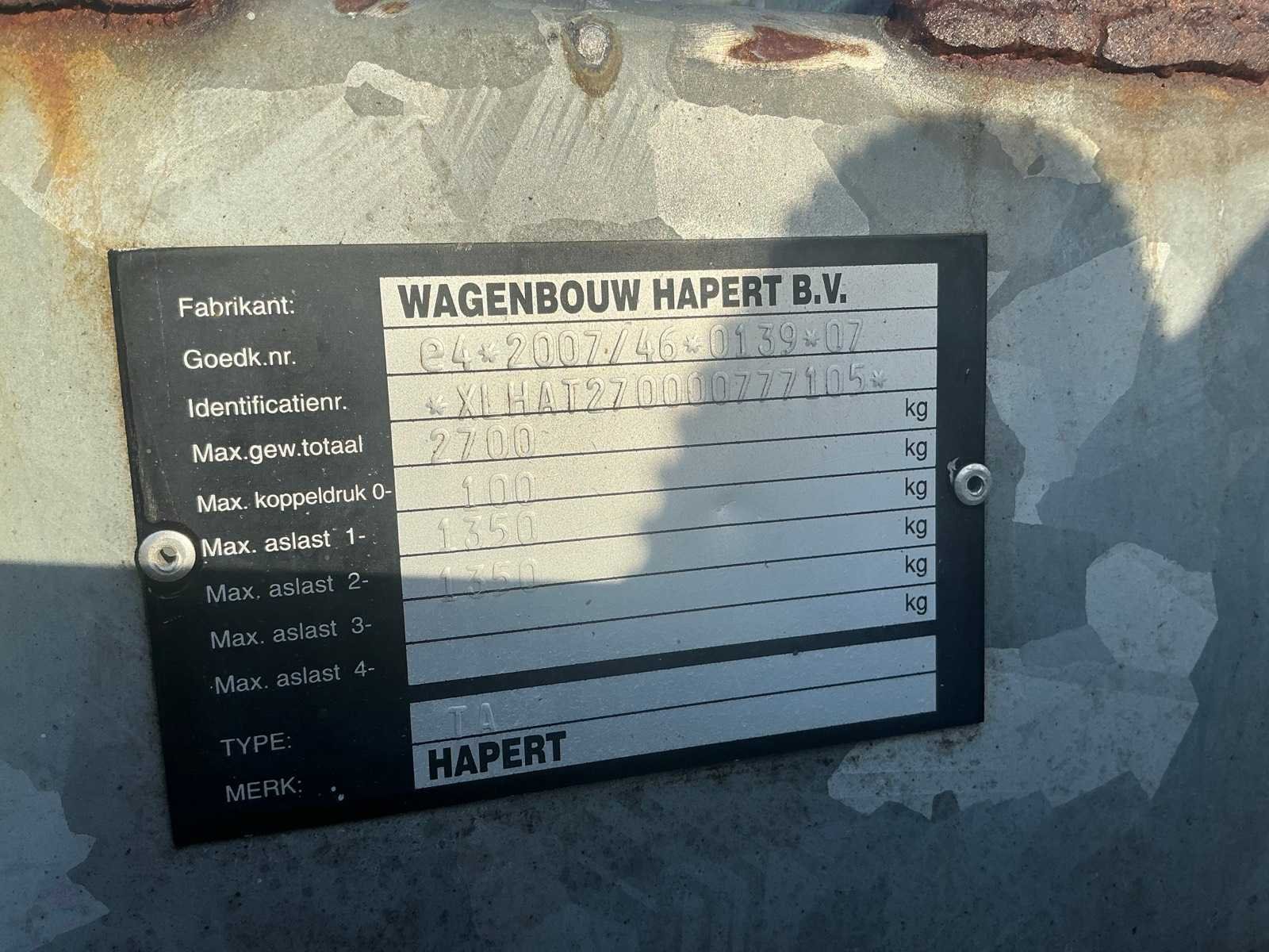 Gekeurd tot einde 2025. Voorzien van oprijplaten, lier. Nee Merk: Hapert Type: TA Bouwjaar: 2015 Aantal assen: 2 Laadbak afmeting l: 410cm Laadbak afmeting b: 205cm Ledig gewicht: 618kg Laadvermogen: 2082kg Datum eerste toelating: 2015-04-01 Datum eerste toelating (NL): 2015-04-01 Kenteken: 07-WL-TJ Kentekenpapieren compleet?: true Hoogte: 70cm Lengte: 560cm Breedte: 205cm Nationaliteit documenten: NL