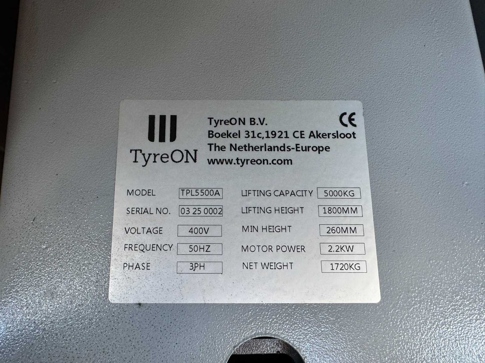 Ongebruikte TyreON TPL5500A elektro‑hydraulische 4-koloms uitlijnhefbrug. Voorzien van achterwiel uitlijnplaten + rijbaan-vulplaten, met geïntegreerde 2,5 ton lucht-hydraulische rolkrik (TRJ25ALP) en LED rijbaanverlichting met beschermroosters (LED8P); rijbanen 4,8 meter lang × ca. 50 cm breed; hefvermogen 5 000 kg; maximale hefhoogte ca. 180 cm; aangedreven door 2,2 kW elektromotor (400V, 3-fase); voorzien van mechanicshe vergrendeling en automatische ontgrendeling bij op/neer bewegen; Afrolbeveiliging voor en achter; lastafhankelijk daalventiel; mechanisch synchroon via stalen kabels; Bediening via bedieningsconsole (24V); handmatige nooddaal-voorziening bij stroomuitval; verstelbare rijbaanafstand van 99 tot 115 cm (geschikt voor het heffen van voertuigen met wielbasis tot ca. 4,65 m); rijbaanverlichting bestaande uit 24V LED-armaturen met beschermroosters, gemonteerd aan de zijkanten van de rijbanen voor optimale werkverlichting. Levering omvat : 4 koloms hefbrug verpakt in stalen transportframe samen met LED rijbaanverlichting en de beschermroosters Lucht hydraulische rolkrik - 2500 kg Lucht-hydraulische pomp met luchtslang 2,2 kW 400V electisch hydraulische powerunit Bedieningkast inclusief bekabeling Nee Merk: TyreON Hefhoogte: 180cm Type: TPL5500A Bouwjaar: 2025 Serienummer: 03 25 002 4-koloms: true Capaciteit.: 5000kg Baanbreedte: 500mm Aansluiting: 400V Eigen gewicht: 2000kg Totale afmeting L: 5100mm Totale afmeting Breedte: 660mm Totale afmeting Hoogte: 80mm Leveringsvoorwaarden: Geladen op vrachtwagen