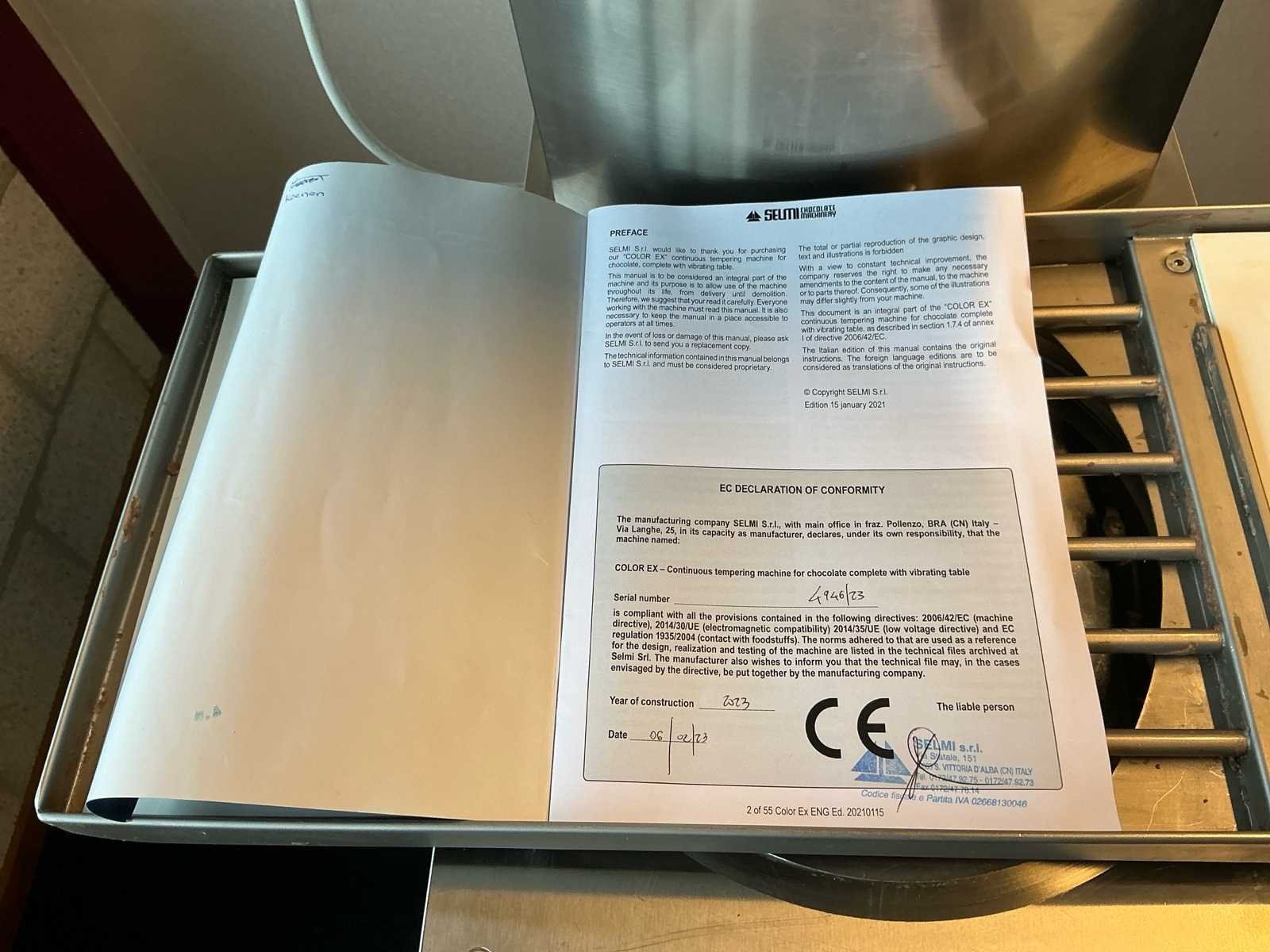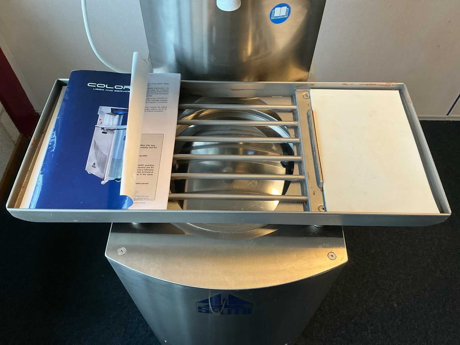Voorzien van 1kW aandrijving; productie capaciteit 55kg per uur; 12 kg chocolade smelten en temperen in 8 minuten; inclusief verwarmbare triltafel; voetpedaal om te doseren; schroef pomp verwijderbaar; digitaal controle paneel Nee Merk: Selmi Type: Color EX Bouwjaar: 2023 Serienummer: CLX00004946/23 Eigen gewicht: 137kg Totale afmeting L: 850mm Totale afmeting Breedte: 680mm Totale afmeting Hoogte: 1470mm Aansluiting: 380V