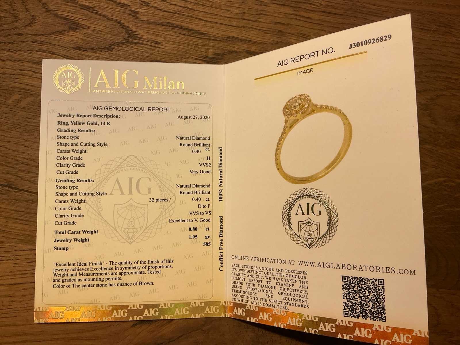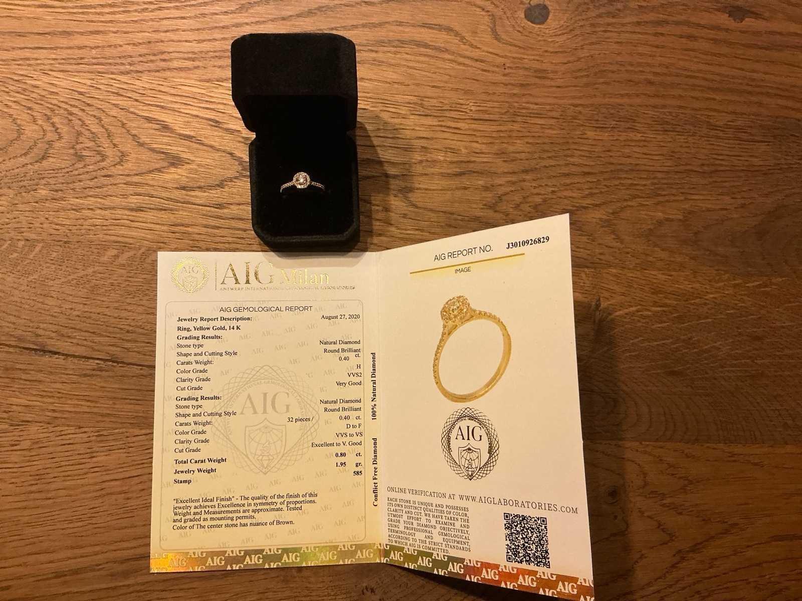 Nee Merk: Gouden ring Product type: Ring Titel van werk: 14 Karaats gouden ring met certificaat Voornaamste diamant: Natural diamond Kleur diamant: Zilver Gewicht diamant: 40ct Slijpvorm diamant: Round brilliants Slijpkwaliteit diamant: Very good Zuiverheidsgraad diamant: VVS2 Edelsteen: Natural Diamond Kleur edelsteen: D to F Karaat: 14 Totaal gewicht: 2g Ringmaat: 15 Certificaat: True Herkomst: Antwerpen Keurmerk: AIG MILAN Lage schatting: 750€ Hoge schatting: 1250€