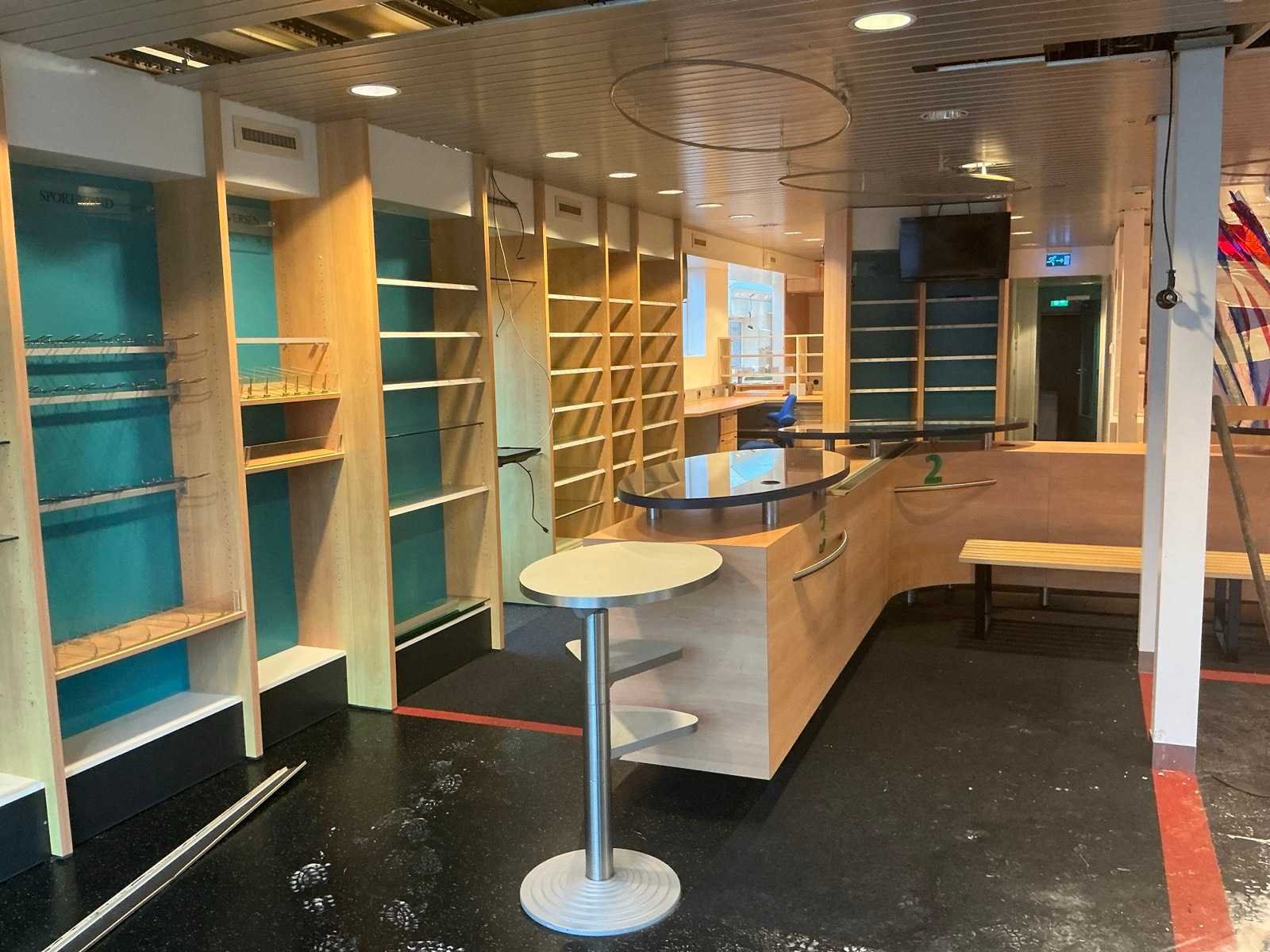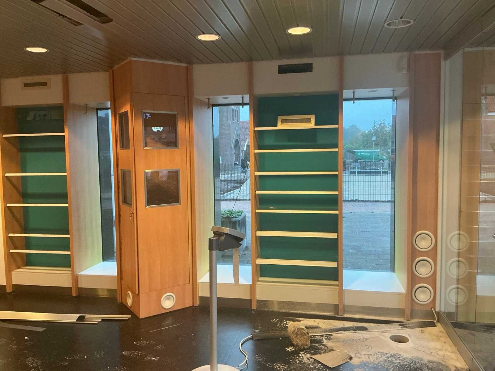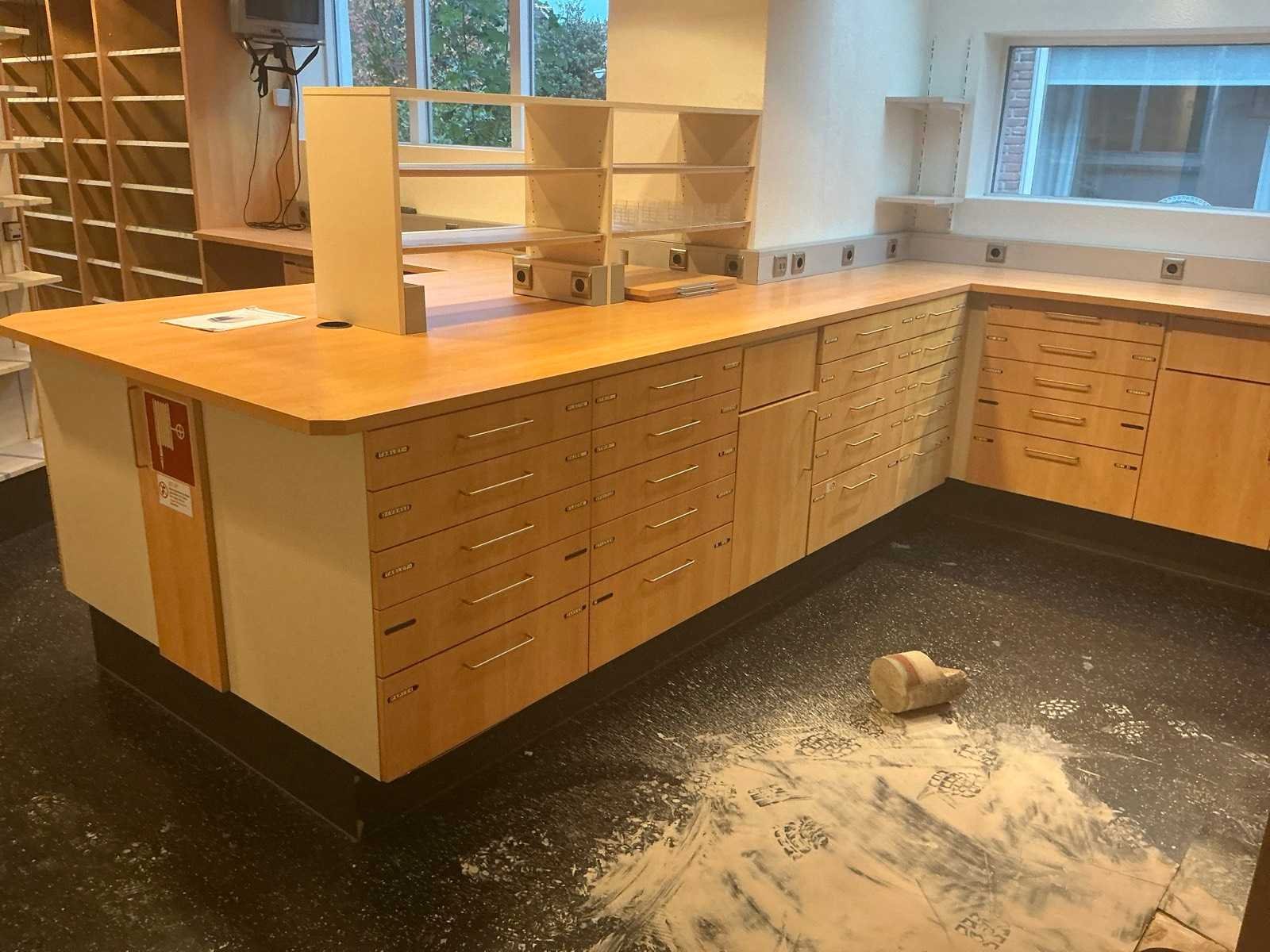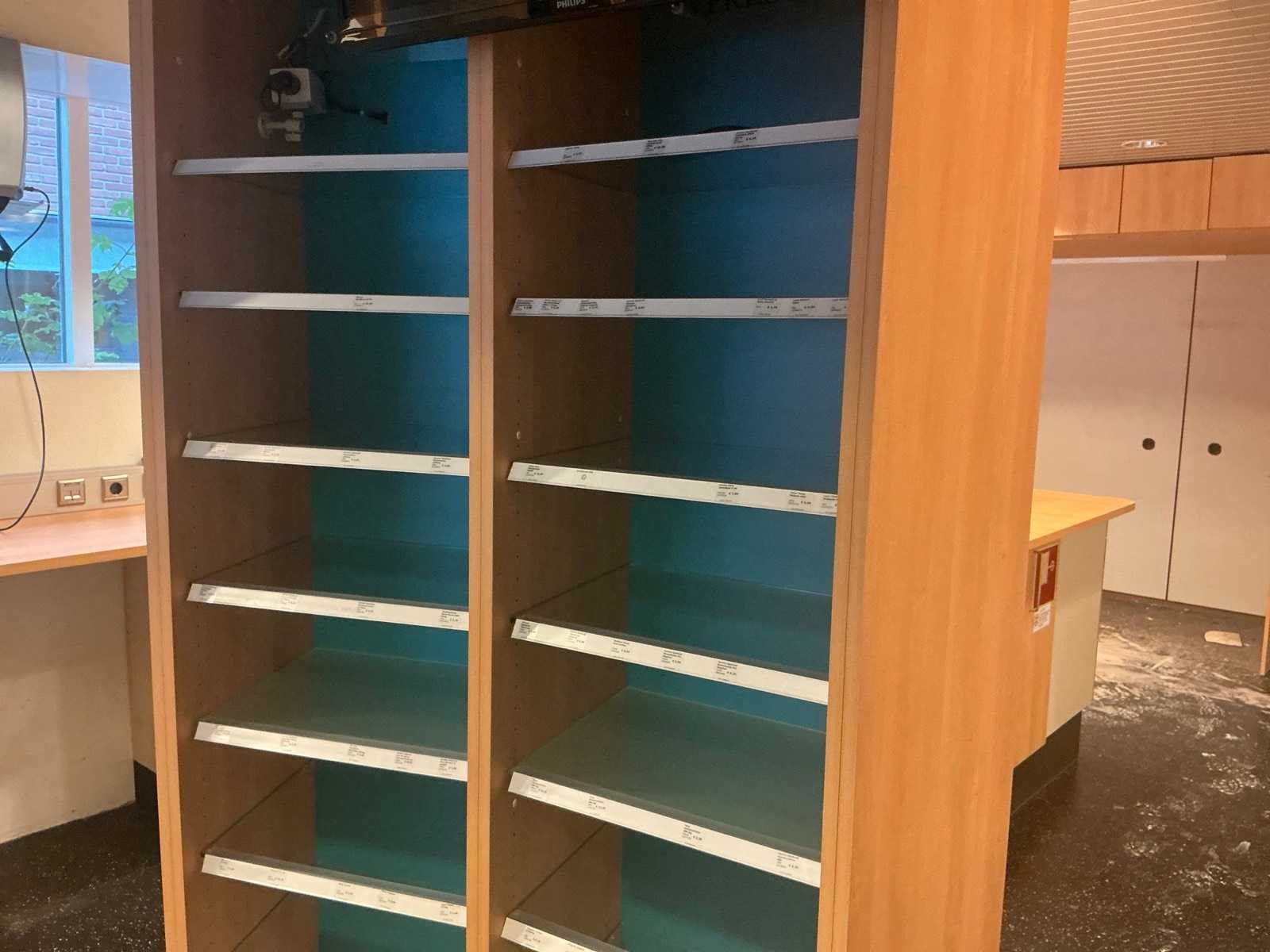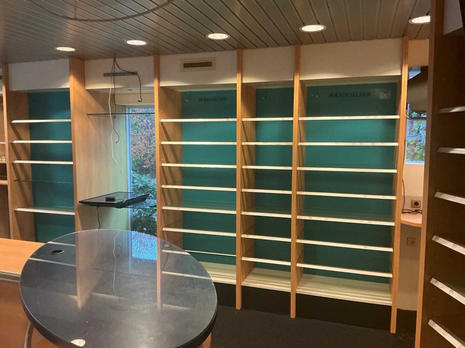 Diverse voorraad kasten waar onder 4 van 3 meter; 1 kast van 6 meter; Toonbanken; voorraad kasten winkel; televisies; Rolstoelen; Kastwanden; Kaartjes trekker: 3 stoelen 1 Bank; White board; Brandslang; Brandkast No Merk: Apotheek interieur