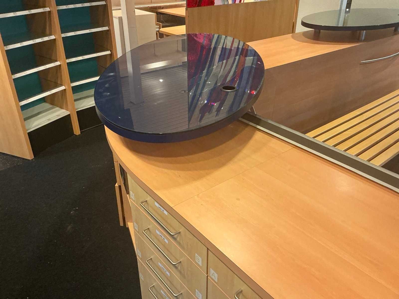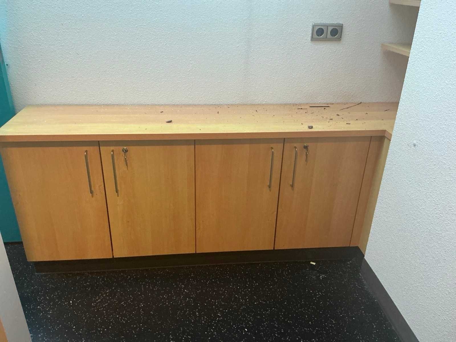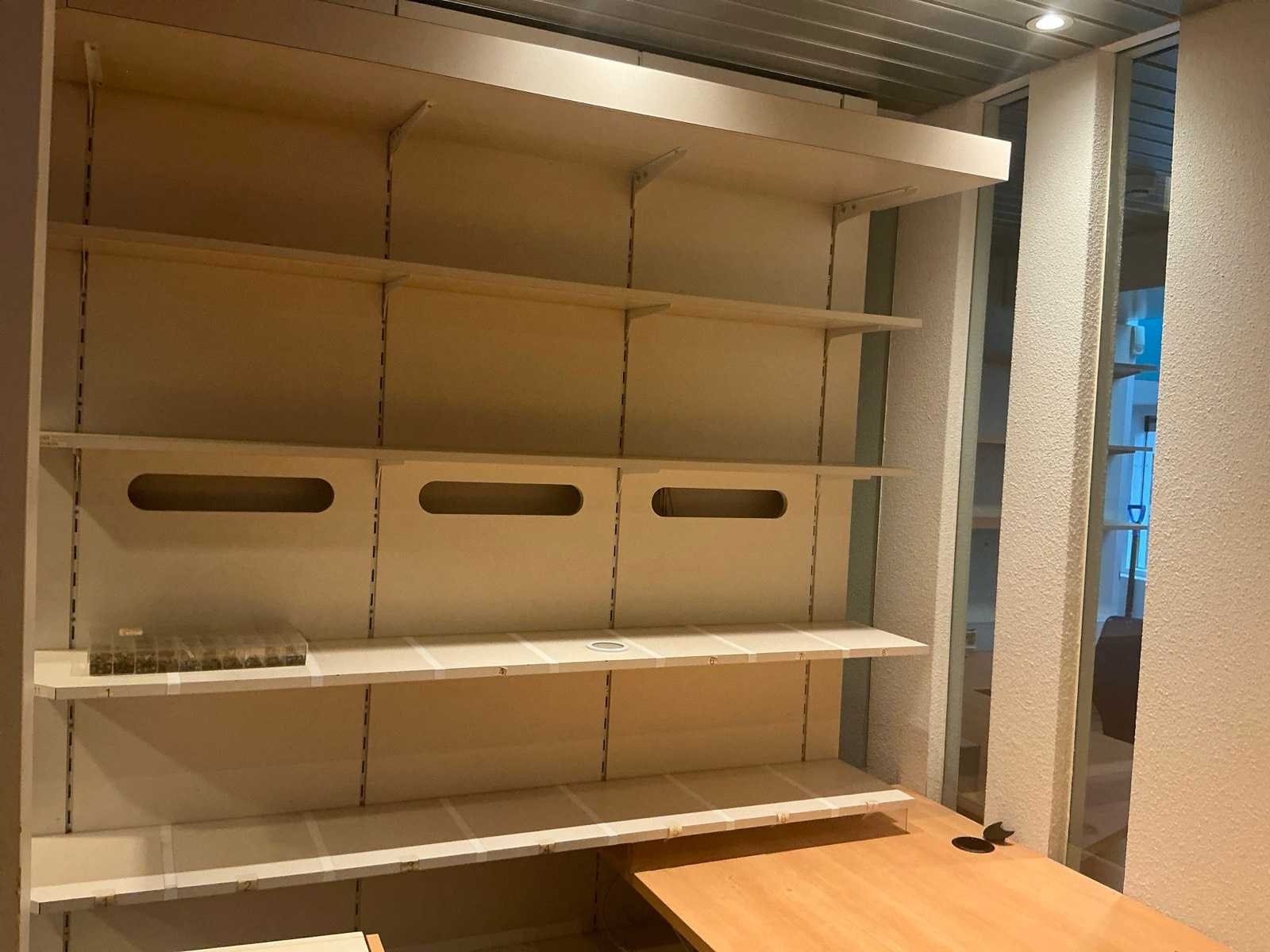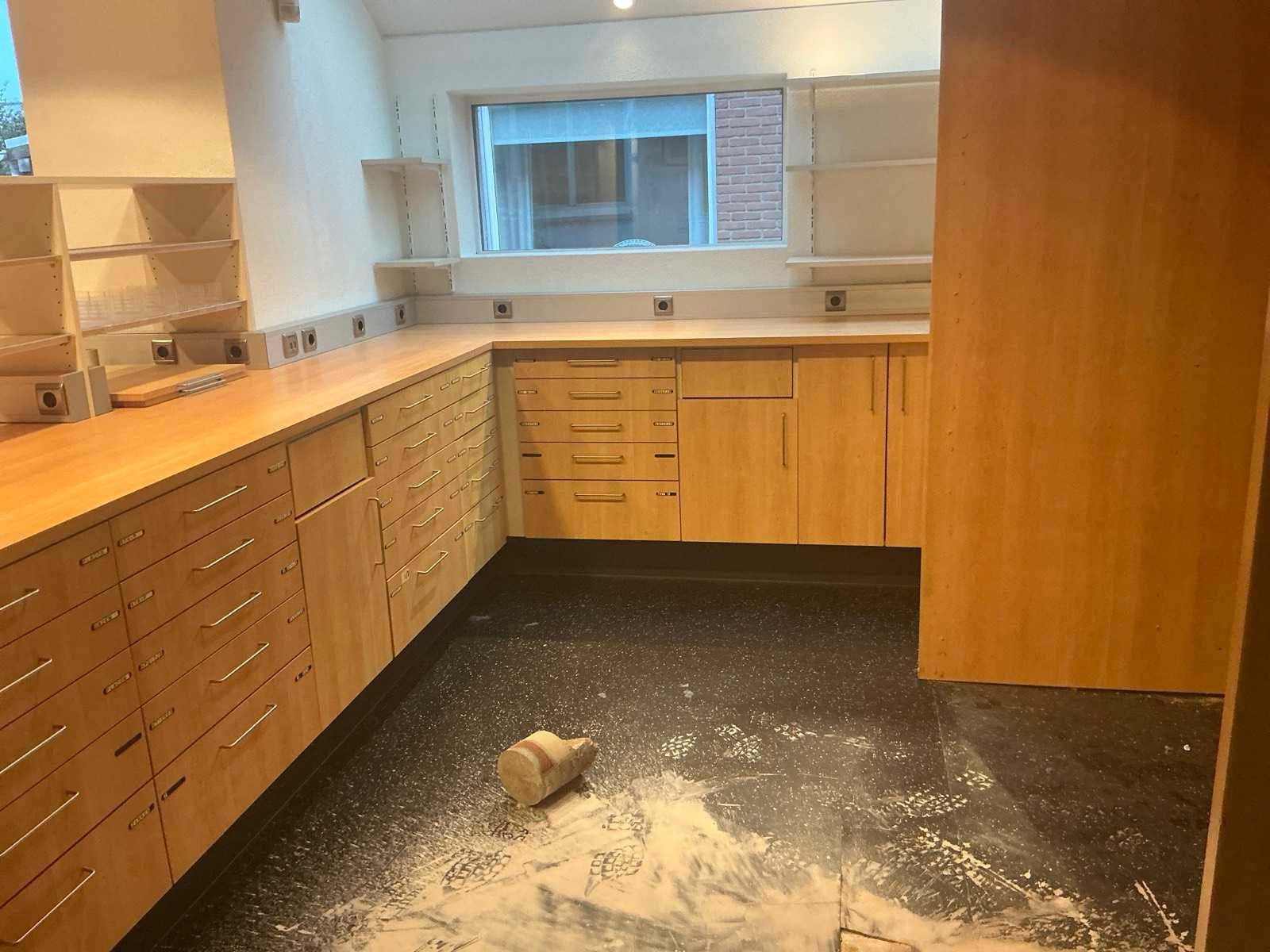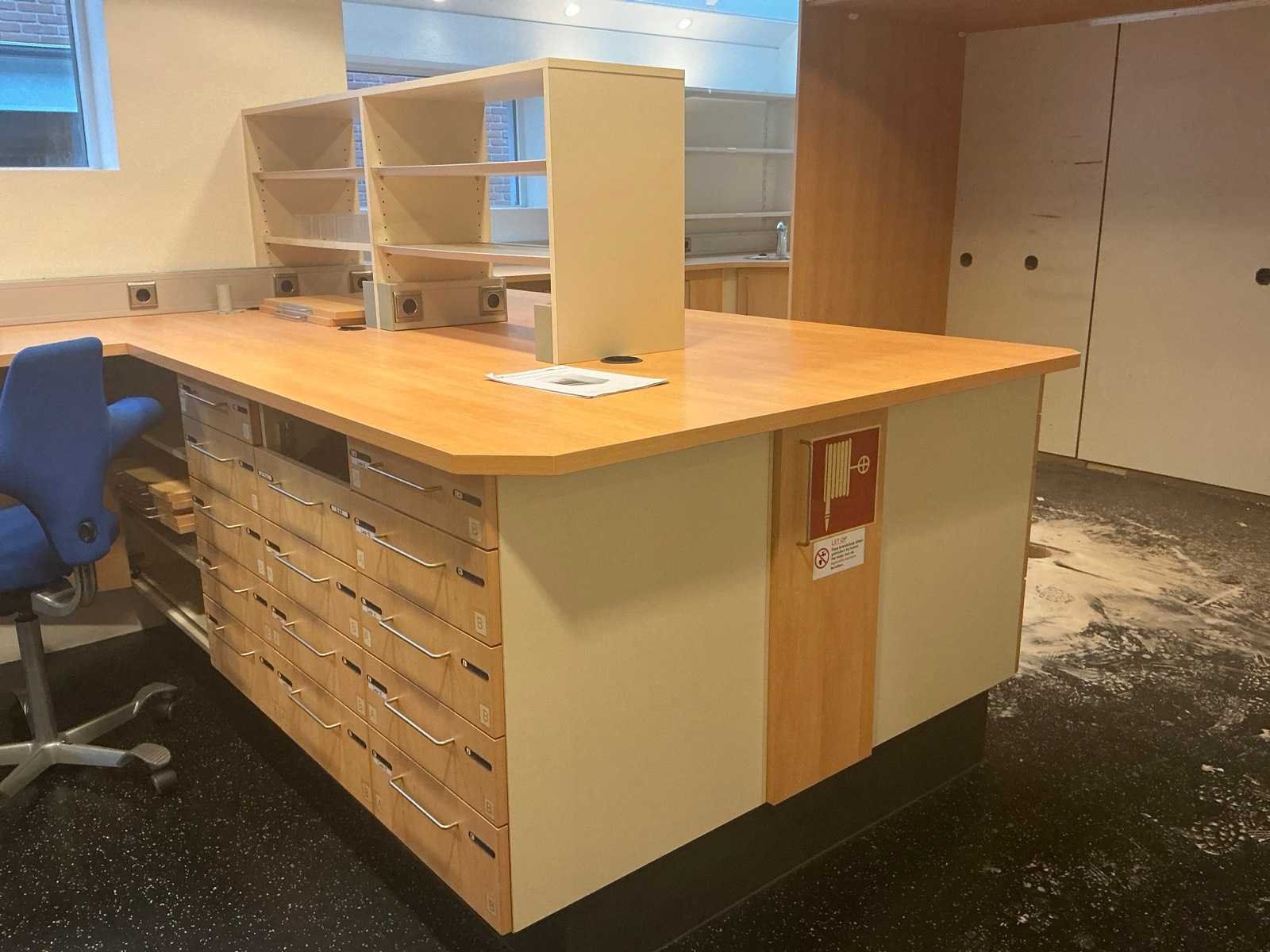 Diverse voorraad kasten waar onder 4 van 3 meter; 1 kast van 6 meter; Toonbanken; voorraad kasten winkel; televisies; Rolstoelen; Kastwanden; Kaartjes trekker: 3 stoelen 1 Bank; White board; Brandslang; Brandkast No Merk: Apotheek interieur