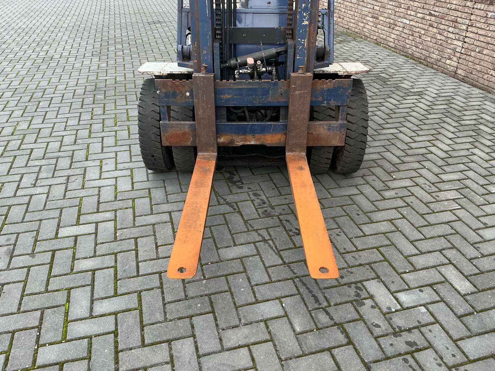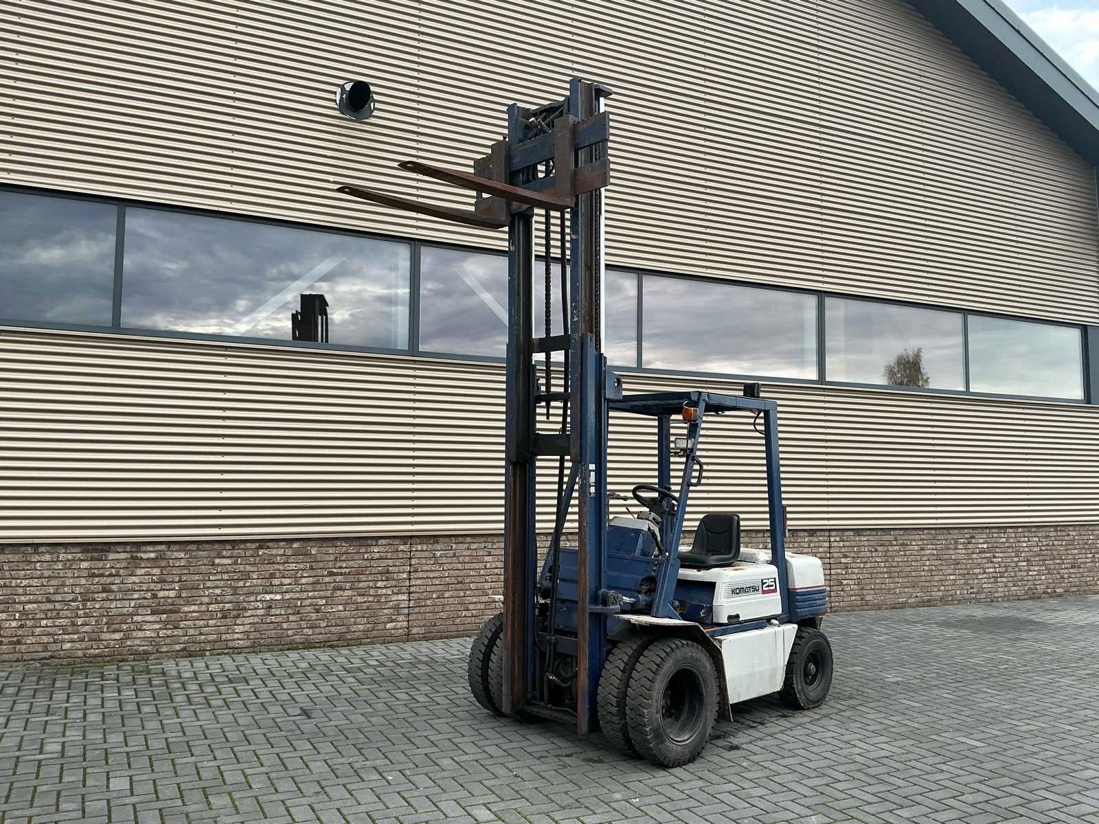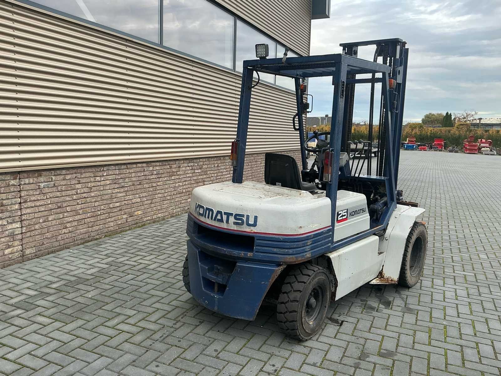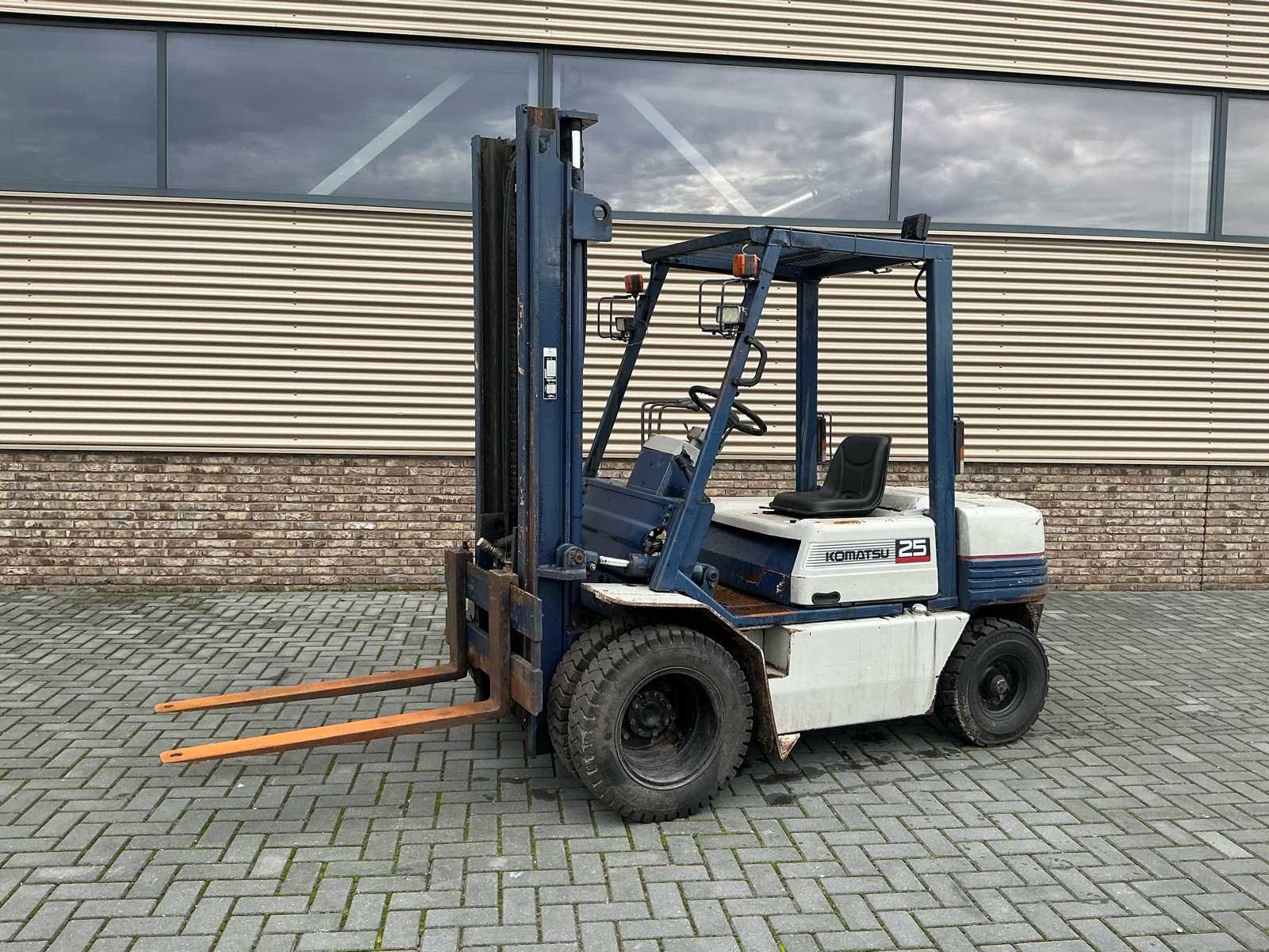 2 Assen, LED werkverlichting. Nieuwe stoel, remmen defect. Nee Merk: Komatsu Type: 25 Brandstof: Diesel Aantal wielen: 6 Afgelezen urenstand: 8133 Duplex mast: true Eigen gewicht: 4000kg Hefvermogen: 2500kg Lepellengte: 1100mm Vol rubber banden: true Minimale doorrijhoogte: 2400mm Totale afmeting L: 3700mm Totale afmeting Breedte: 1500mm Diesel: true
