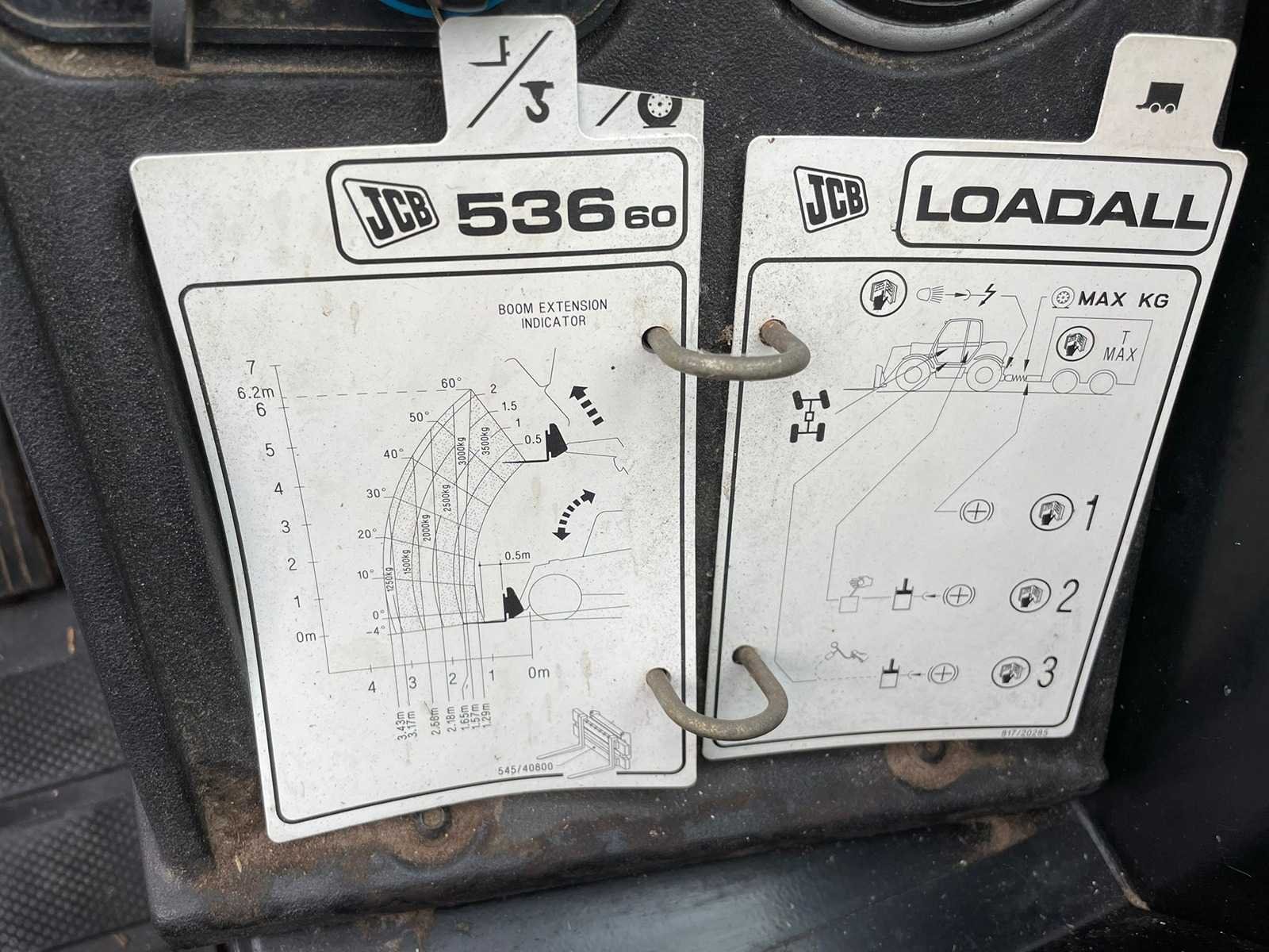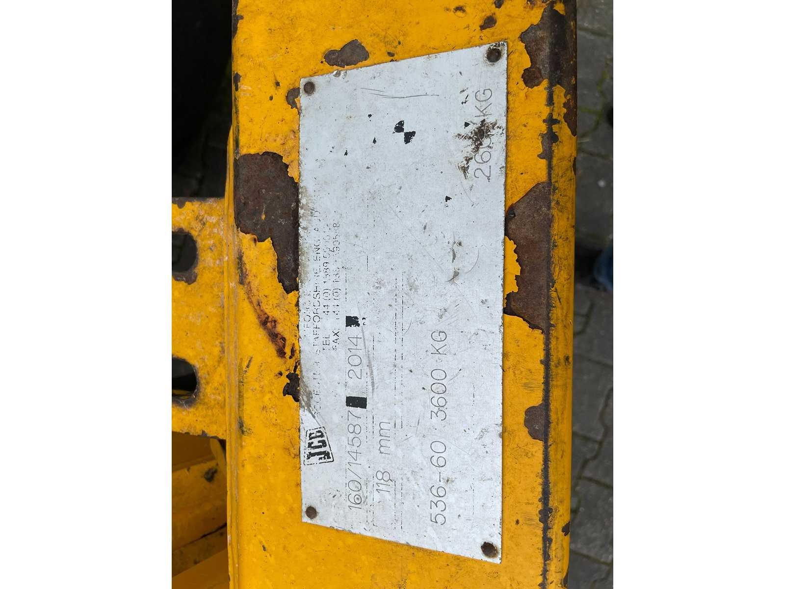 Voorzien van: gewicht 7150Kg, banden Vredestein Endurion 460/70R24, snelheid 40 km/u, transportlengte 4600mm, transport breedte 2300mm, transporthoogte 2500mm, motorfabrikant JCB, motortype EcoMax, motorvermogen 108 kW, tier 4i, hefhoogte 6200mm, laadvermogen 3,6 t, aux.functie langs giek, trekhaak voor-en achterzijde, hydraulische snelwissel JCB Q-Fit, werklampen, verlichting, mechanisch geveerde stoel, 4WD, 4WS, inching, joystick bediening, noodstop, armleuning, bovenraam ruitenwisser, Nee Merk: JCB Type: 536-60 Agri-Plus Bouwjaar: 2014 Serienummer: 2182322 Kenteken: trl20z Motorvermogen (kW): 108kW Hefvermogen: 3600kg Hefhoogte: 6200mm Cabine: true Vierwielaandrijving 4x4: true Luchtbanden: true Afgelezen urenstand: 11761 Eigen gewicht: 8200kg Totale afmeting L: 4600mm Totale afmeting Breedte: 2300mm