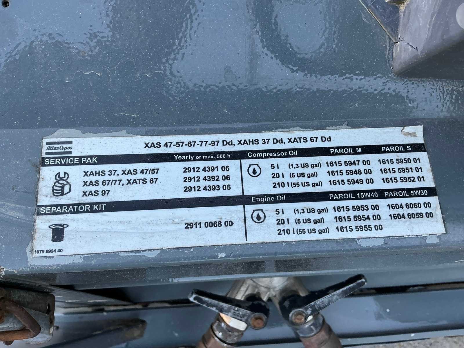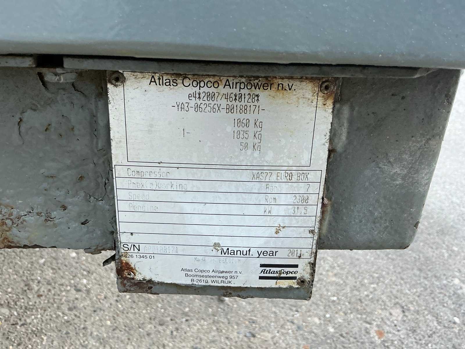 Voorzien van; luchtdroger, luchtkoeler, dubbele aansluiting, verlichting, geremd, hijsoog, stalen geluidsdempende kap, Deutz 4 cilindermotor Nee Merk: Atlas Copco Type: XAS 77 Bouwjaar: 2011 Serienummer: YA306256XB0188171 Mobiel: true Capaciteit.: 7bar Luchtstroom: 4300l/min Vermogen: 31.5kW Afgelezen urenstand: 2550hr Luchtdroger: true Eigen gewicht: 1100kg Totale afmeting L: 2900mm Totale afmeting Breedte: 1400mm Totale afmeting Hoogte: 1300mm