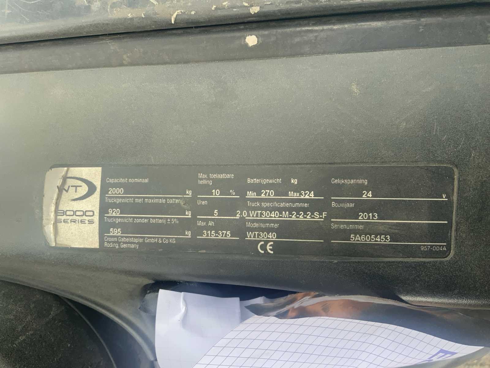 Met 2 laders Nee Merk: Crown Type: WT-3040 Bouwjaar: 2013 Serienummer: 5A605453 Hefvermogen: 2000kg Lepellengte: 1150mm Afgelezen urenstand: 8072 Eigen gewicht: 920kg Totale afmeting L: 1950mm Totale afmeting Breedte: 730mm Totale afmeting Hoogte: 1100mm Meerij stapelaar: true Accu lader: true