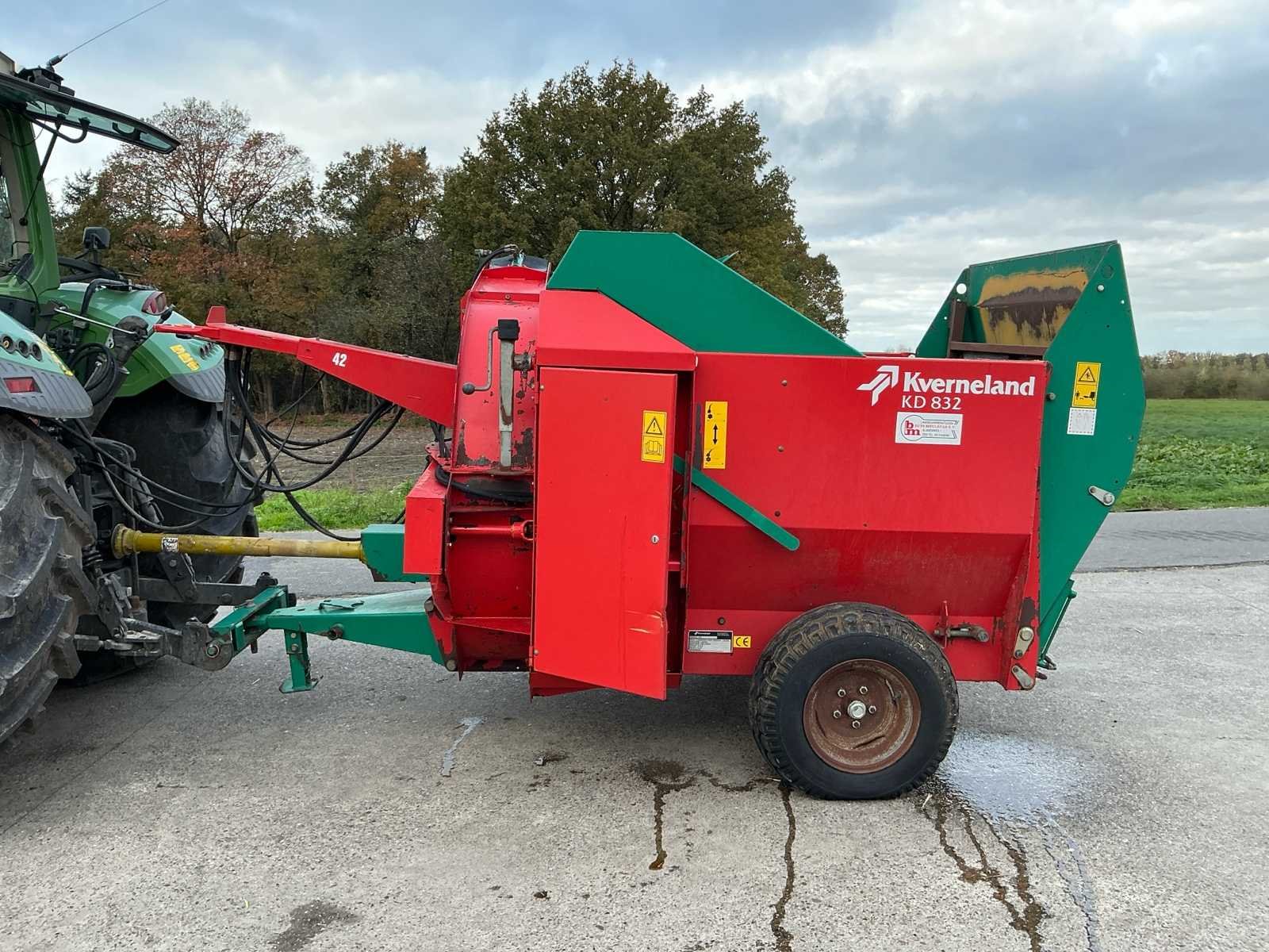 Voorzien van: Steun poten, De Kverneland KD 832 is een getrokken stro- en voerblazer met een inhoud van circa 3,5 m³, geschikt voor twee ronde of één grote vierkante baal, met een leeggewicht van ongeveer 1.750 kg en een maximaal totaalgewicht van 3.500 kg, aangedreven via aftakas (PTO 540 tpm), geschikt voor tractoren van 50–80 pk, voorzien van een hydraulisch bediende achterklep en een 270° draaibare uitblaasgoot die tot 12 meter kan blazen, met afmetingen van circa 3,7 × 2,0 × 2,4 meter, een enkelas-onderstel (al dan niet geremd) No Merk: Kverneland Kidd Type: 832 Serienummer: 102779 Opslag cap.: 3 Bandenmaat: 10.0/75-15.3 Eigen gewicht: 1750kg Totale afmeting L: 3700mm Totale afmeting Breedte: 2000mm Totale afmeting Hoogte: 2400mm