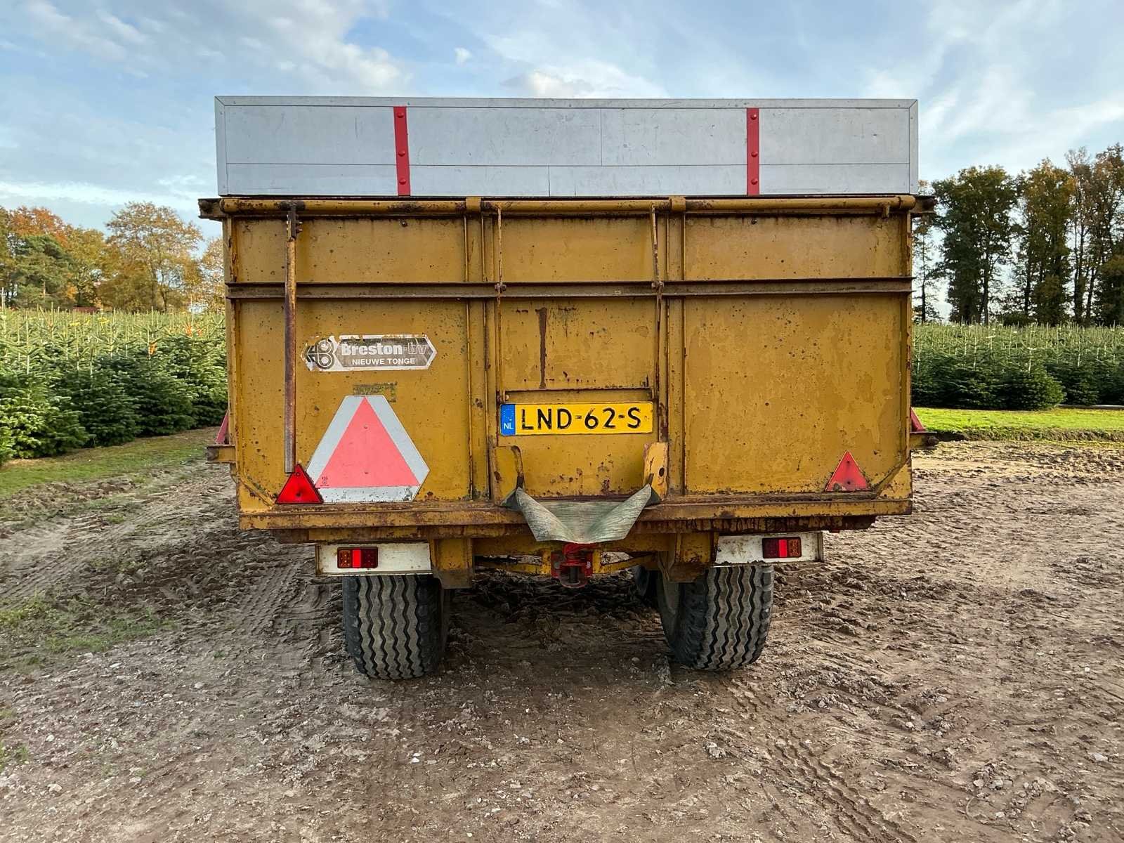 Voorzien van: hydraulische remmen, verlichting, Franse klep, graanschuif, trekhaak, hydraulische stempelpoot, schotten 300mm, aardappelkussen. Nee Merk: Breston Type: FKT-10 Serienummer: 3822 Kenteken: LND62S Opslag cap.: 10m³ Aantal assen: 2 Bandenmaat: 16.0/70-20 Totaal max. gewicht: 10t Hydraulische remmen: true Eigen gewicht: 2500kg Totale afmeting L: 6700mm Totale afmeting Breedte: 2450mm Totale afmeting Hoogte: 2600mm