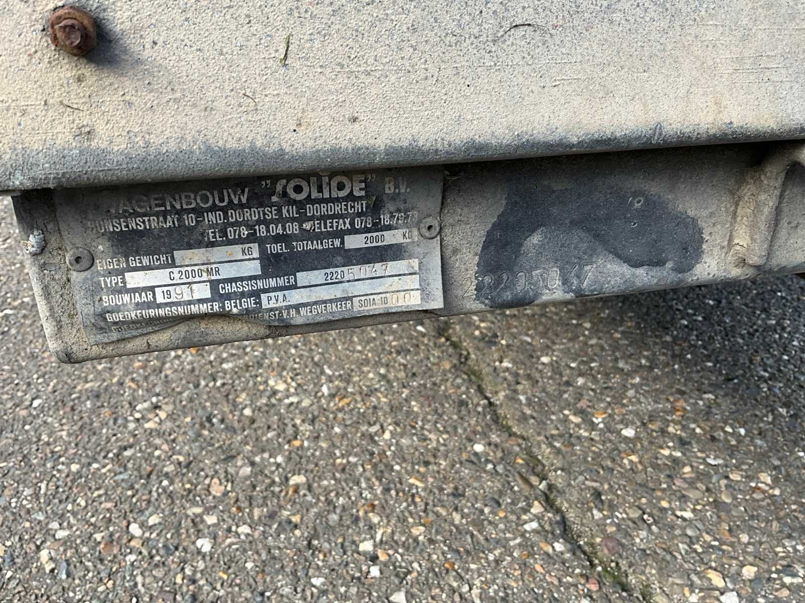 Oplooprem, 7-polige stekker 12V, reserveband Nee Merk: Solide Type: C2000MR Chassisnummer: 222047 Aantal assen: 2 Laadbak afmeting l: 300cm Laadbak afmeting b: 130cm Ledig gewicht: 440kg Laadvermogen: 1560kg Datum eerste toelating: 1991-10-02 Datum eerste toelating (NL): 1991-10-02 Kenteken: WG-98-TY Kentekenpapieren compleet?: true Hoogte: 140cm Lengte: 420cm Breedte: 185cm Nationaliteit documenten: Nederland Zelf rijdend exporteren: Yes