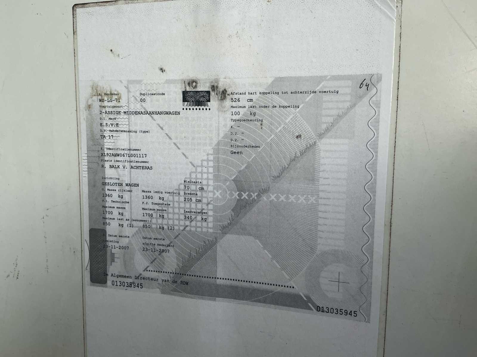 Keuring geldig tot Januari 2026 Nee Merk: E.S.V.E Type: TA17 Bouwjaar: 2007 Chassisnummer: XL92 HW0671001117 Aantal assen: 2 Ledig gewicht: 1360kg Laadvermogen: 340kg Datum eerste toelating: 2007-11-23 Datum eerste toelating (NL): 2007-11-23 Kenteken: WZLG71 Kentekenpapieren compleet?: true Hoogte: 270cm Lengte: 530cm Breedte: 205cm Nationaliteit documenten: Nederlandse