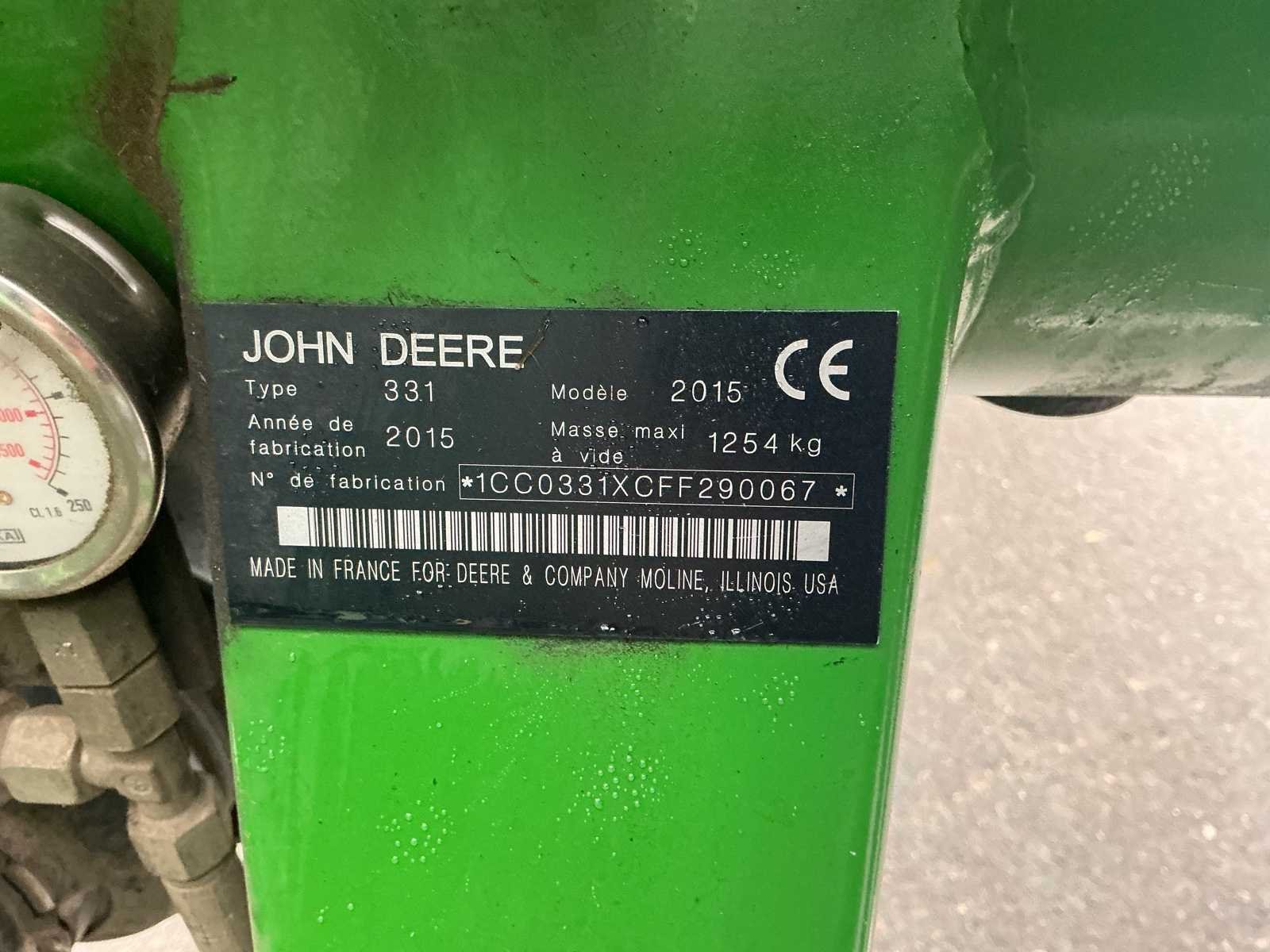 Maximaal 500 hectare in de afgelopen 5 jaar gemaaid Nee Merk: John Deere Type: 331 Bouwjaar: 2015 Serienummer: 1CC0331XCFF290067 Werkbreedte: 3100mm Totale afmeting L: 4800mm Totale afmeting Breedte: 2450mm Totale afmeting Hoogte: 1400mm Eigen gewicht: 1254kg