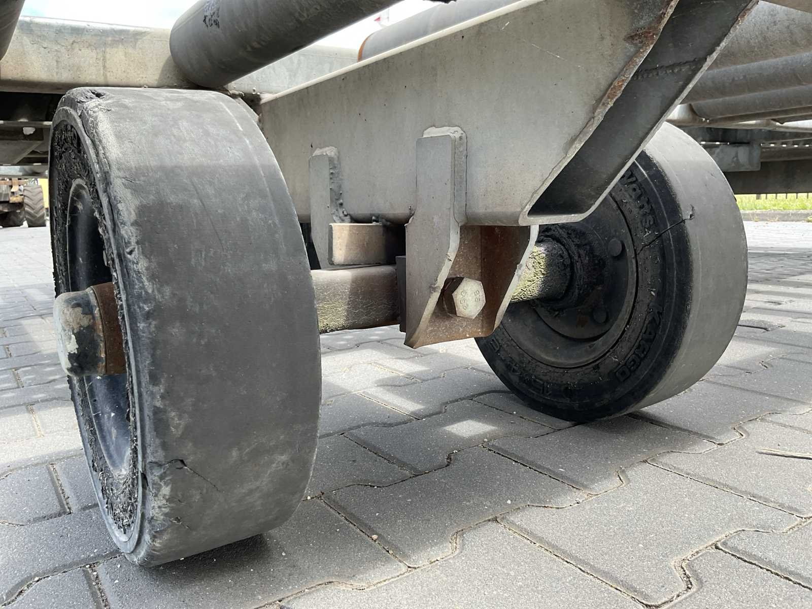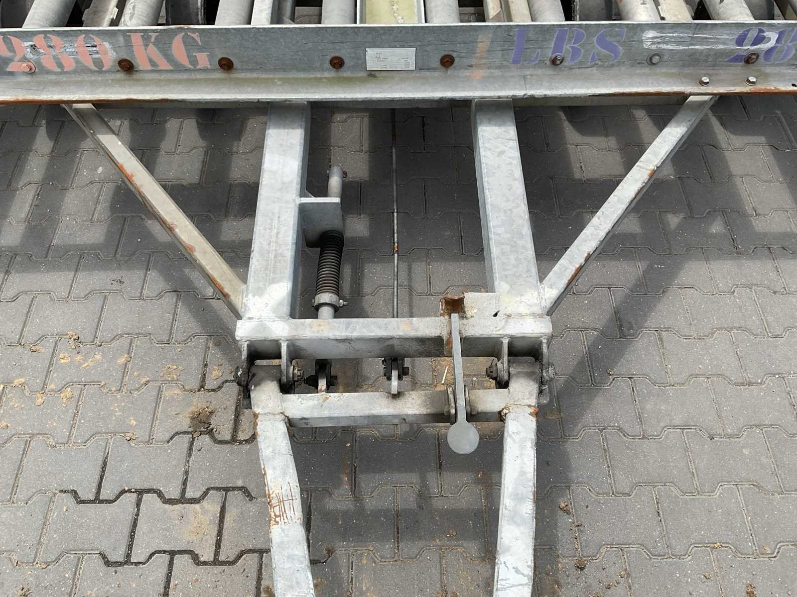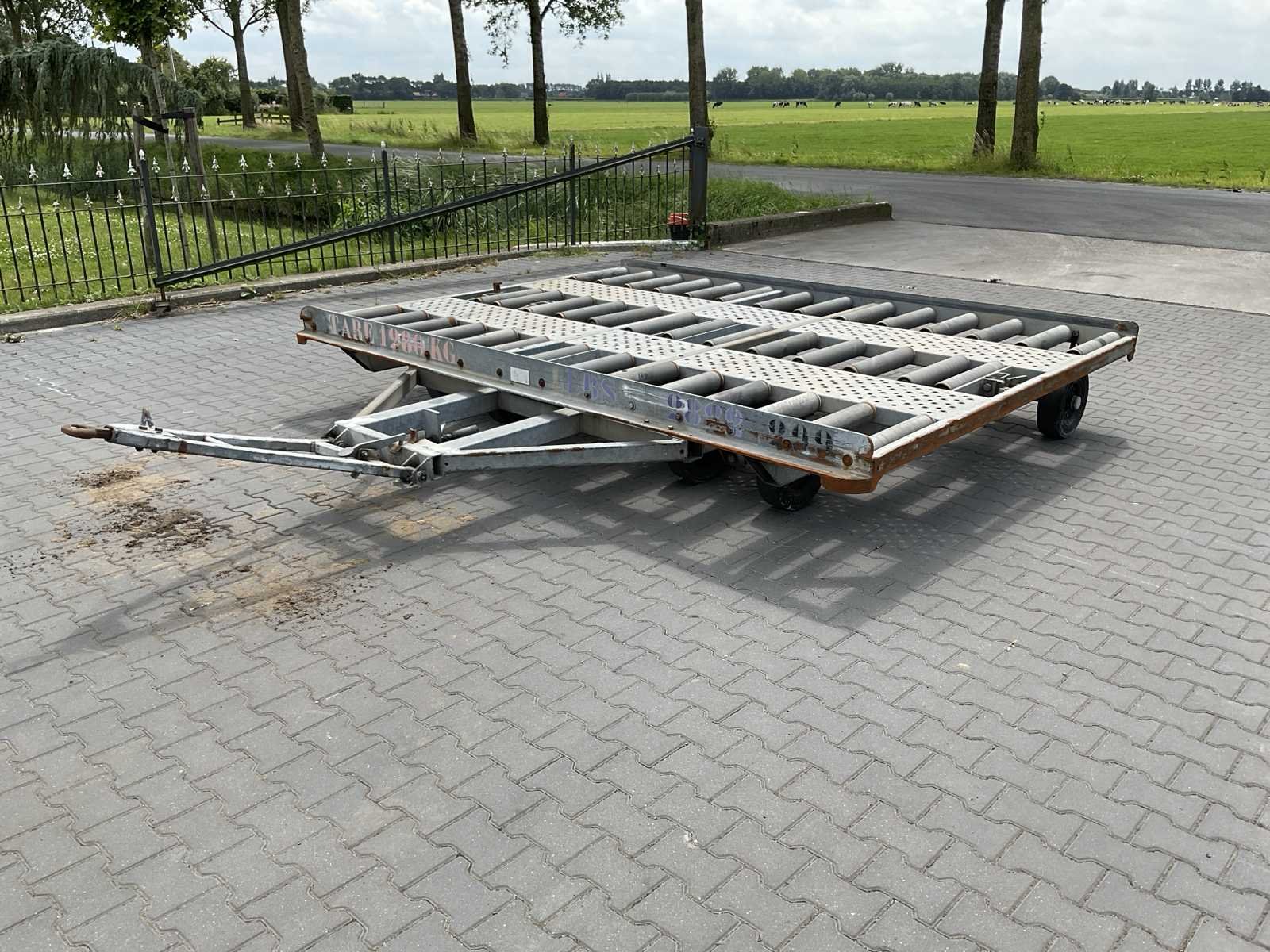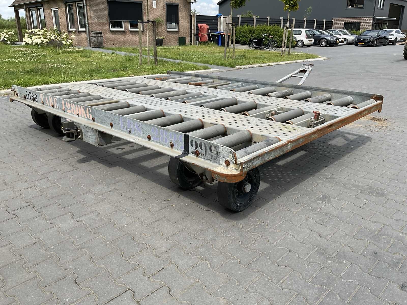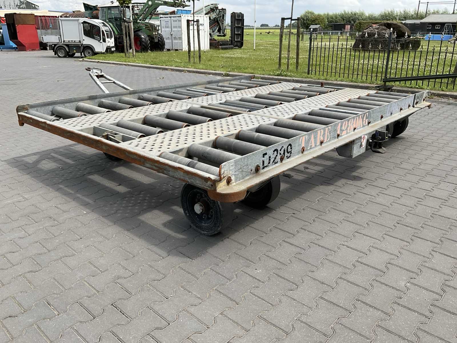 Stalen rollen, last vergrendel systeem, trekhaak aan achterzijde, volrubberen wielen met pendelas, triangel kan onder frame gedraaid worden voor wegtransport Nee Merk: TCG Type: PD1 FR01 Bouwjaar: 2004 Hefvermogen: 6800kg Afmeting l: 250cm Afmeting b: 355cm Afmeting h: 52cm Eigen gewicht: 1280kg Totale afmeting L: 4300mm Totale afmeting Breedte: 3550mm Totale afmeting Hoogte: 600mm