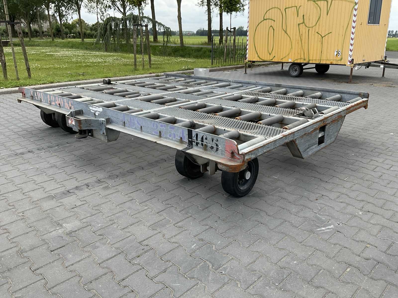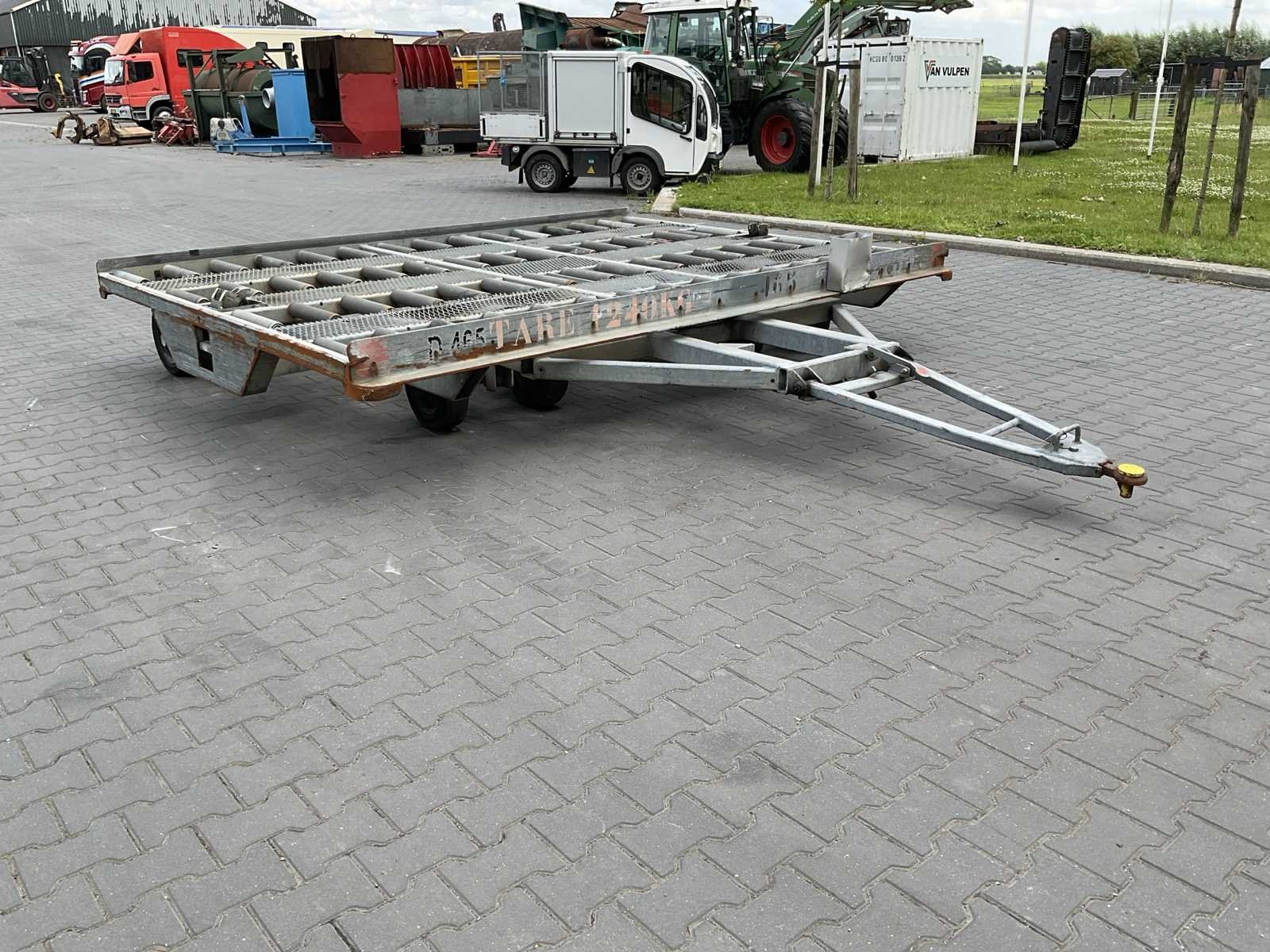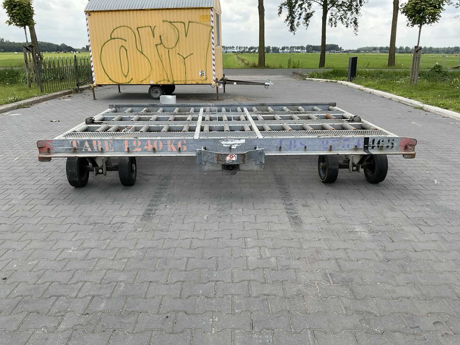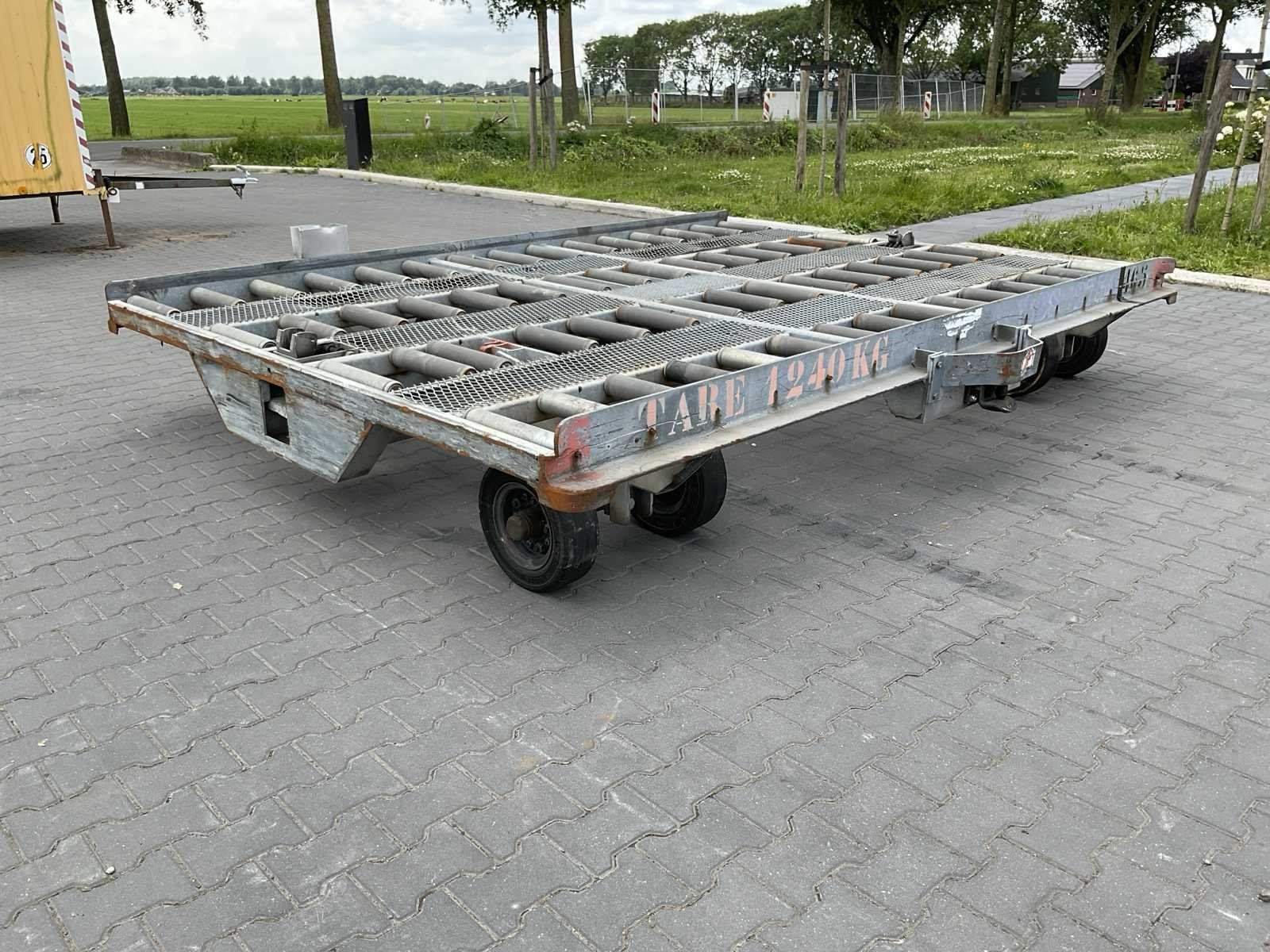 Stalen rollen, last vergrendel systeem, trekhaak aan achterzijde, volrubberen wielen met pendelas, triangel kan onder frame gedraaid worden voor wegtransport Nee Merk: TCG Type: PD1 FR01 Hefvermogen: 6800kg Afmeting l: 250cm Afmeting b: 355cm Afmeting h: 52cm Eigen gewicht: 1280kg Totale afmeting L: 4300mm Totale afmeting Breedte: 3550mm Totale afmeting Hoogte: 600mm