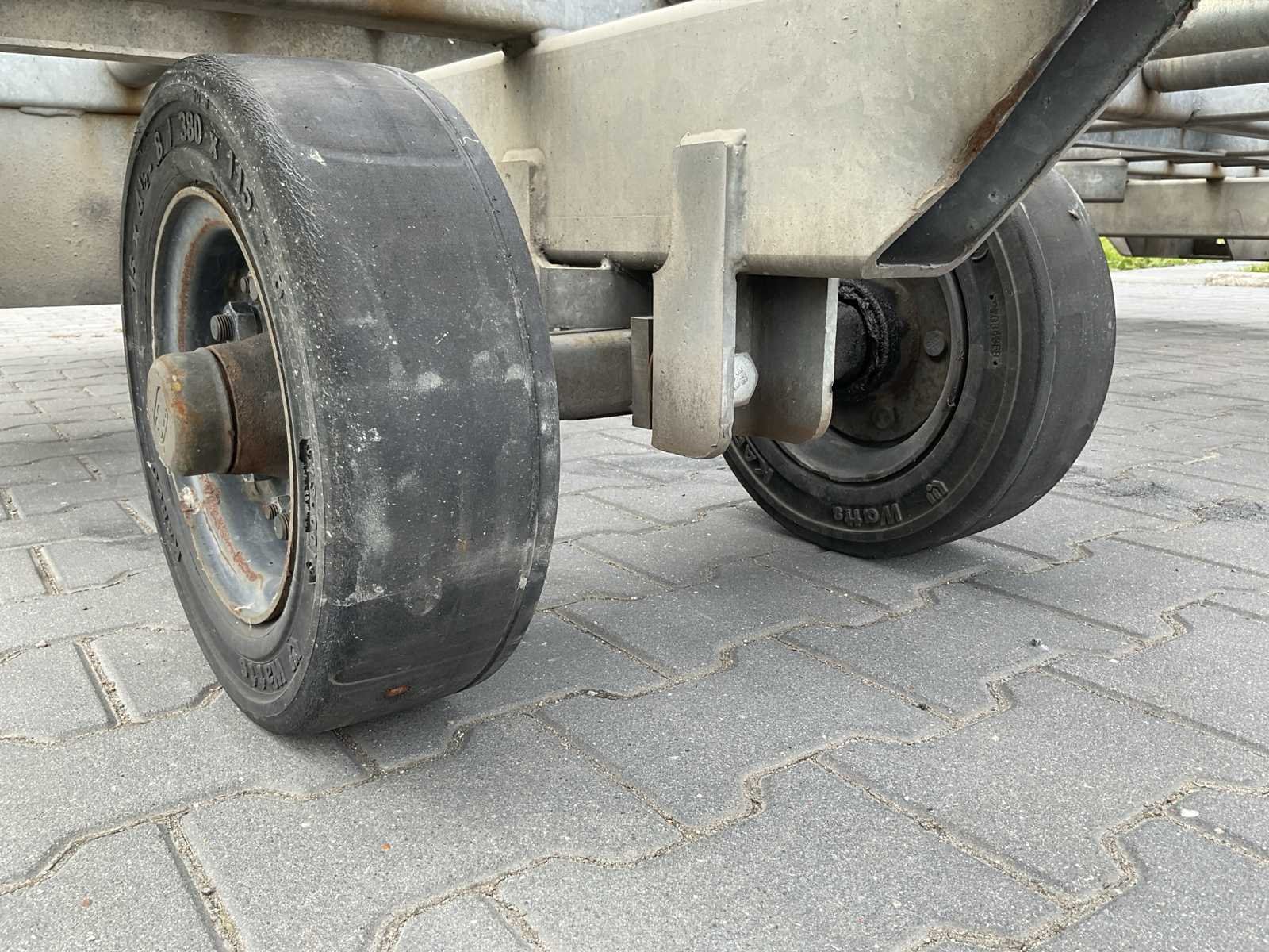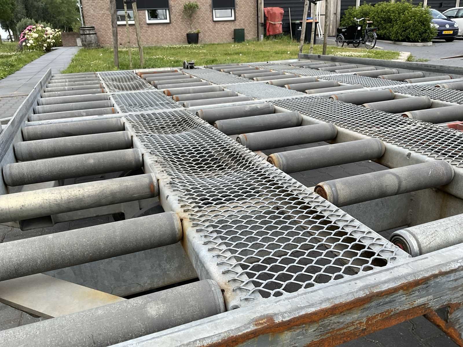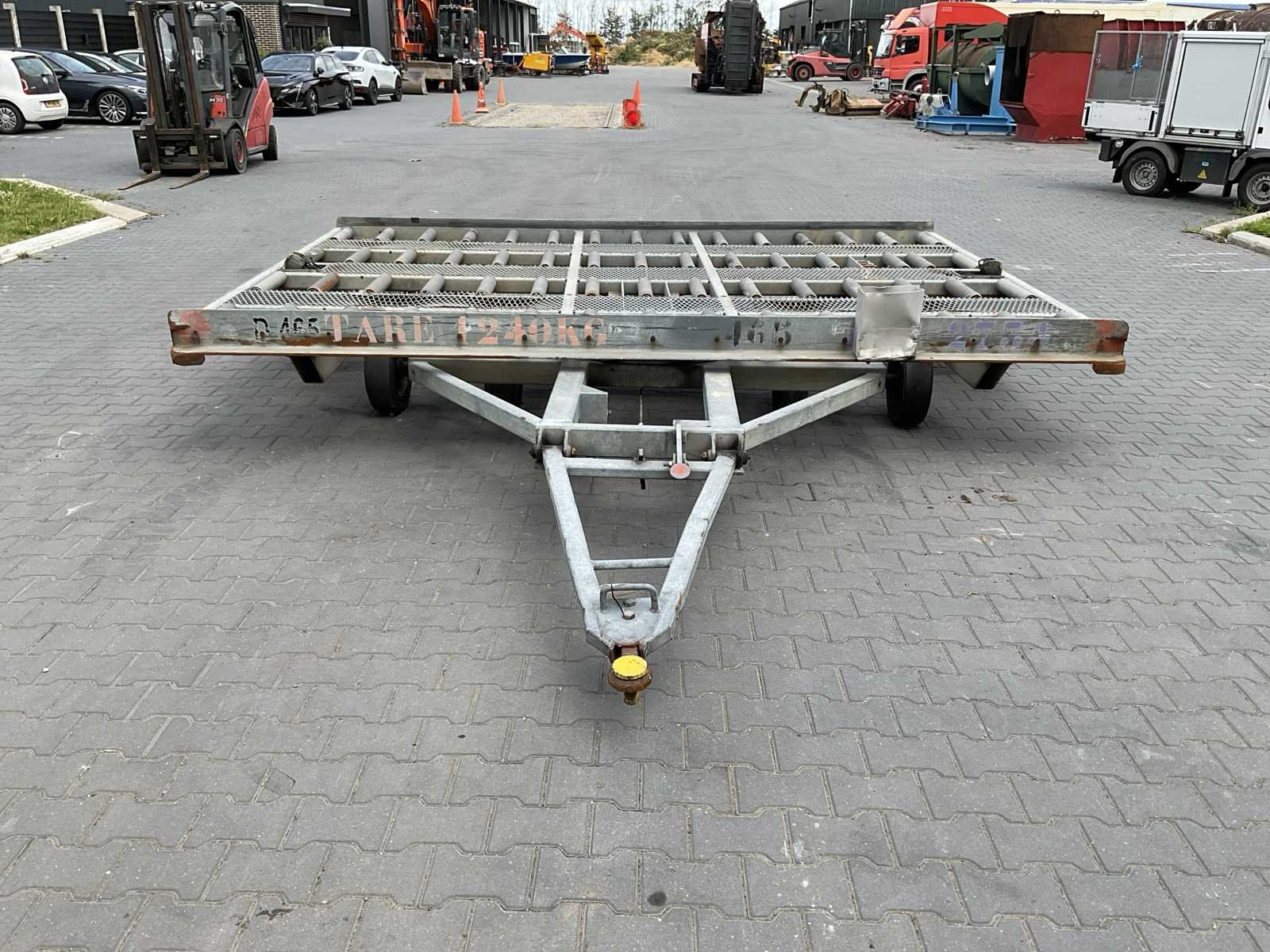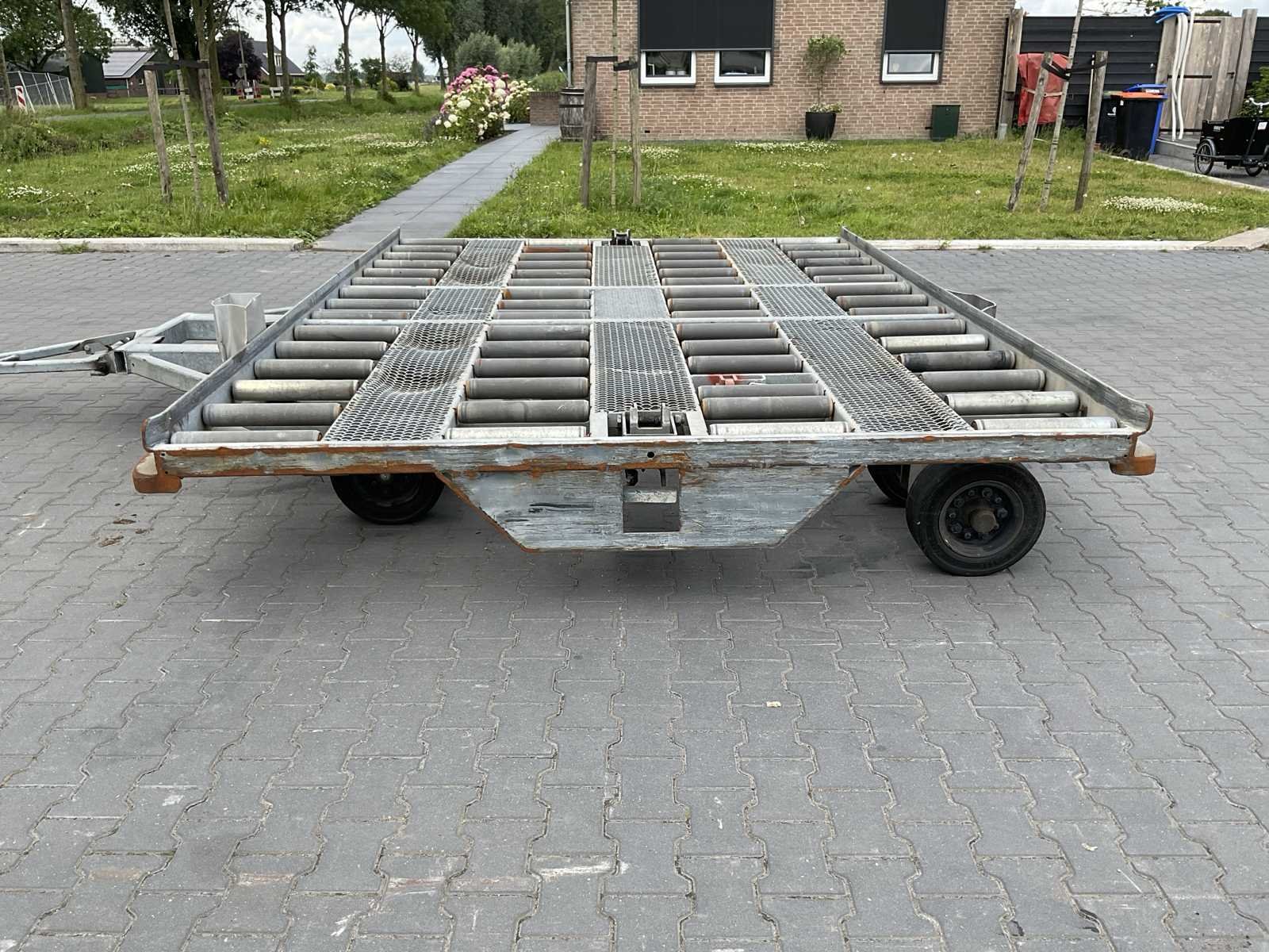 Stalen rollen, last vergrendel systeem, trekhaak aan achterzijde, volrubberen wielen met pendelas, triangel kan onder frame gedraaid worden voor wegtransport Nee Merk: TCG Type: PD1 FR01 Hefvermogen: 6800kg Afmeting l: 250cm Afmeting b: 355cm Afmeting h: 52cm Eigen gewicht: 1280kg Totale afmeting L: 4300mm Totale afmeting Breedte: 3550mm Totale afmeting Hoogte: 600mm