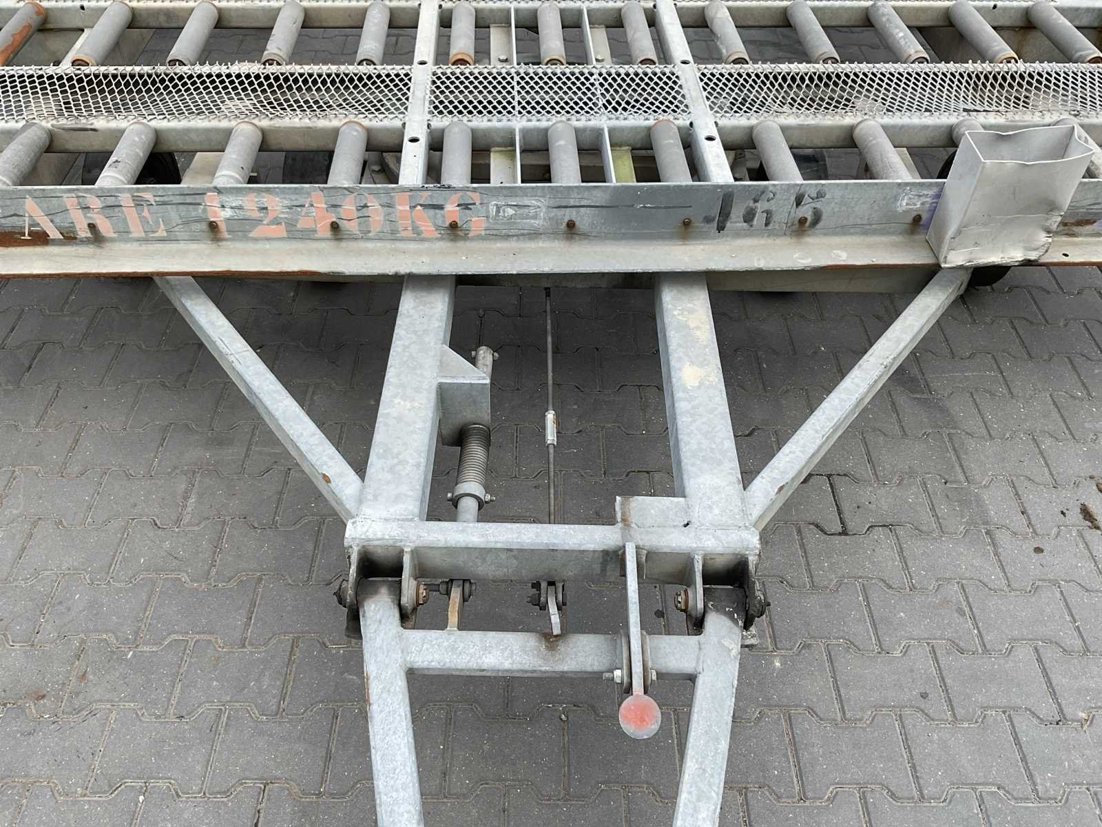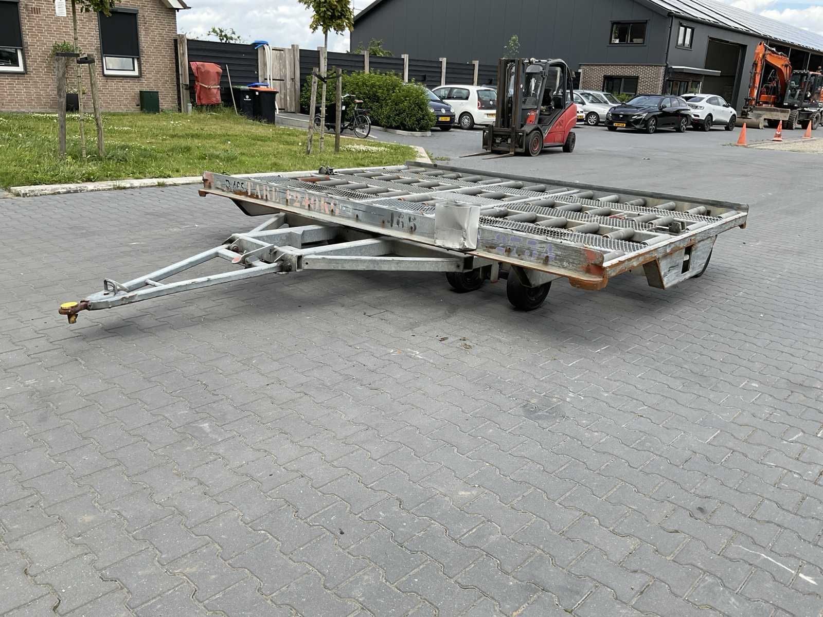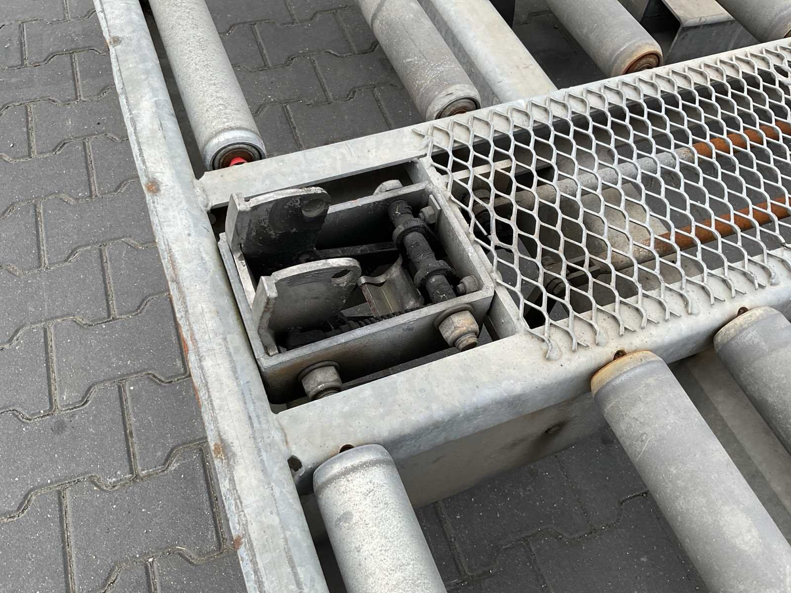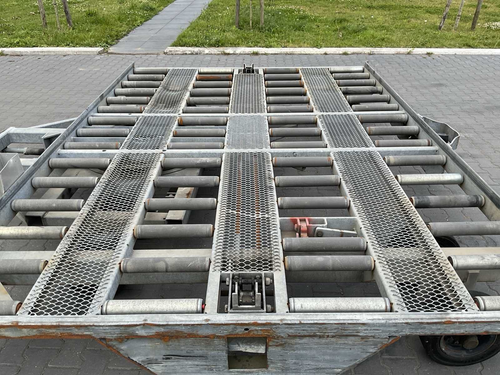 Stalen rollen, last vergrendel systeem, trekhaak aan achterzijde, volrubberen wielen met pendelas, triangel kan onder frame gedraaid worden voor wegtransport Nee Merk: TCG Type: PD1 FR01 Hefvermogen: 6800kg Afmeting l: 250cm Afmeting b: 355cm Afmeting h: 52cm Eigen gewicht: 1280kg Totale afmeting L: 4300mm Totale afmeting Breedte: 3550mm Totale afmeting Hoogte: 600mm