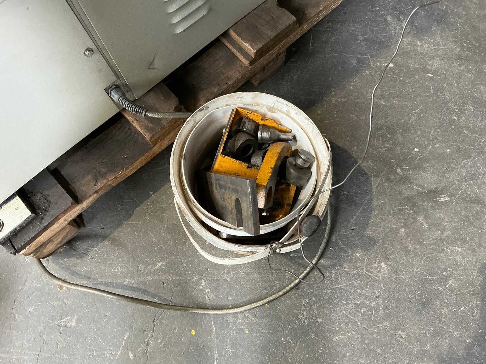 Steel round: 40mm Steel flat: 200x20mm / 300x15mm Notching + Punching + cutting Video available! No Merk: Sahinler Type: HKM-60 Bouwjaar: 2017 Serienummer: 155976 Ponskracht: 60kN Voetbediening: true Motorvermogen (kW): 4kW Machinegewicht: 1400kg Afmeting l: 1500mm Afmeting b: 900mm Afmeting h: 1700mm