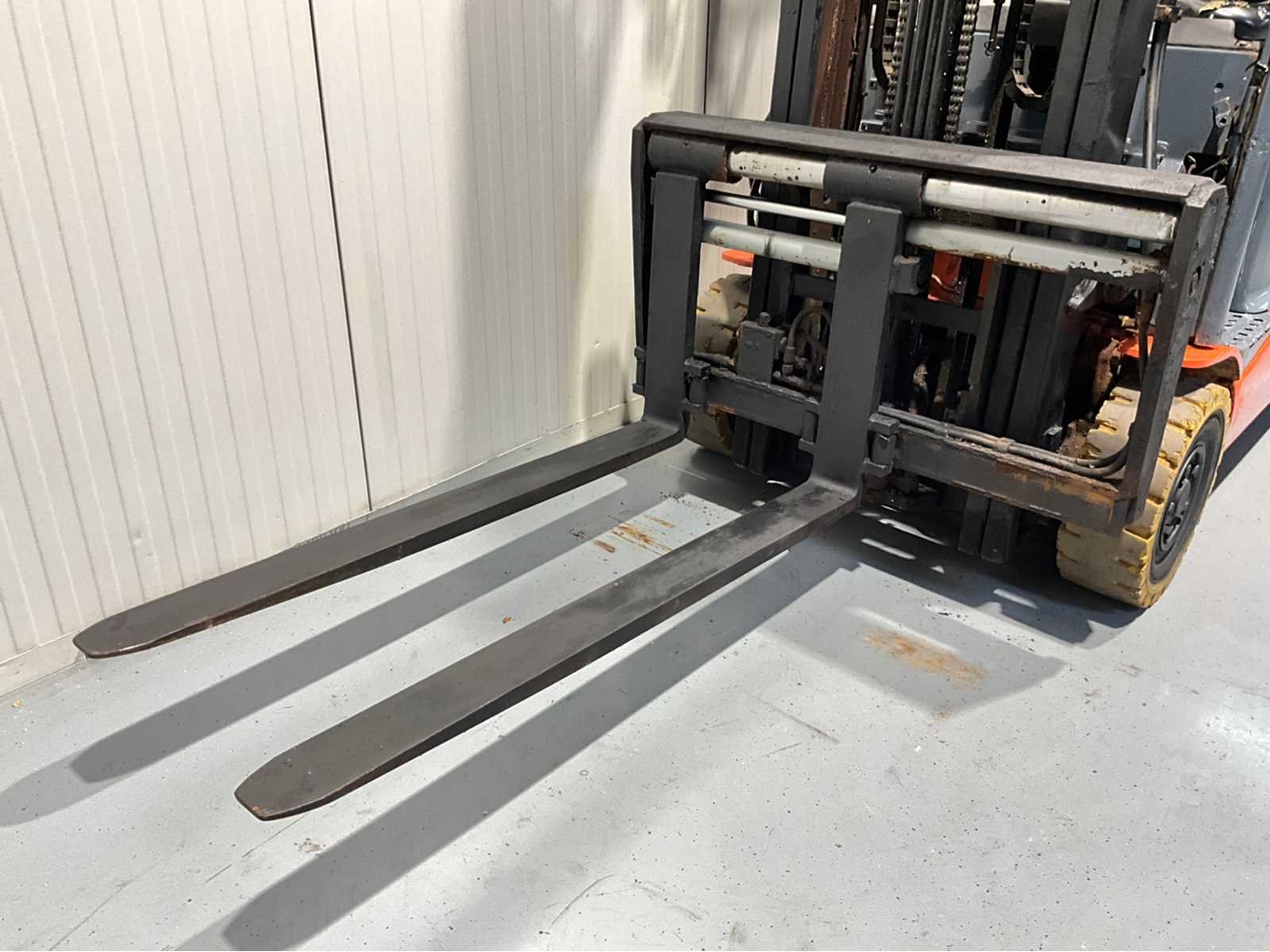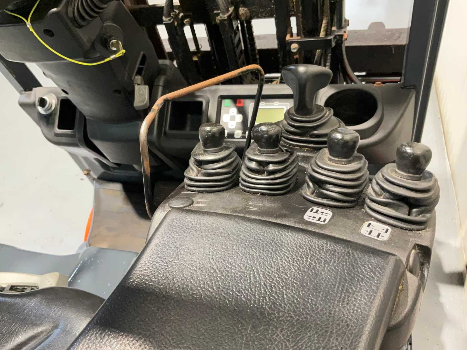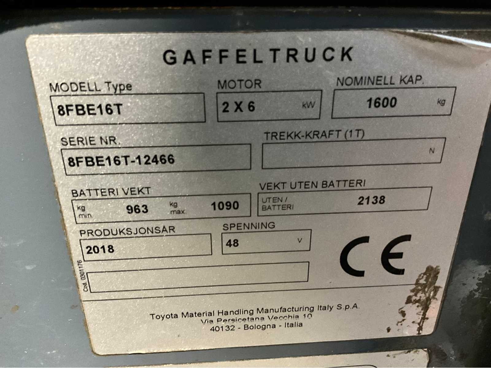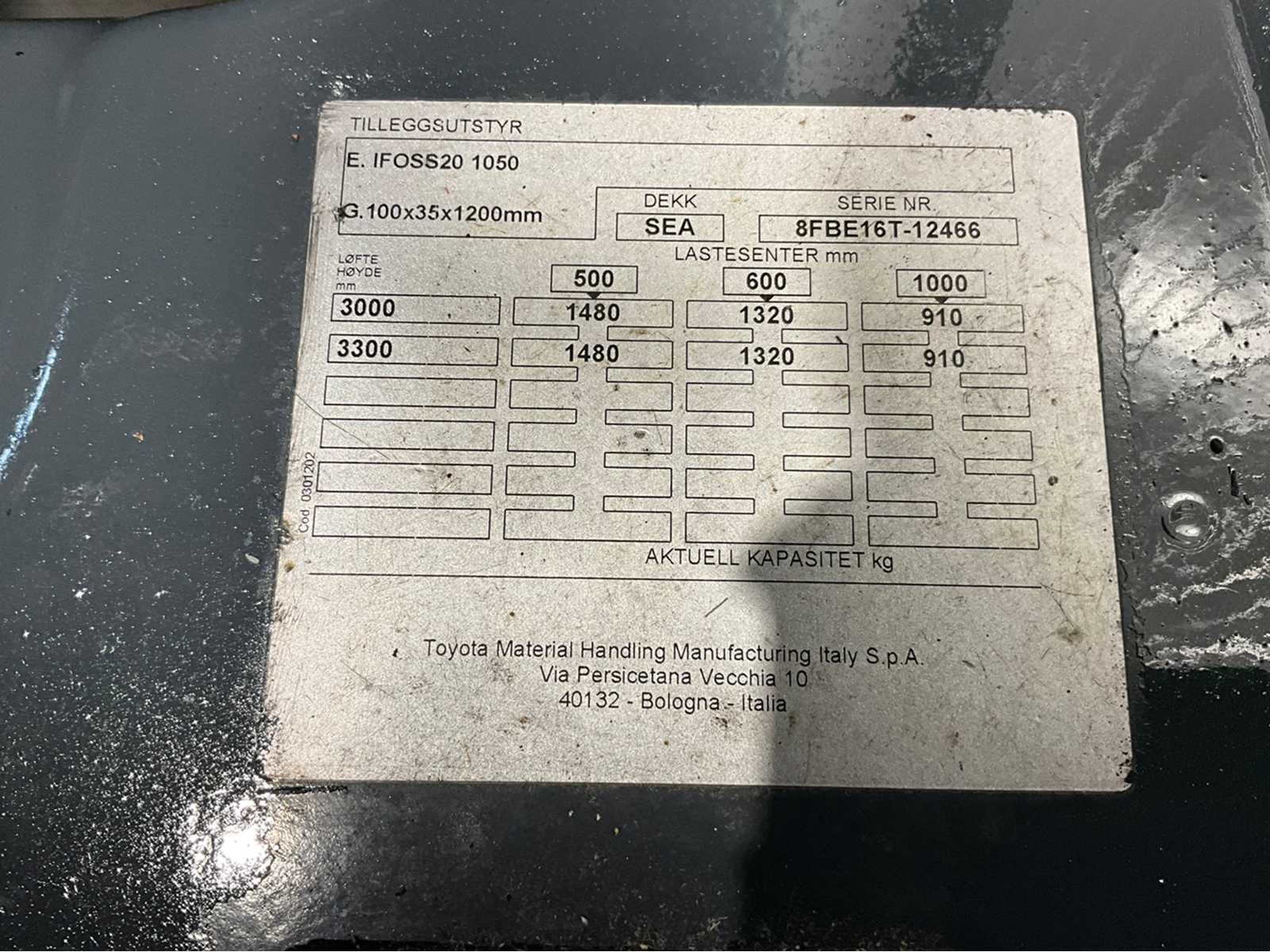 Non marking banden Nee Merk: Toyota Type: 8FBE16T Bouwjaar: 2018 Serienummer: 12466 Brandstof: elektrisch Soort band: Volrubber banden Aantal wielen: 3 Free-lift: true Side-shift: true Hydraulisch verstelbare lepels: true Duplex mast: true Hefvermogen: 1600kg Lepellengte: 1200mm Max. hefhoogte: 3350mm Hefhoogte: 3350mm Vol rubber banden: true Minimale doorrijhoogte: 2150mm Totale afmeting L: 3300mm Totale afmeting Breedte: 1050mm Totale afmeting Hoogte: 2150mm