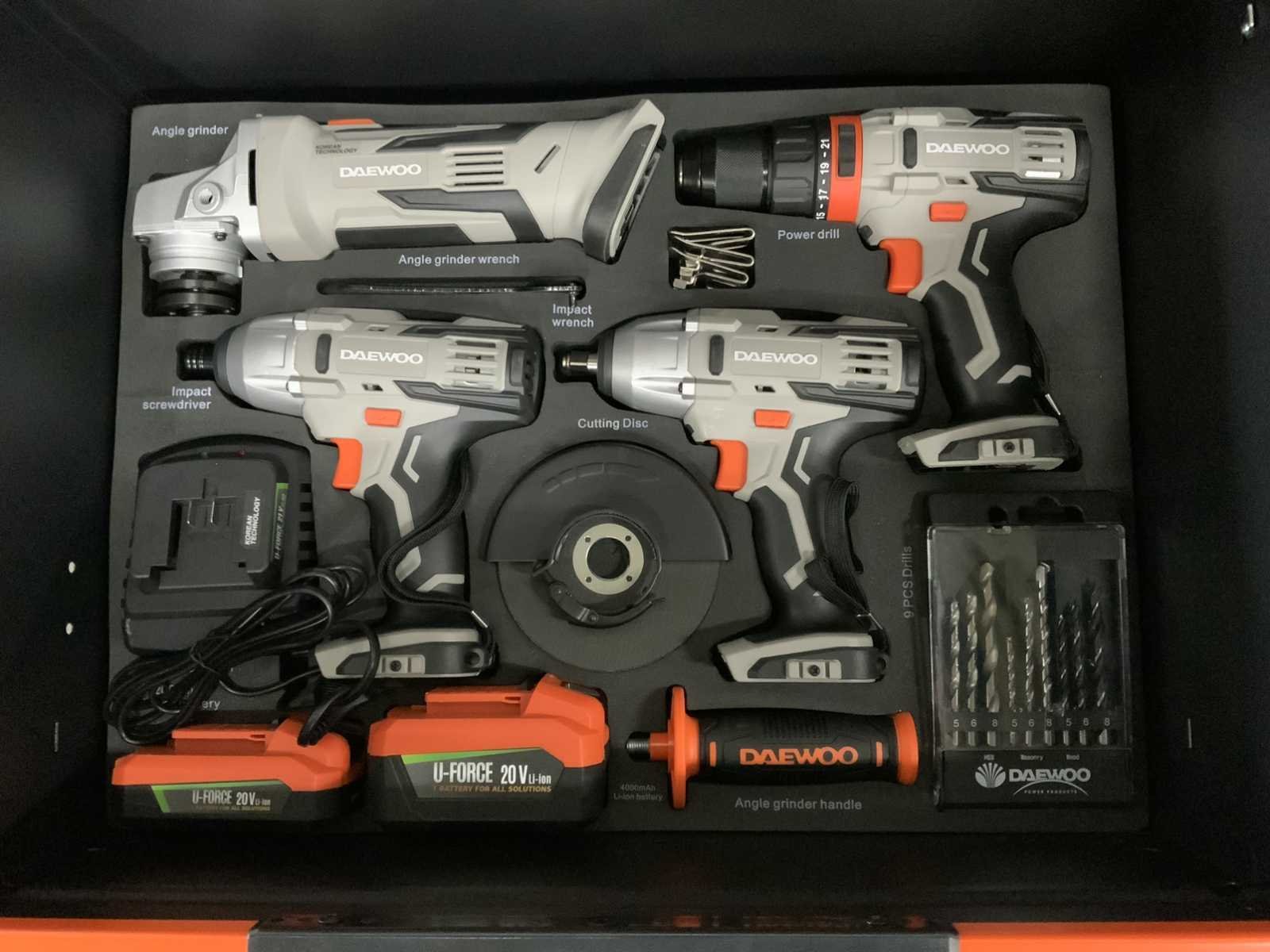 13 laden waarvan 11 gevuld, 267 pcs. Inclusief: set 4 in 1 accugereedschap: schroef-boormachine, haakse slijper met inlay 4 slijpschijven, slag moer machine, moerklopper, set boortjes, accu lader. Ongebruikt. Nee Merk: Daewoo Type: DAMWS267 + 4 in 1 set Bouwjaar: 2025 Aantal laden: 13 Met inhoud: true Totale afmeting L: 1060mm Totale afmeting Breedte: 570mm Totale afmeting Hoogte: 1100mm
