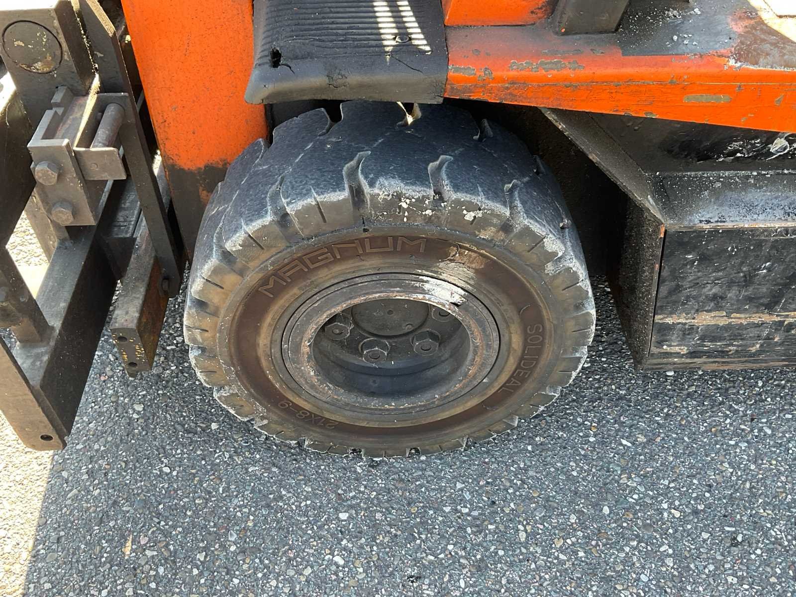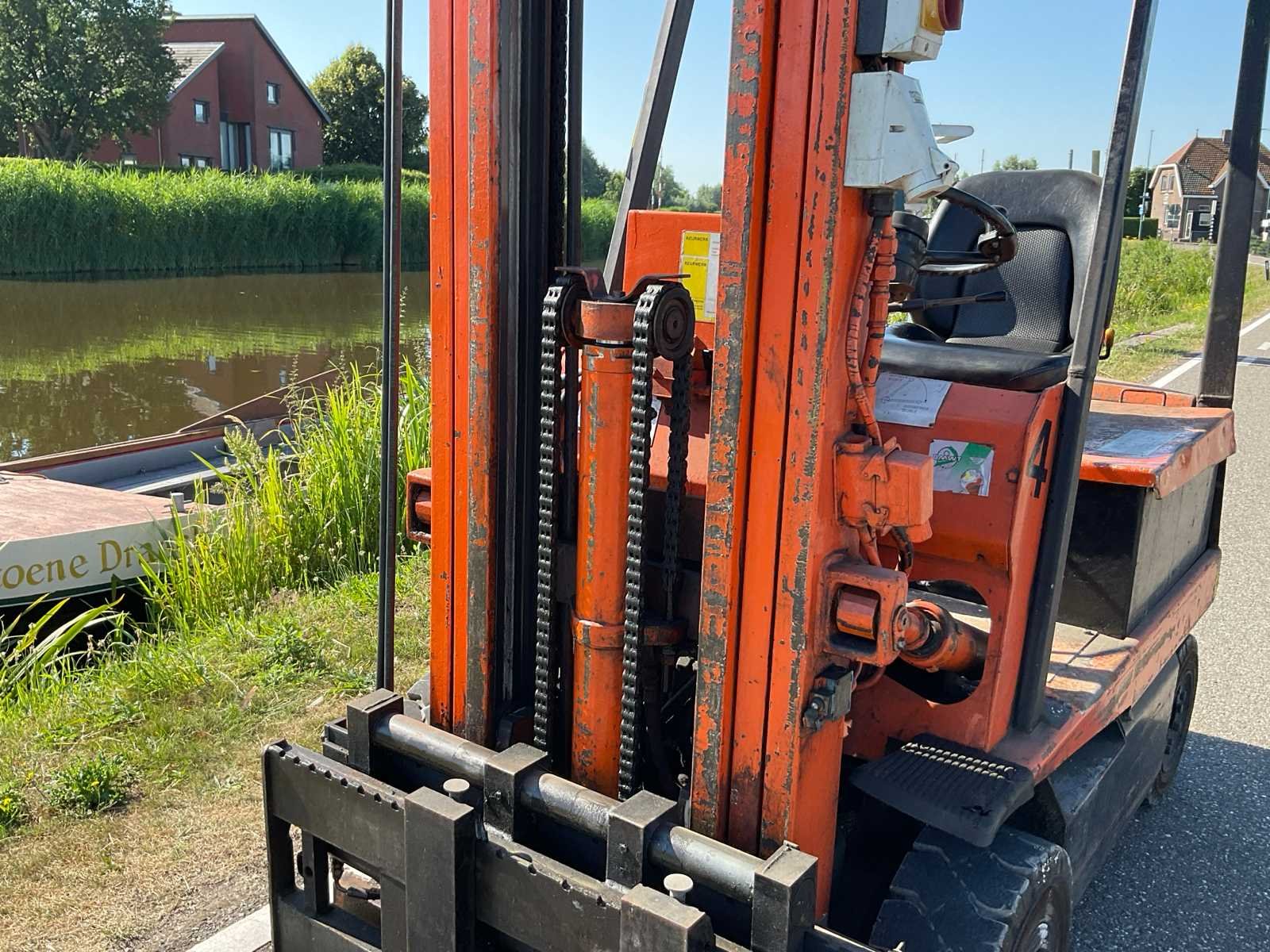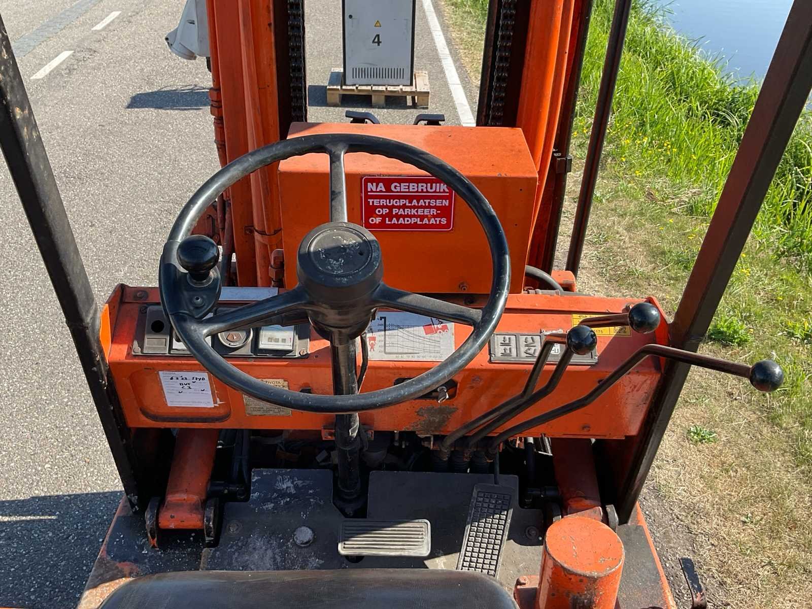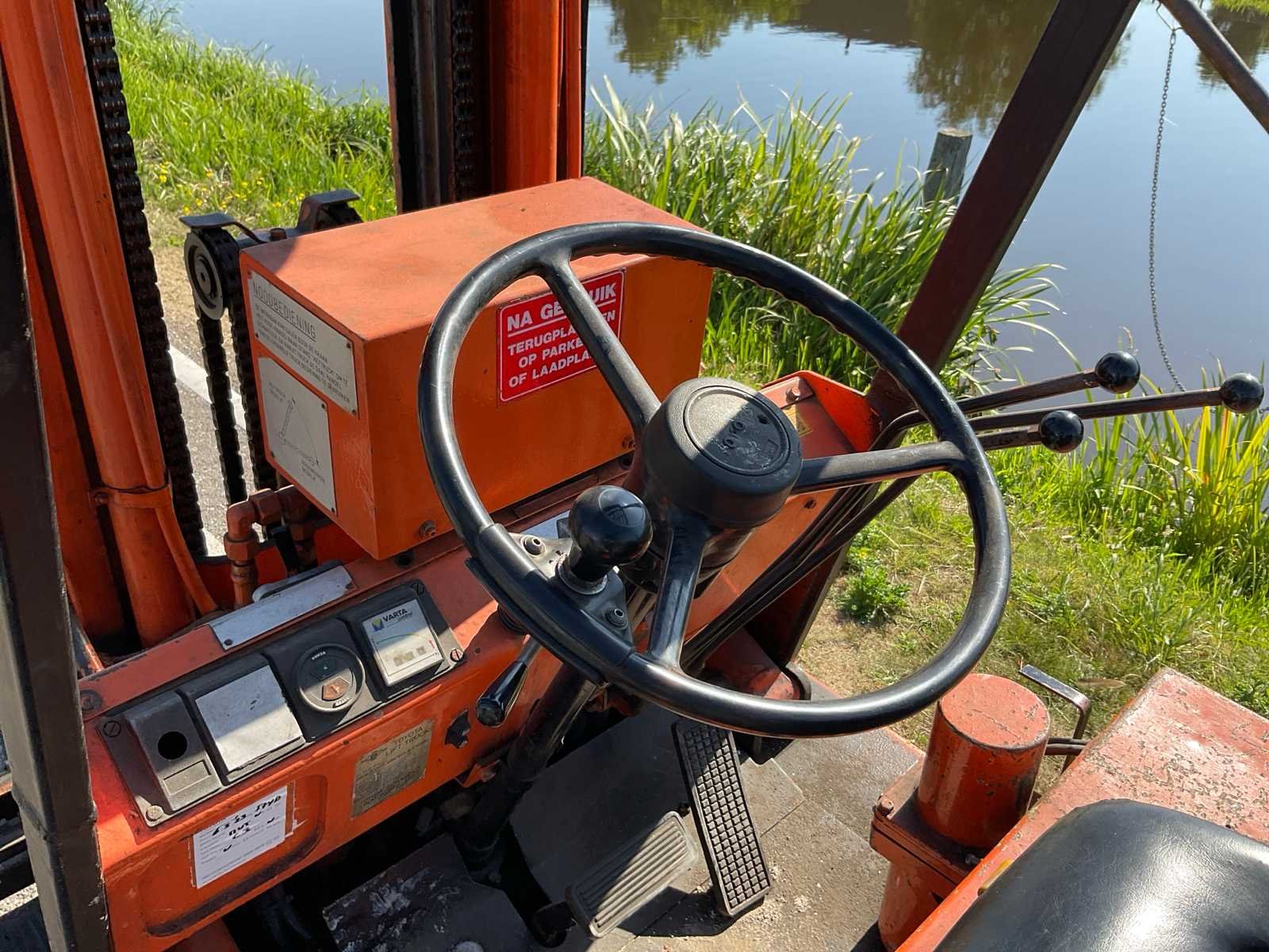 Nee Merk: Toyota Type: 4FB25 Bouwjaar: 1987 Serienummer: FSV Brandstof: Elektrisch Mast: Triple Soort band: Volrubber banden Aantal wielen: 4 Accu lader: true Free-lift: true Side-shift: true Triple mast: true Eigen gewicht: 3260kg Hefvermogen: 1650kg Lepellengte: 1150mm Max. hefhoogte: 5000mm Vol rubber banden: true Minimale doorrijhoogte: 2250mm