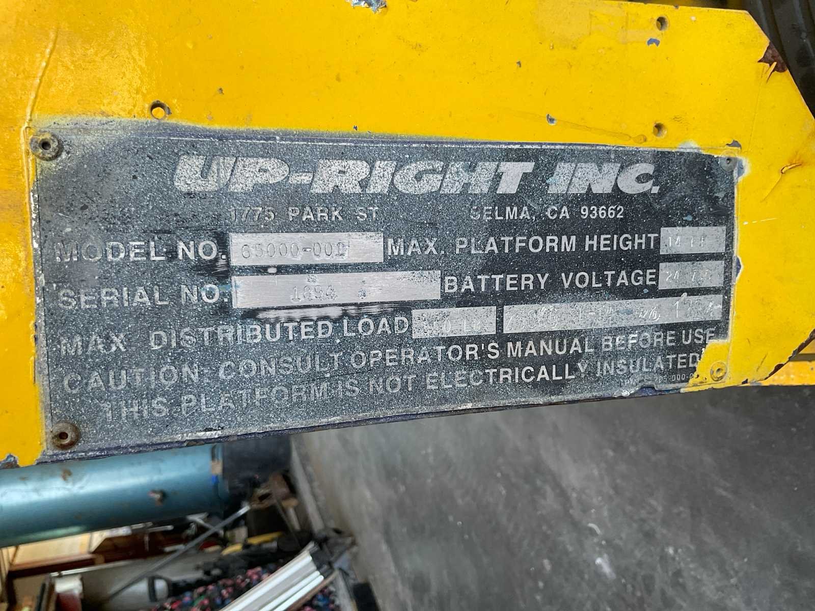 Hoogwerker is niet werkend, onbekend defect Nee Merk: Upright Type: 65000-001 Bouwjaar: 1994 Serienummer: 1889 Elektrisch: true Schaarhoogwerker: true Horizontale rijkwijdte: 700mm Plateau afm. l: 150mm Plateau afm. b: 650mm Platform capaciteit: 115kg Totale afmeting L: 1750mm Totale afmeting Breedte: 750mm Totale afmeting Hoogte: 2000mm