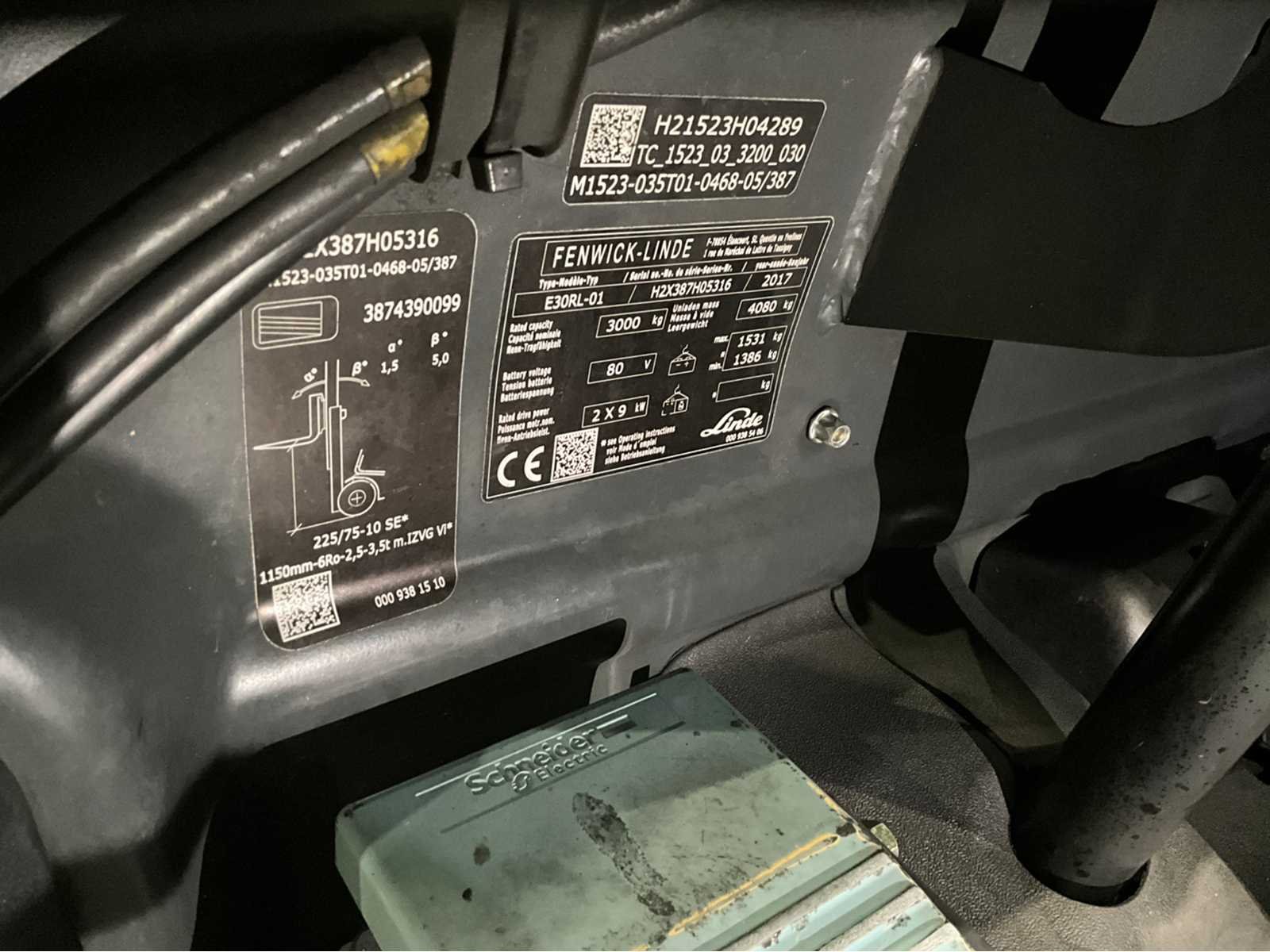 Extra opties : Blue spot achter , elektrische handrem , joystick Nee Merk: Linde Type: E30RL-01 Bouwjaar: 2017 Serienummer: H2X387H05316 Soort band: Volrubber banden Aantal wielen: 4 Free-lift: true Side-shift: true Hydraulisch verstelbare lepels: true Triple mast: true Eigen gewicht: 5611kg Hefvermogen: 3000kg Hefhoogte: 4680mm Vol rubber banden: true Totale afmeting L: 3760mm Totale afmeting Breedte: 1140mm Totale afmeting Hoogte: 2210mm