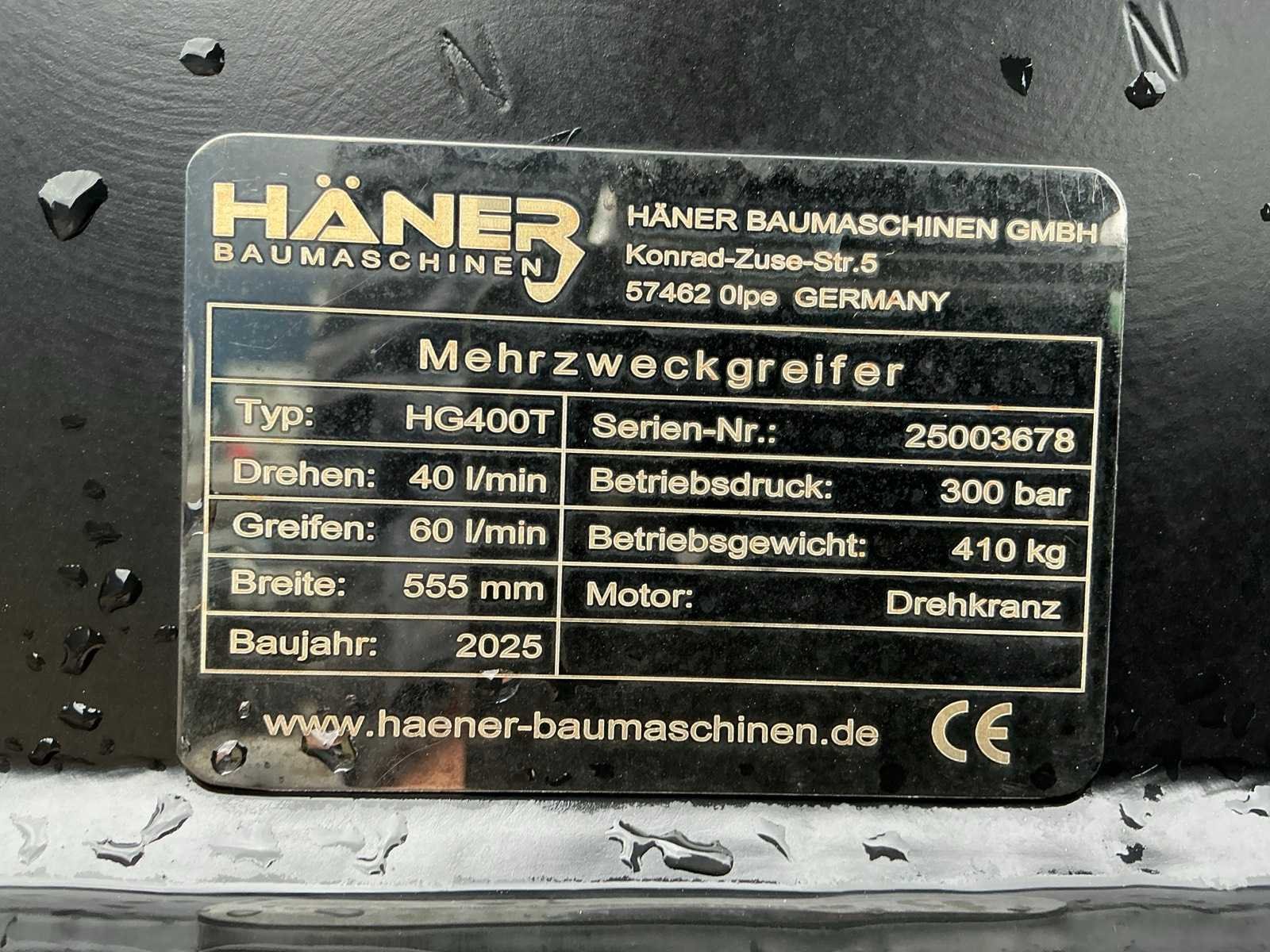 Voorzien van hydraulische rotatiefunctie. Arbeidsdruk 300 Bar, werkbreedte 55,5 cm, olievolumestroom 40 l/min. (draaien/roteren) / 60 l/min. (grijpen) No Merk: Häner Baumaschinen Type: HG400T Bouwjaar: 2025 Eigen gewicht: 410kg Totale afmeting Breedte: 555mm