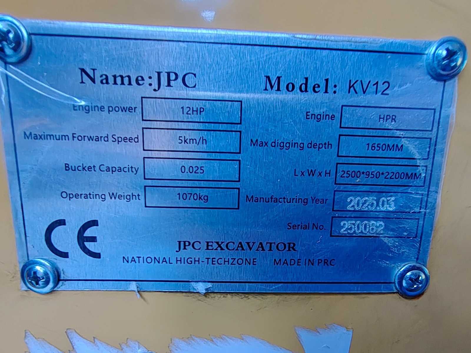 Ongebruikte minigraafmachine Nee Merk: JPC Type: KV12 Bouwjaar: 2025 Serienummer: 250082 Merk motor: HPR Motorvermogen (kW): 8kW Aantal cilinders: 1 Brandstof: Diesel Bedrijfsgewicht: 1070kg Inclusief graafbak: ja Afgelezen urenstand: 0.3 Eigen gewicht: 1070kg Totale afmeting L: 2500mm Totale afmeting Breedte: 950mm Totale afmeting Hoogte: 2200mm