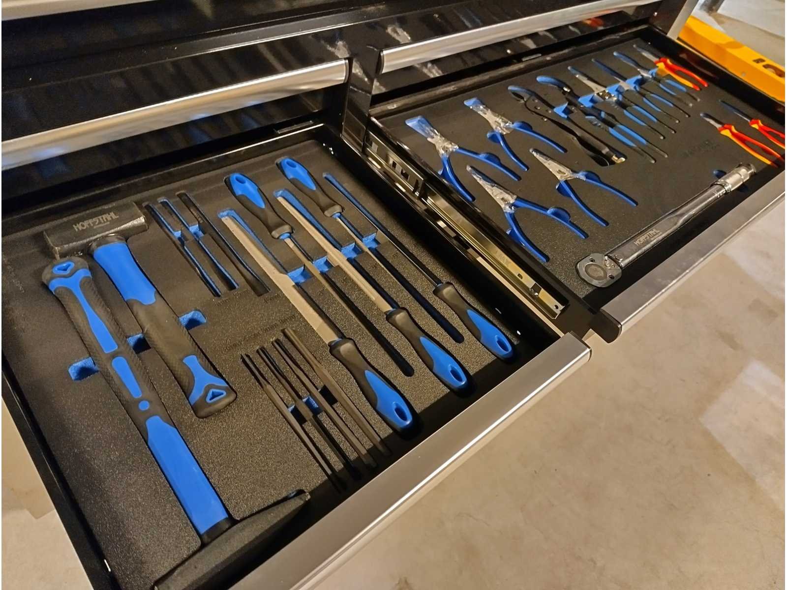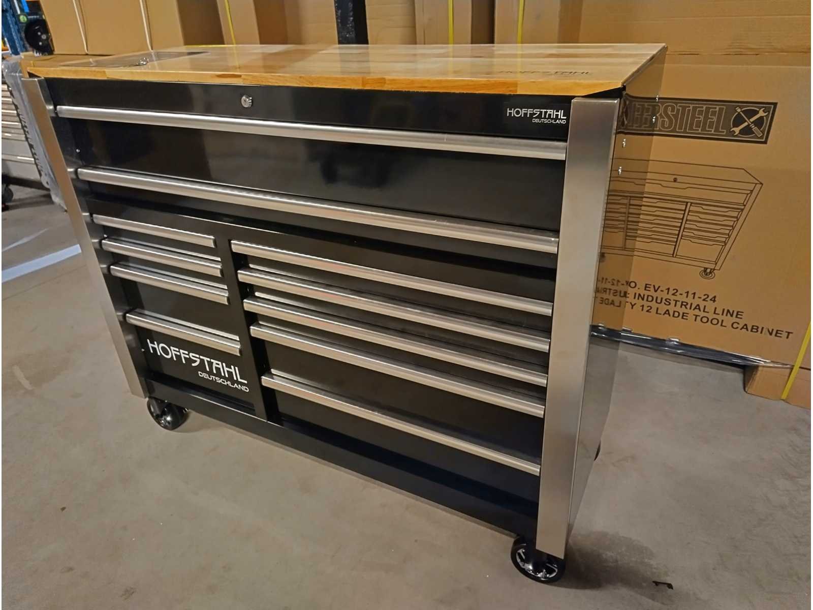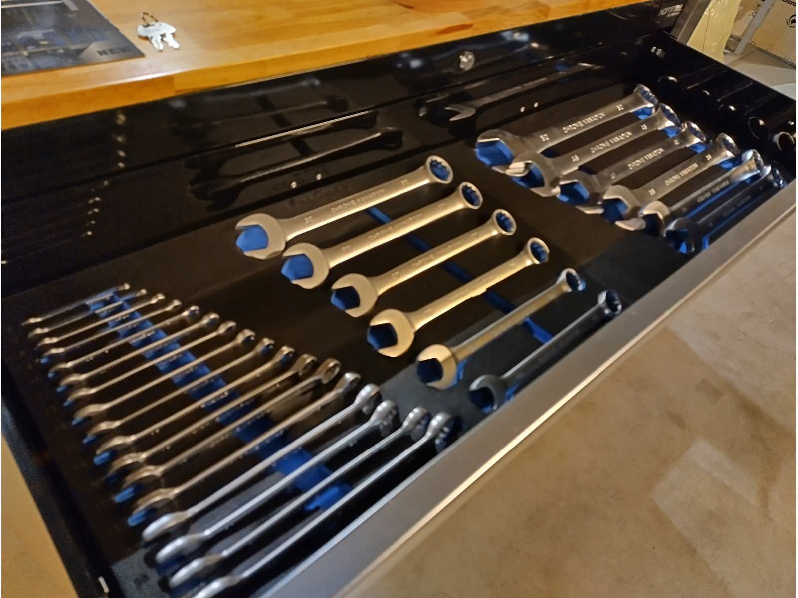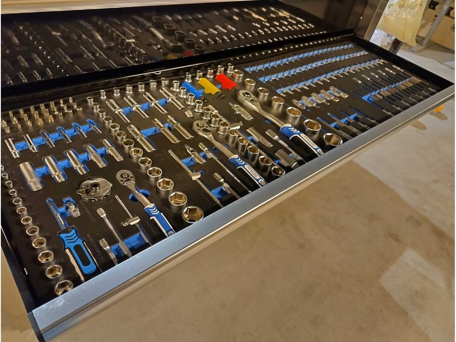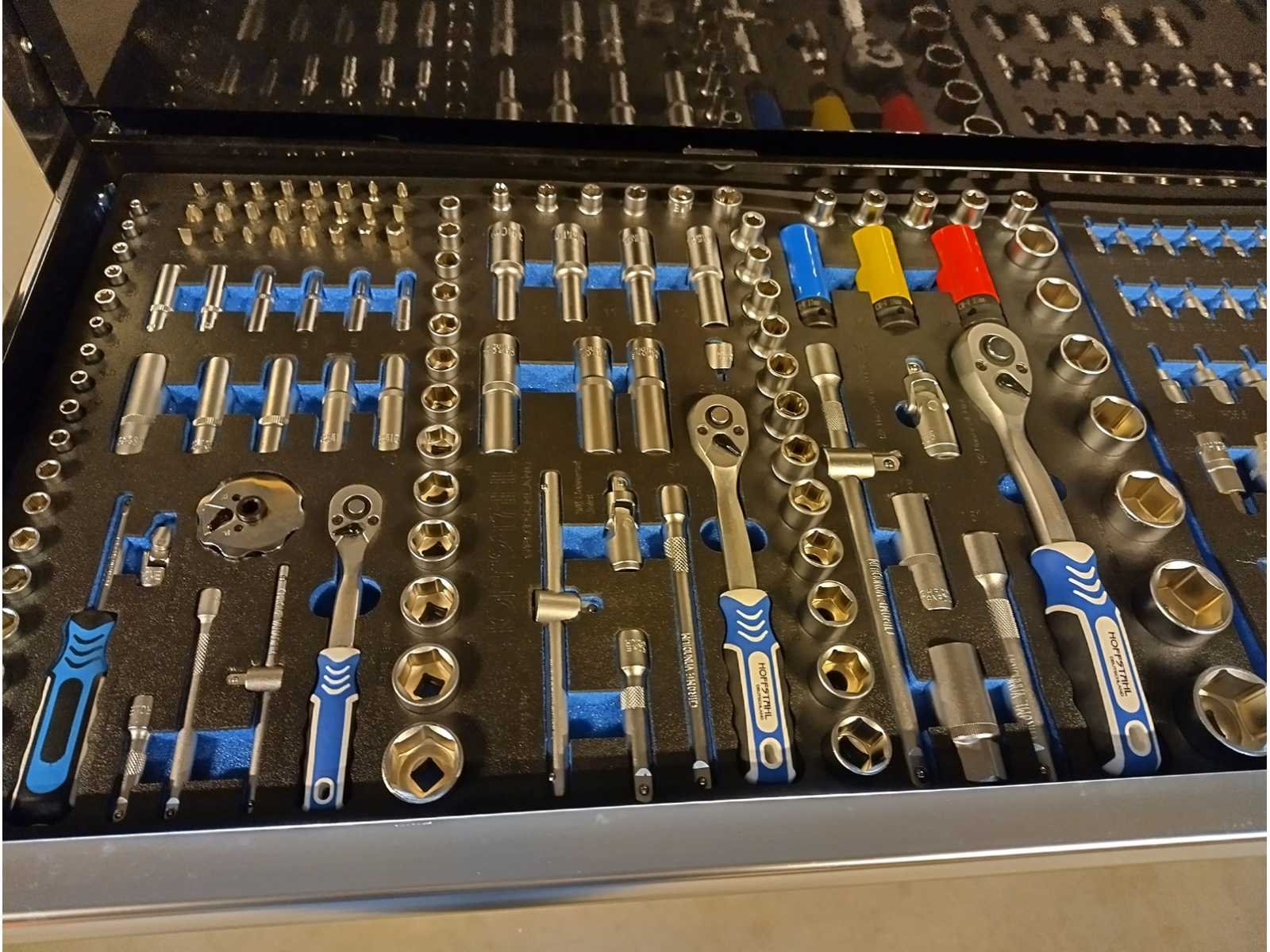 Grote zware kwaliteits gereedschapswagen met Ring Steek sleutels tot en met 50mm en Krachtdoppen tot en met 50mm. zeer uitgebreid assortiment. in doos Nee Merk: Hoffstahl Type: Profi-line 386 delige Bouwjaar: 2024 Serienummer: 11/9-24 Aantal laden: 11 Met inhoud: true Eigen gewicht: 181kg Totale afmeting L: 1370mm Totale afmeting Breedte: 540mm Totale afmeting Hoogte: 1130mm