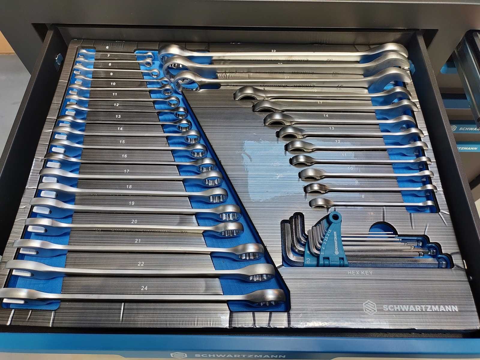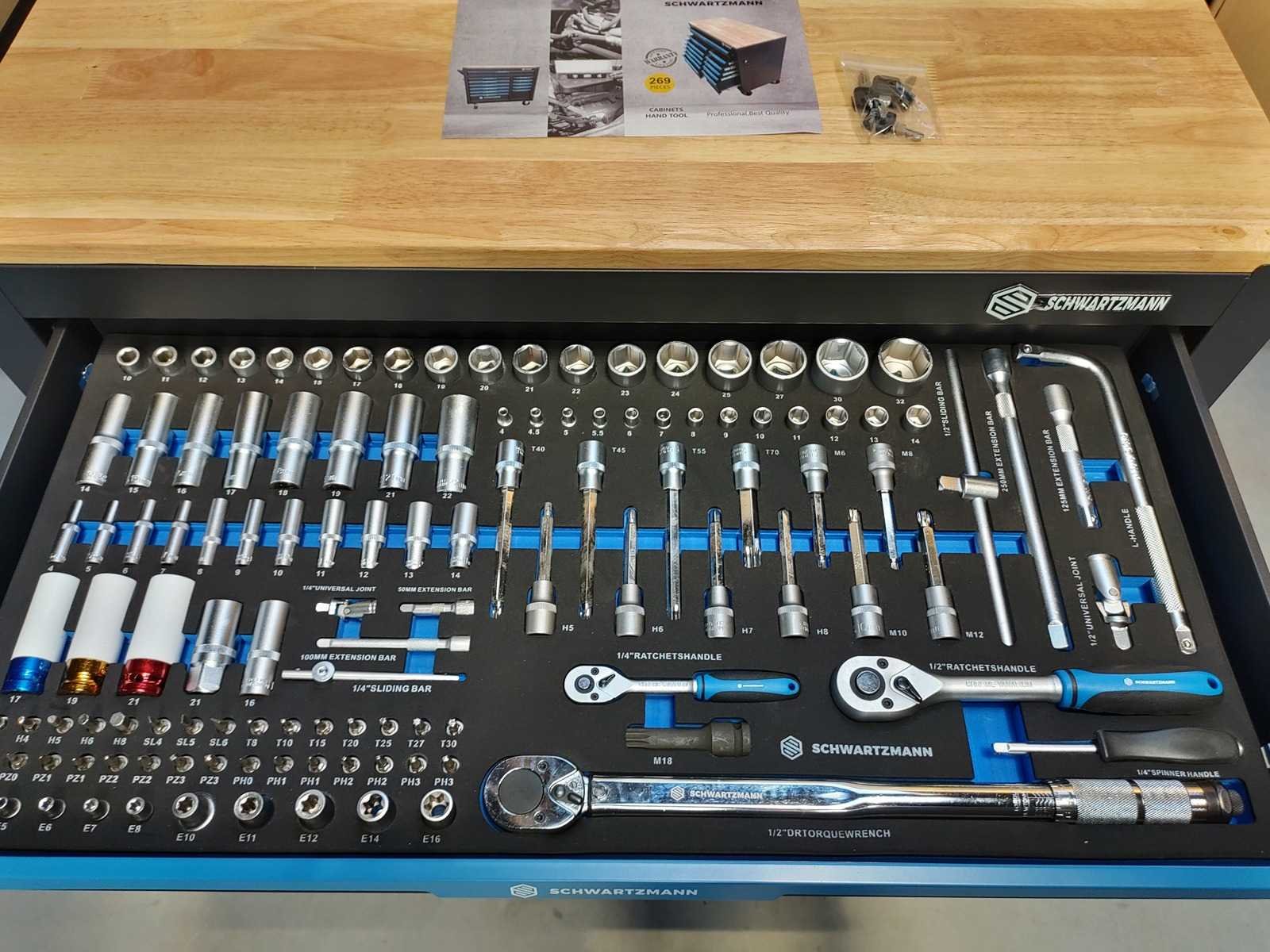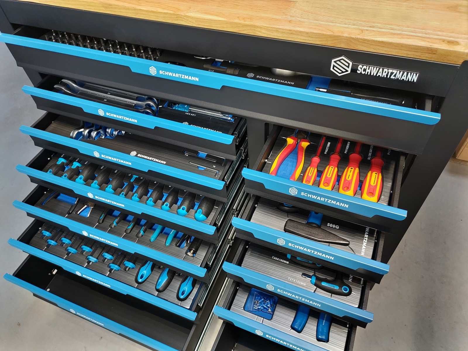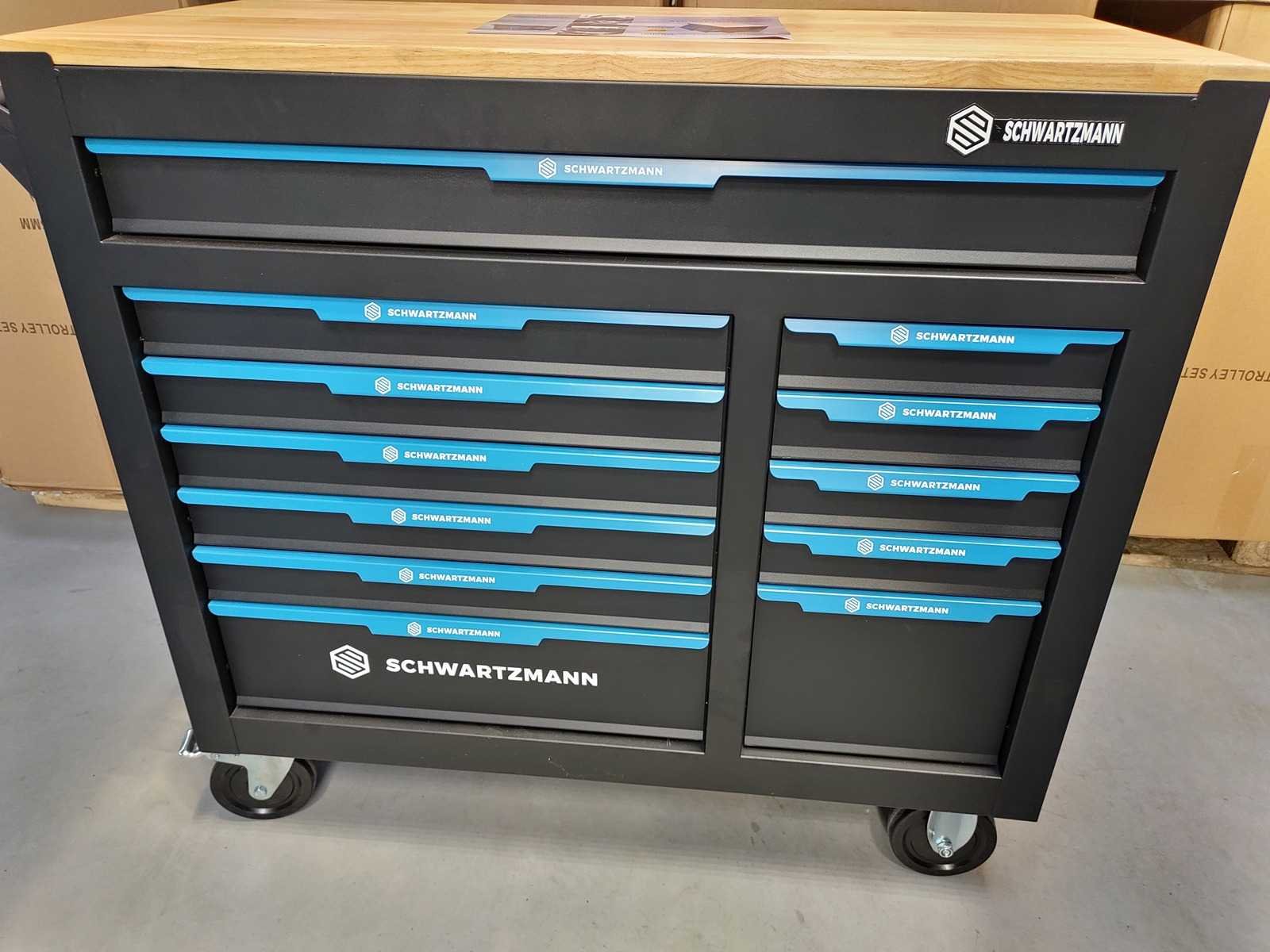 Gevulde gereedschapswagen 12 laden, XXXL Jumbo uitvoering met houten bovenblad, gevuld met kwaliteits gereedschap, nieuw in doos Nee Merk: Schwartzmann Model: 12/10