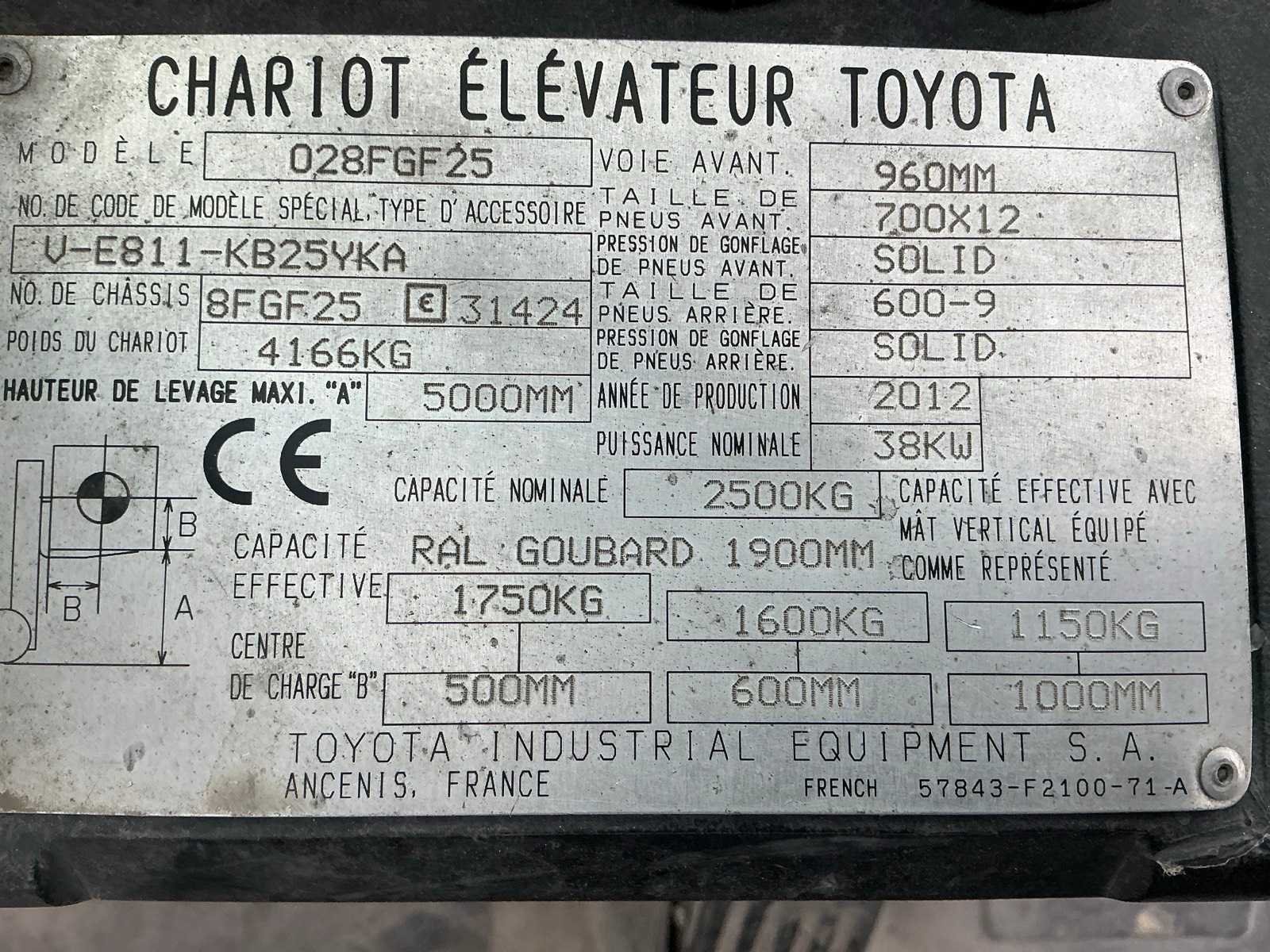 Bolzoni auramo vorkversteller met 1600 mm opening , ingebouwd weegsysteem + automatische vlak stelling Nee Merk: Toyota Type: 028FGF25 Bouwjaar: 2012 Serienummer: 8FGF2531424 Brandstof: LPG Mast: Triple Soort band: Volrubber banden Aantal wielen: 4 Afgelezen urenstand: 5120 Side-shift: true Hydraulisch verstelbare lepels: true Duplex mast: true Eigen gewicht: 4200kg Hefvermogen: 2500kg Lepellengte: 1200mm Min. hefhoogte: 0mm Max. hefhoogte: 5000mm Hefhoogte: 5000mm Vol rubber banden: true Totale afmeting L: 2900mm Totale afmeting Breedte: 1160mm Totale afmeting Hoogte: 3050mm LPG: true