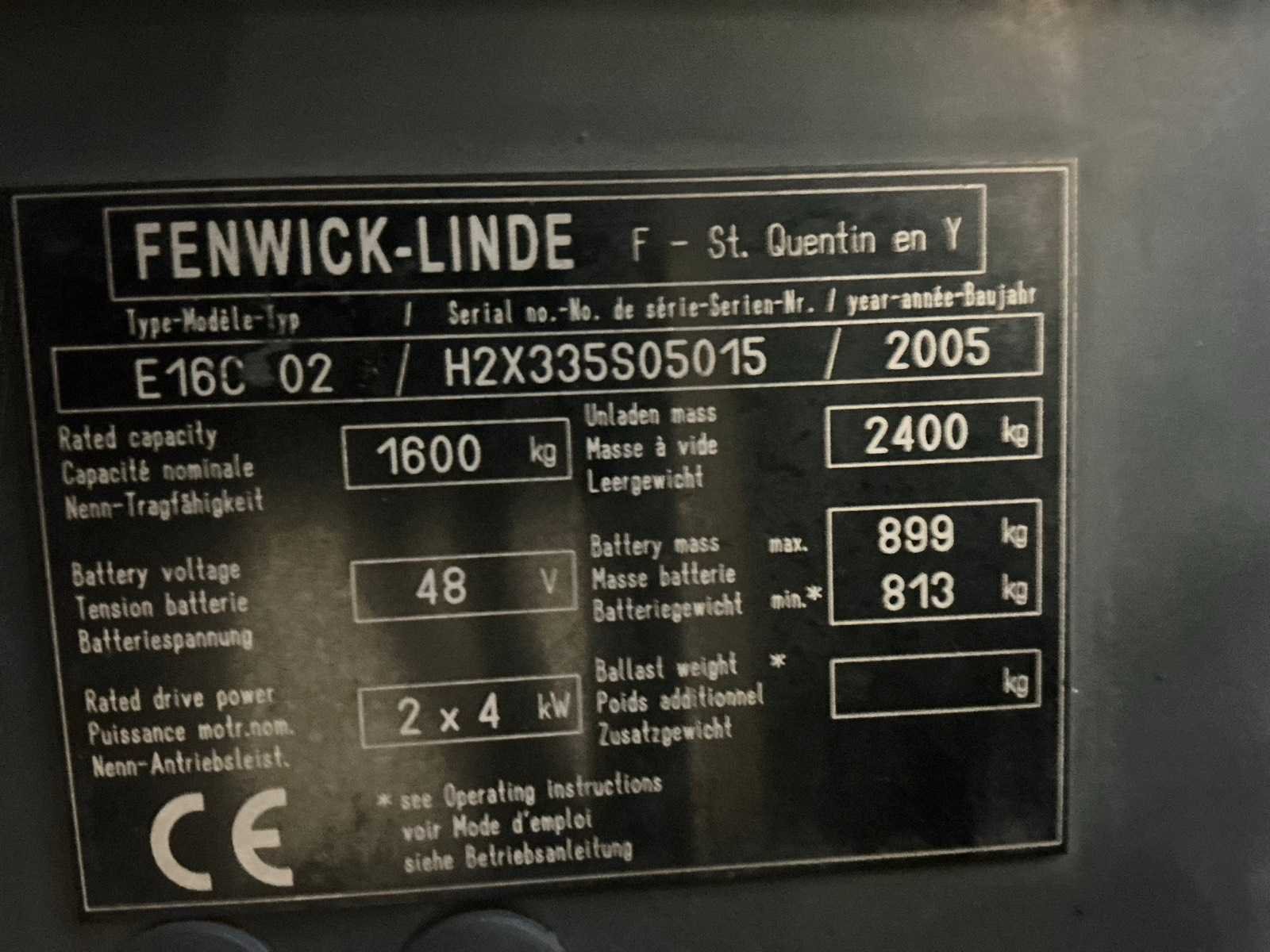 Met accu lader , mastvering , flash light , werklichten Nee Merk: Linde-Fenwick Type: E16C-02 Bouwjaar: 2005 Serienummer: H2X335S05015 Brandstof: Elektrisch Mast: Triple Soort band: Volrubber banden Aantal wielen: 4 Afgelezen urenstand: 7600 Accu lader: true Side-shift: true Triple mast: true Eigen gewicht: 3300kg Hefvermogen: 1600kg Lepellengte: 1200mm Min. hefhoogte: 0mm Max. hefhoogte: 4000mm Hefhoogte: 4000mm Vol rubber banden: true Totale afmeting L: 1900mm Totale afmeting Breedte: 1100mm Totale afmeting Hoogte: 2120mm