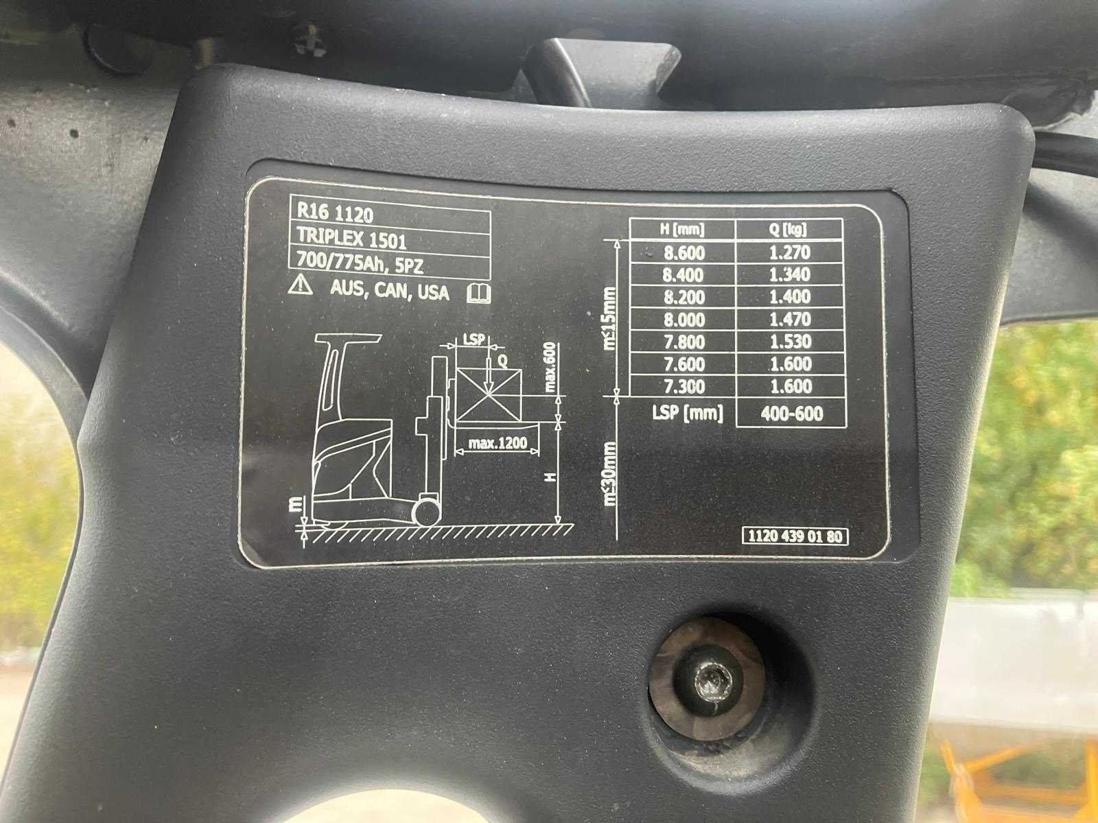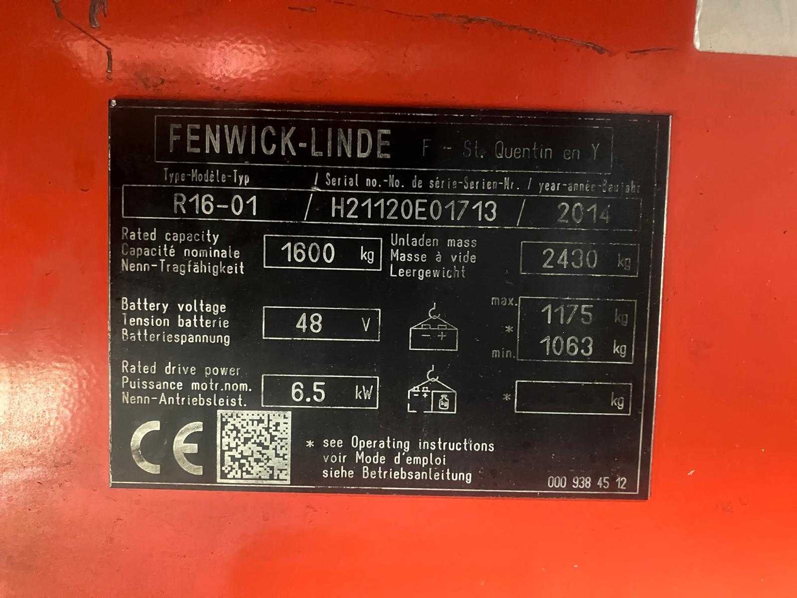 48V batterij No Merk: Linde Type: R16-01 Bouwjaar: 2014 Afgelezen urenstand: 2255 Side-shift: true Triple mast: true Eigen gewicht: 2430kg Hefvermogen: 1600kg Lepellengte: 1100mm Hefhoogte: 8300mm Totale afmeting Hoogte: 3500mm Elektrisch: true