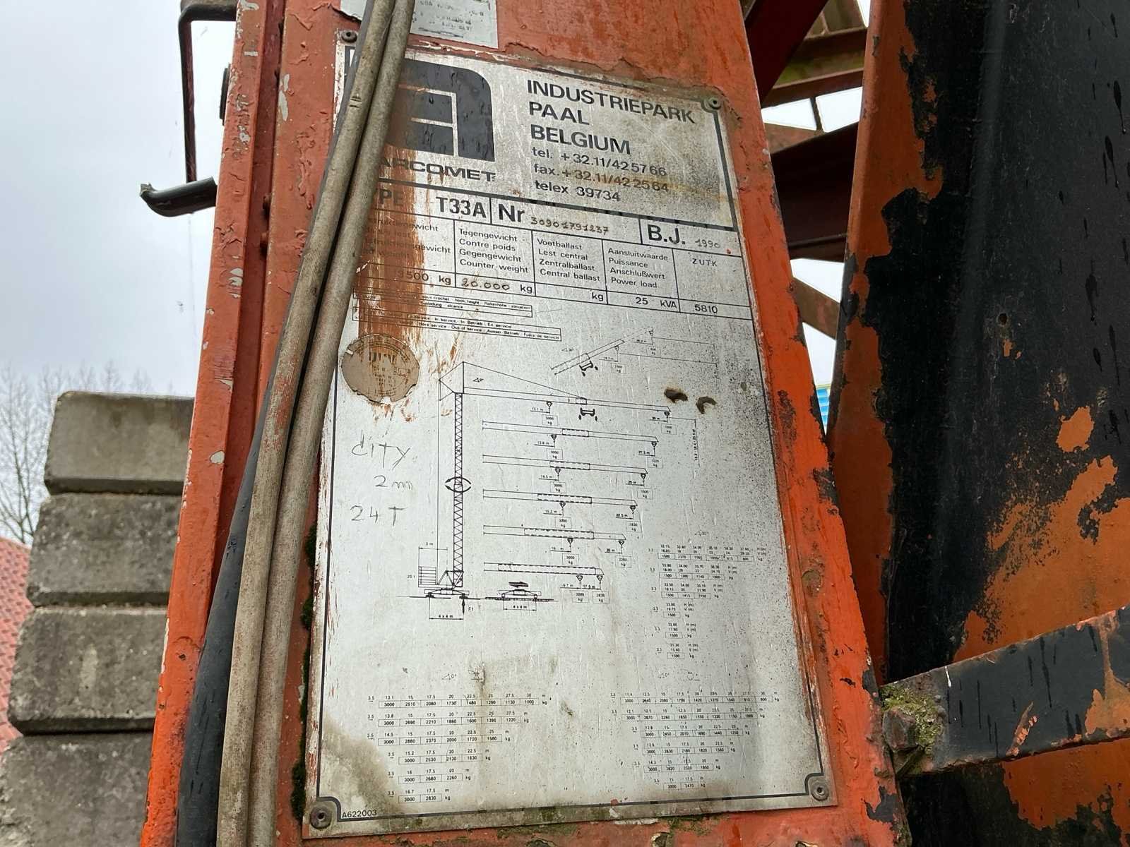 No Merk: Arcomet Type: T33A Bouwjaar: 1990 Max. hijscapaciteit: 3000kg Gieklengte: 30m Max. hijshoogte: 23m Met radiografische afstandsbediening: true