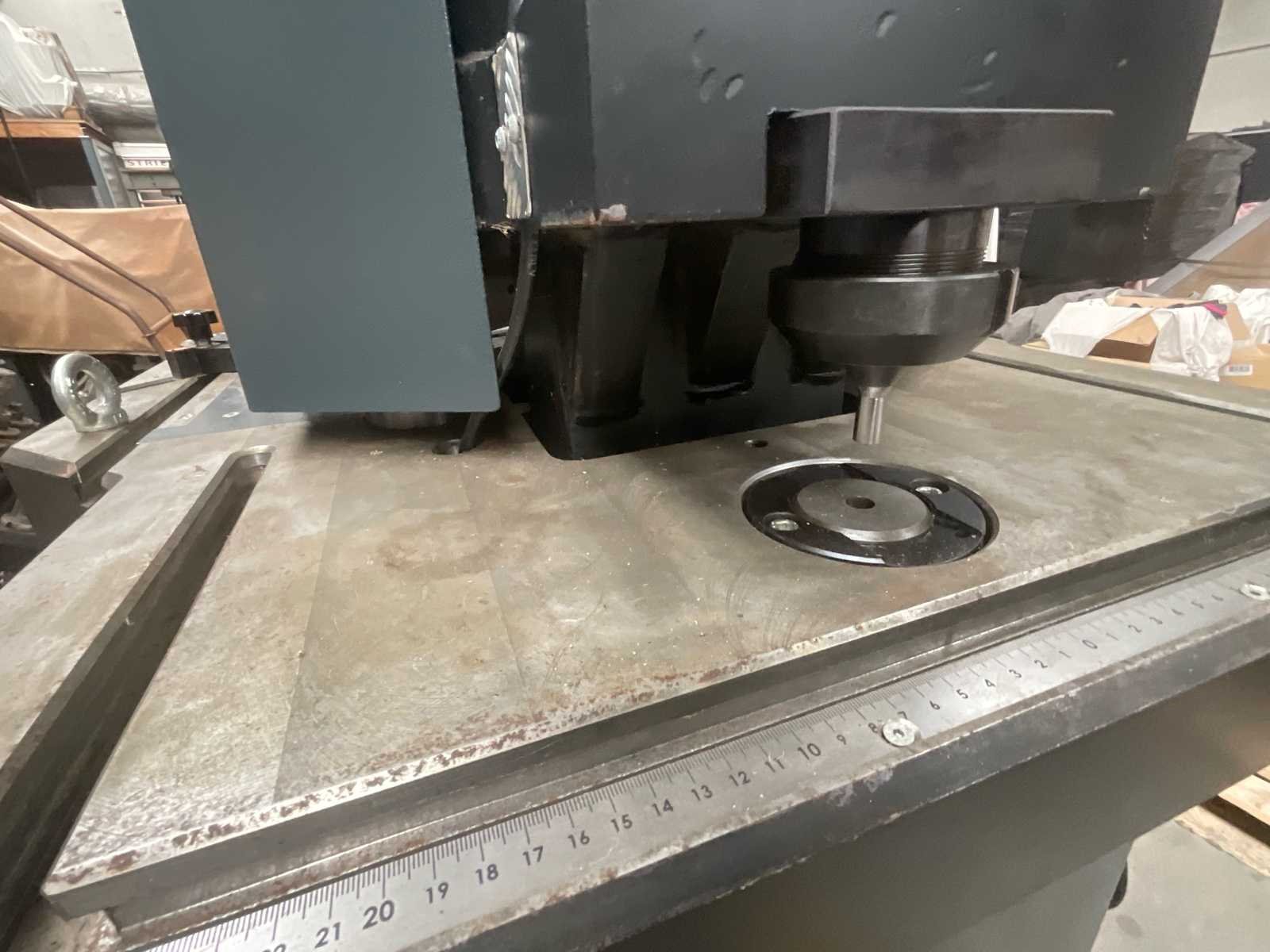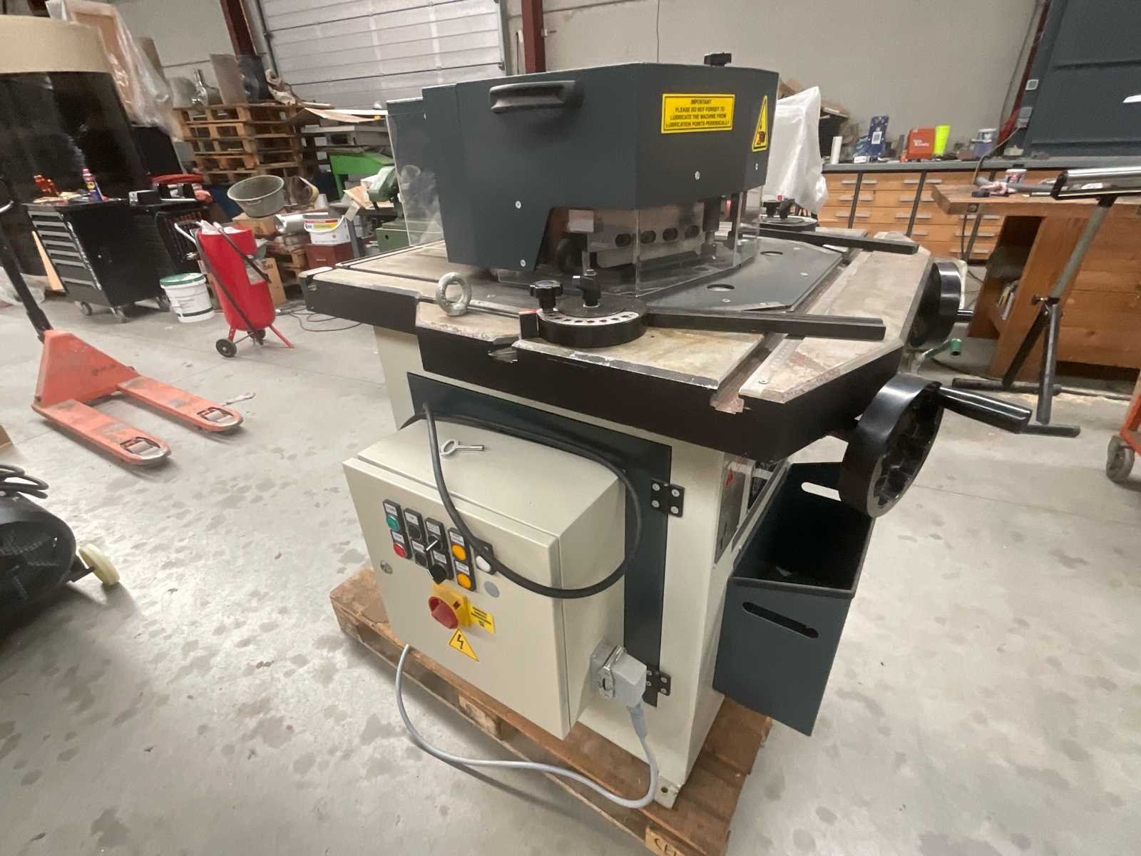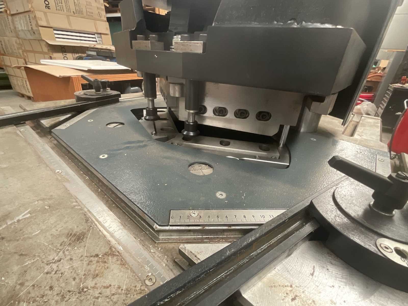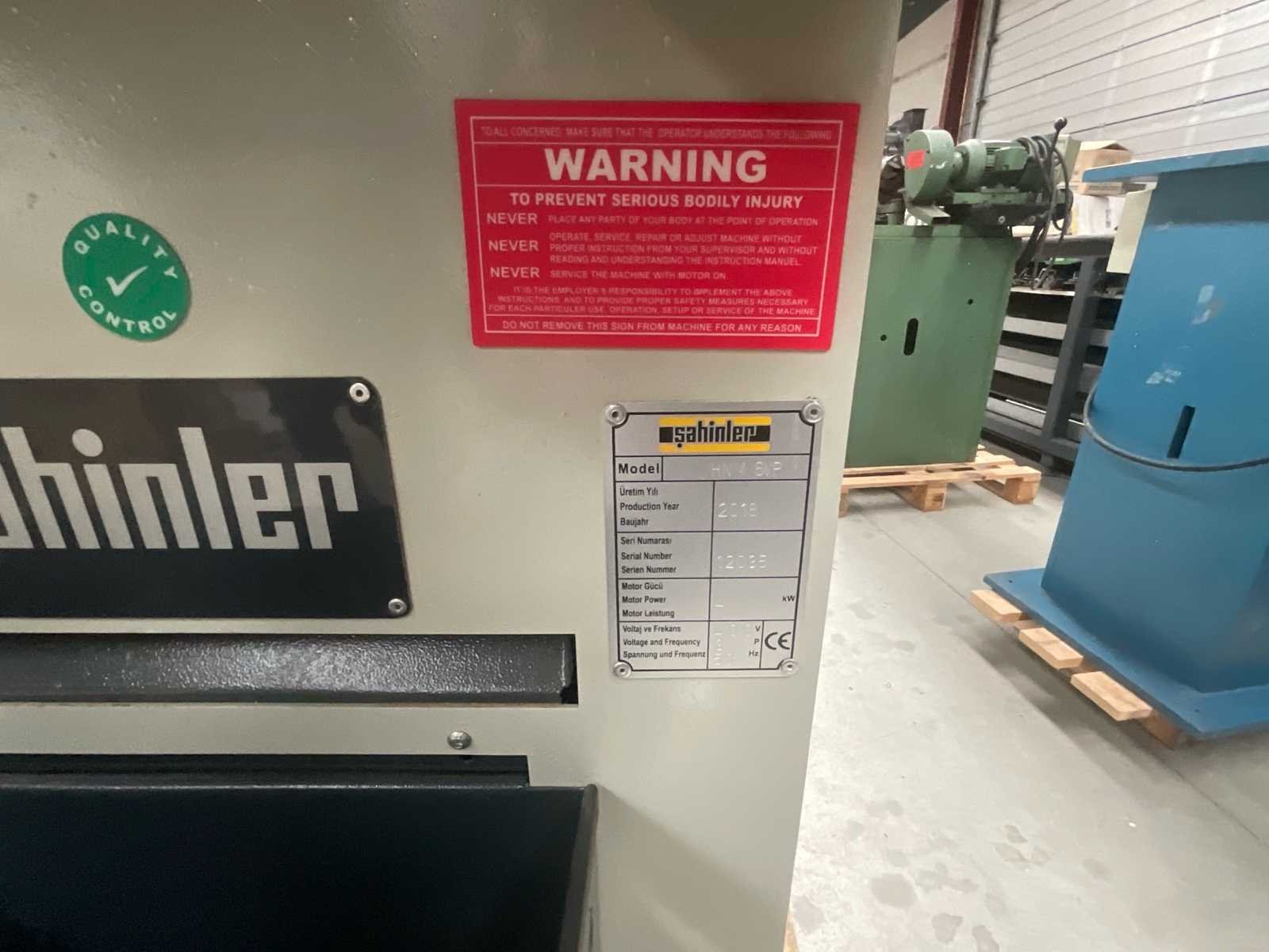 Set van twee professionele Sahinler plaatmetaalmachines, uit 2018, in zeer goede algemene staat. 1. Sahinler HPM 65 B/P hydraulische ponsmachine Stootkracht: 65 ton Maximale capaciteit: Ø 40 mm in 12 mm zacht staal Cilinderslag: 60 mm Keeldiepte: 625 mm Motor: 5,5 kW – 400 V driefasig Bediening: voetpedaal Tafel met verstelbare registers Druppelbak en verwisselbare pons-/matrijssets Gewicht ca. 1.100 kg 🔹 Arabisch cijfer. Sahinler HNM 6VP hydraulische inkerfmachine Snijcapaciteit: tot 6 mm zacht staal / 4 mm roestvrij staal Variabele snijhoek: 30° tot 140° Hoekaanpassing met micrometrische handwielen Tafel uitgerust met verstelbare registers en geleidingen Voetpedaalbediening + noodstop Motor: 4 kW – 400 V driefasig Gewicht ca. 850 kg Geïntegreerde schrootbak No Merk: Sahinler Bouwjaar: 2018