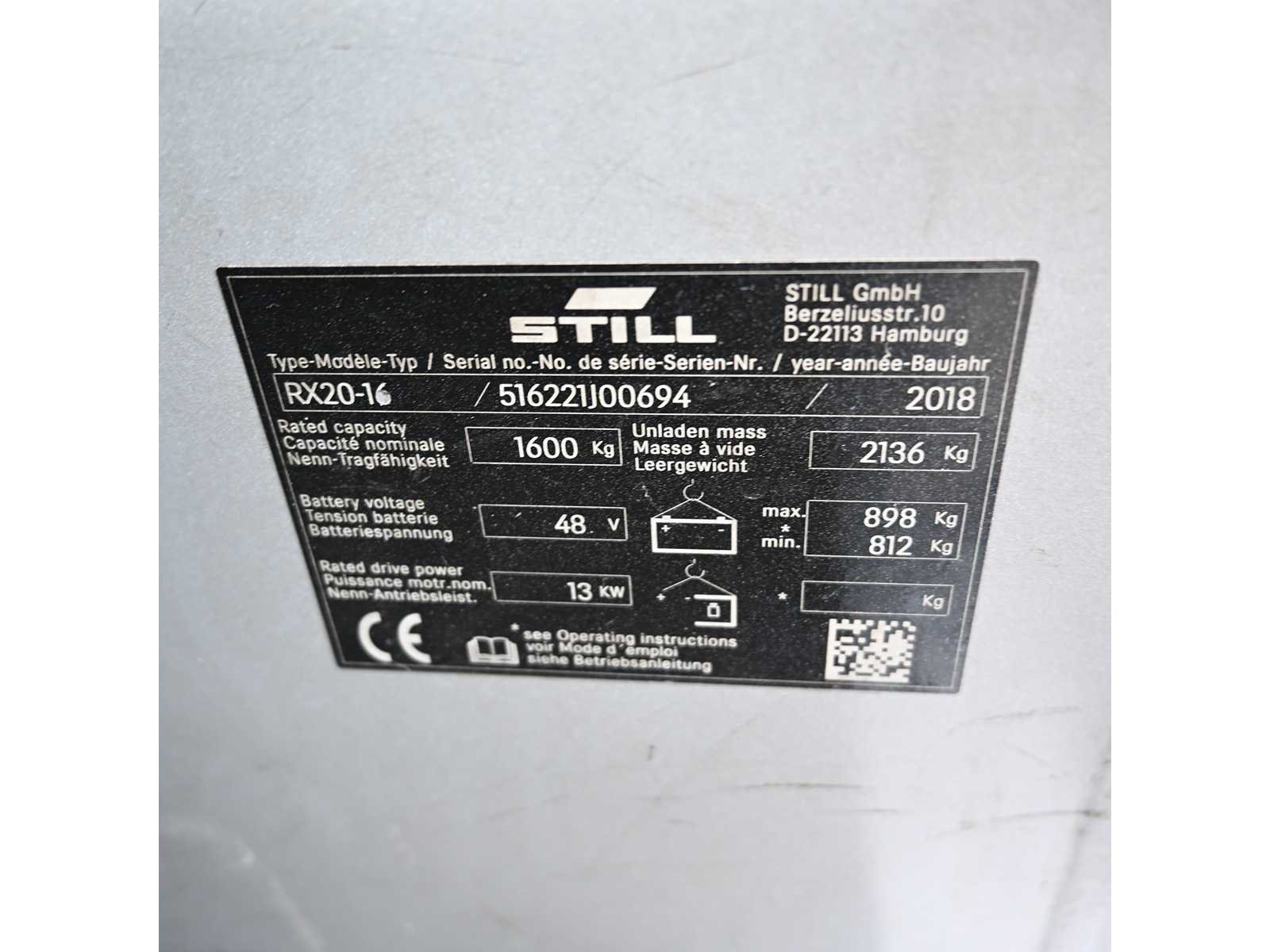 Still RX20-16 Elektrische heftruck - 2 delige duplex mast - Free lift - Side shift No Merk: Still Type: RX20-16 Bouwjaar: 2018 Serienummer: 516221J00694 Brandstof: Elektrisch Mast: Duplex Soort band: Vol rubber Aantal wielen: 3 Afgelezen urenstand: 7547 Free-lift: true Side-shift: true Duplex mast: true Hefvermogen: 1600kg Hefhoogte: 3350mm Vol rubber banden: true Minimale doorrijhoogte: 2150mm Leveringsvoorwaarden: Geladen op vrachtwagen